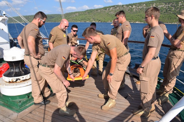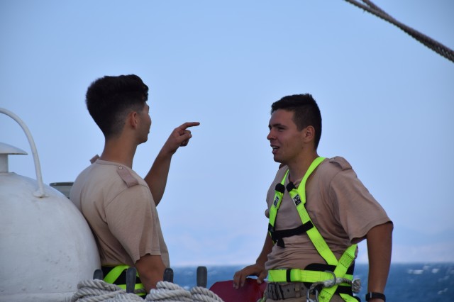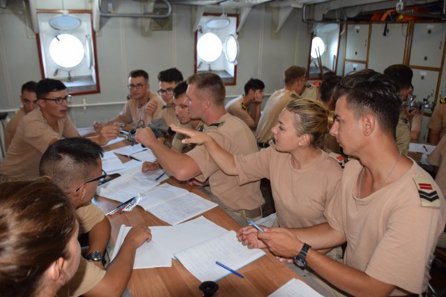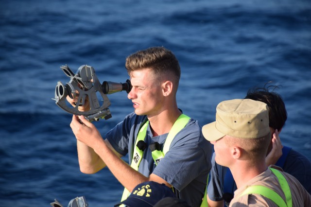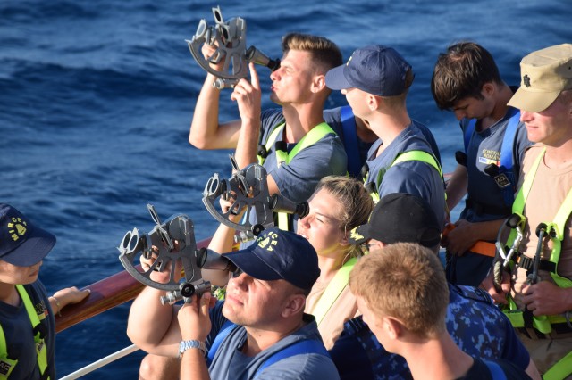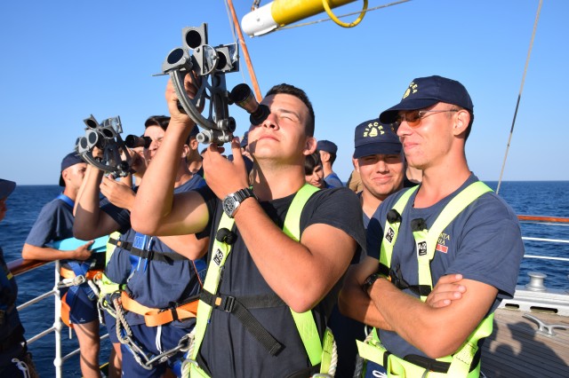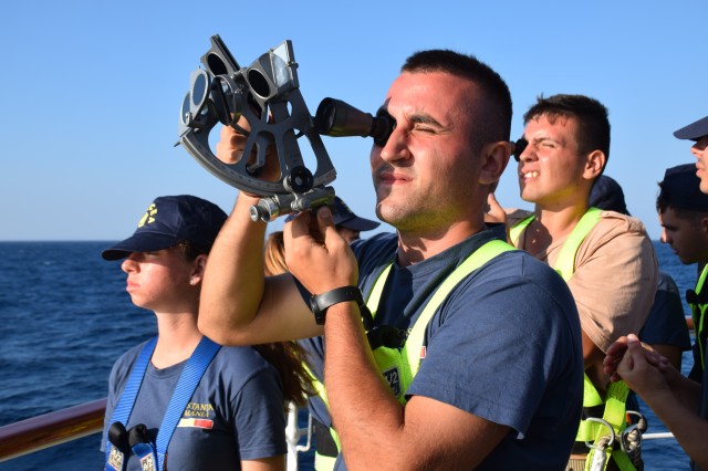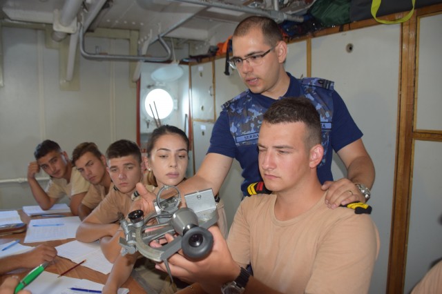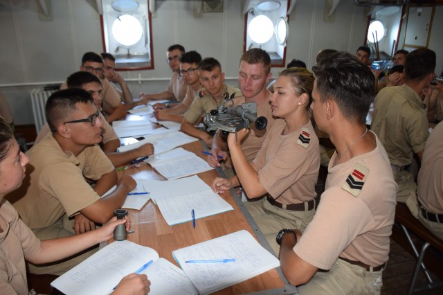 Continuă studiul şi practica la bord. Prima parte a dimineţii i-a găsit pe cadeţii noştri în cazarmă, devenit rapid un „amfiteatru” plutitor prin coborârea meselor şi băncilor. Obiectul lecţiei de azi? Descoperirea sextantului un instrument de navigaţie vetust ar putea spune unii azi dar prezent aici la bordul N.Ş.Mircea şi descoperit şi utilizat de fiecare generaţie de studenţi. Profesor? Acelaşi căpitan Sergiu Şerban care ne declara că indiferent dacă poate nu se vor mai întâlni niciodată cu sextantul în cariera lor, viitorii ofiţeri de marină trebuie să ştie navigheze şi fără ajutorul tehnologiei actuale fie că se numeşte GPS, AIS, radar, etc.Şi unde poţi deprinde cel mai lesne tainele navigaţie clasice decât la bordul unui velier? Dar azi doar s-au familiarizat cu sextantul, este un instrument complex, necesită multe calcule, vor mai trece câteva săptămâni până vor ajunge să-şi găsească drumul măsurând soarele sau stelele. De remarcat şi preocuparea comandantului navei şi a Academiei Navale „Mircea cel Bătrân” de a ameliora confortul din cazarma care le este şi dormitor, şi sală de mese dar şi de studiu, prin amplasarea unor aparate portabile de aer condiţionat care nu rezolvă problema (mai ales că de acum încolo va fi din ce în ce mai cald) dar induc o anumită „briză” de confort.