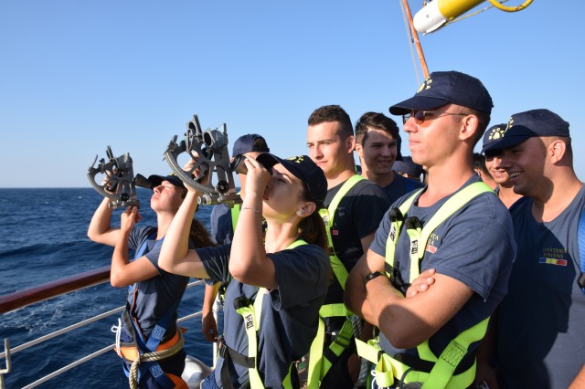 Continuăm să navigăm cu vele cu o viteză de opt noduri în albastra Mare Egee. Am trecut de insula Limnos, am intrat în Arhipeleagul Insulelor Sporade, am lăsat în siaj şi insula Skyros iar mâine o să depăşim şi strâmtoarea Kafirea. La pupa cadeţii români continuă să înveţe lucrul cu sextantul, de data aceasta sunt la partea practică după noţiunile teoretice de dimineaţă. Superbă imaginea cu mulţimea de cadeţi care aglomerează spaţiul de la pupa aşteptându-şi rândul la măsurarea cu sextantul în lumina blândă a apusului sub îndrumarea răbdătorului căpitan Sergiu Şerban care timp de câteva ore nu a contenit să ofere explicaţii în două limbi. La finalul lecţiei toţi caută soarele prin lentilele sextantului, care şi-a mai domolit căldura, fiind echipaţi în continuare cu centurile de siguranţă aşa cum au fost toată ziua şi aşa cum vor dormi şi la noapte în hamace pentru că trebuie să fie gata oricând să urce în arboradă.