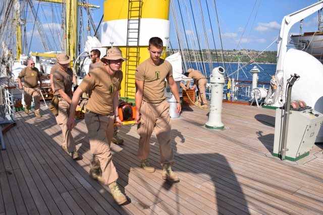 Pe puntea dunetă maistrul militar clasa a II-a Marian Vârlan înlocuieşte o macara (nu este nici o macara aşa cum o cunoaştem cu toţii ci denumirea unui echipament, un fel de scripete dacă vreţi din arsenalul manevrelor curente şi al arboradei). Ca o paranteză, încerc să nu abuzez de termenii marinăreşti pentru a nu plictisi pe cei din afara profesiei şi pentru a nu transforma corespondenţa în dicţionar de marină dar uneori, nu se poate evita. Ceea ce vreau să subliniez este că la N.Ş. Mircea se munceşte cel mai mult şi tot timpul, mai ales în marşurile de instrucţie. De aceea în unele fotografii puteţi observa de exemplu la banchetul de la pupa (nu e vorba de nici o petrecere este doar banca de lemn de la pupa navei), cum pe o parte cadeţii studiază sextantul iar pe cealaltă parte caporalul Lucian Ţăranu o lăcuieşte (la 50 de ani are o poveste interesantă - din 2007 a participat la aproape toate marşurile de instrucţie detaşat de la altă unitate, în 2008 atrebuit să treacă în rezervă după vechea lege, reangajat în 2010 iar din 2015 a reuşit să ajungă în echipajul permanent - şi este decanul de vârstă al soldaţilor gradaţilor profesionişti de la bordul navei, o să aibă norocul să-şi sărbătorească ziua de naştere la o zi după ce revenim în ţară, observator-semnalizator după funcţia pe care o ocupă dar fapt irelevant la N.Ş. Mircea unde toţi membrii echipajului muncesc la întreţinerea aspectului marinăresc al navei). Toate activităţile se derulează pe fundalul lucrărilor de întreţinere, piturare, lăcuire, curăţare, înlocuire manevre curente, etc. Aşa că şi în această zi de navigaţie cu vele sunetul marţagonului (ciocanul specific cu ajutorul căruia este îndepărtată rugina şi vopseaua veche) a răsunat pe întreaga navă. Pe maistrul militar clasa a II-a Marian Vîrlan l-am cunoscut în marşul din anul 2015 dar se află pe navă de aproape zece ani. Este cel care mă însoţea în arboradă, poate şi datorită constituţiei atletice, continuă să facă acelaşi lucru şi acum cu cei care nu sunt încadraţi în echipajul de bază. De fapt este specialist observare radioelectronică şi este şeful manevrei pupa, un om pasionat de meserie, de navă şi marinărie. Tăcut în general devine generos atunci când îţi oferă explicaţii despre navă. La 49 de ani împliniţi cu o săptămână înainte de plecare (norocosul!) este un om de bază care face parte din a treia generaţie de maiştri militari cu vechime de la bordul N.Ş. Mircea de după 1990.