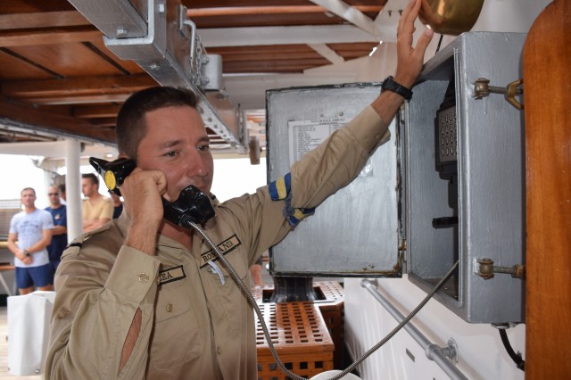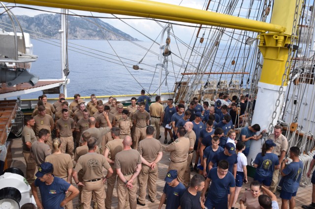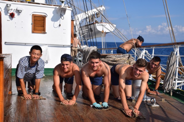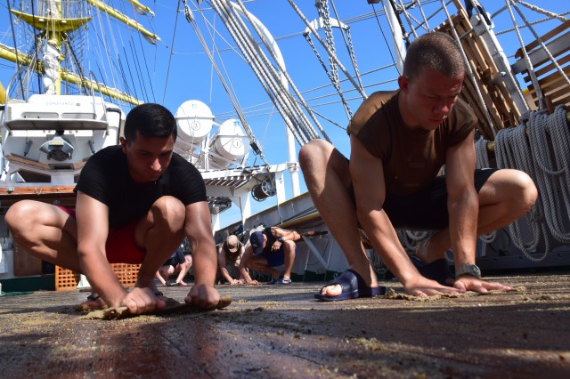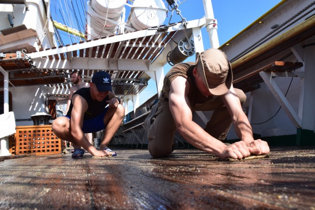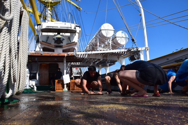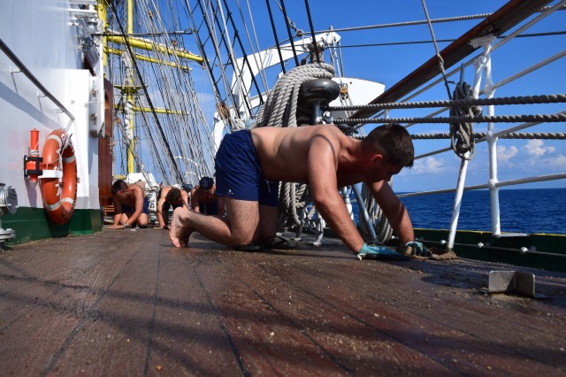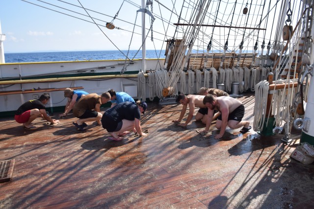 Este weekend, vreme frumoasă, 26-27 de grade şi 65% umiditate în aer, aşadar condiţii perfecte pentru... prima bricuire a punţilor exterioare. Azi dar şi mâine are loc curăţenia pe navă înainte de intrarea în primul port de escală, Durres din Albania. Ingrediente: nisip, bucăţi de tendă (este vorba de bucăţi de pânză groase în cazul de faţă provenite din vechile vele vegetale ale navei în prezent fiind echipată cu vele sintetice), apă şi multă sudoare şi efort din partea cadeţilor care execută tradiţional această muncă la bordul navei, sub conducerea şi supravegherea membrilor echipajului. Operaţie precedată la puntea centru de spălarea şi curăţarea tuturor grătarelor de lemn de pe navă. Participă toţi cadeţii, români, germani sau din spectrul internaţional amintit în corespondenţele anterioare, în ţinuta adecvată, adică şort, papuci, cei mai mulţi la bustul gol, mai puţin fetele, evident. Unii cu entuziasm, alţii doar pentru că trebuie făcută, unii sunt chiar apatici. Pe puntea dunetă, la pupa, cadetul chinez Dazhou Lan aflat într-o echipă mixtă cu cadeţi români nu prea reuşea să ţină pasul cu colegii, brusc motivaţi la vederea aparatului de fotografiat. La puntea centru însă poloneza Alicja Zejmo, ajutată şi de constituţia mai mult decât atletică, izbutea în mod constant să-şi lase în urmă colegii. Bricuirea este o muncă destul de grea, cea mai mare parte executată stând în genunchi, care constă în curăţarea prin frecare a punţilor exterioare cu nisip şi o bucată de tendă. Dar cadeţii au şi tinereţea de partea lor aşa că până la masa de prânz operaţia este executată pe toate cele trei punţi. În a doua parte a zilei se continuă curăţenia pe navă, inclusiv la interior.