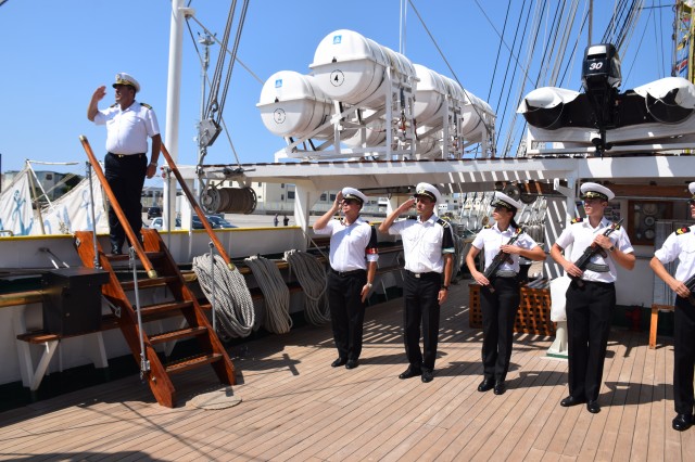 Sunt convins că mulţi dintre dumneavoastră sunt curioşi în legătură cu această formulă mixtă româno-germană, cadeţi şi instructori şi au nedumeriri legate de exemplu de limba în care se dau ordinele la bord, dacă există un singur program de practică sau sunt diferenţiate pe naţiuni şi aşa mai departe. O să încerc să răspund la câteva dintre aceste întrebări. După cum ne declara comandorul Gabriel Moise, comandantul marşului şi al Divizionului 306 Nave Şcoală Instrucţie, cea mai mare parte a activităţilor de la bord se desfăşoară în mare parte în comun. Cazarea este aceeaşi pentru toţi cadeţii, respectiv în cele două cazărmi, una pentru băieţi, una pentru fete, unde toată lumea doarme în hamac. De asemenea, cu toții fac aceleași servicii, grupe la bucătărie, sectoare de curăţenie, plantoane, veghe prova şi pupa, responsabilităţile şi îndatoririle fiind împărţite în mod egal. Chiar şi numărul cadeţilor este aproximativ egal, 38 de români şi 32 de germani, la care se adaugă cei 12 cadeţi din şase ţări.