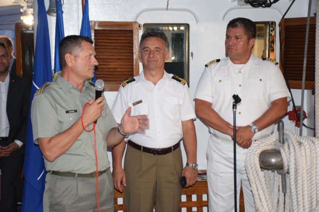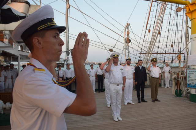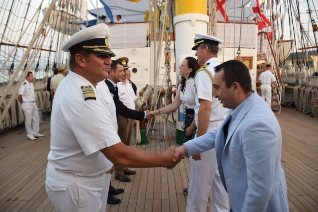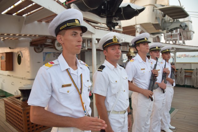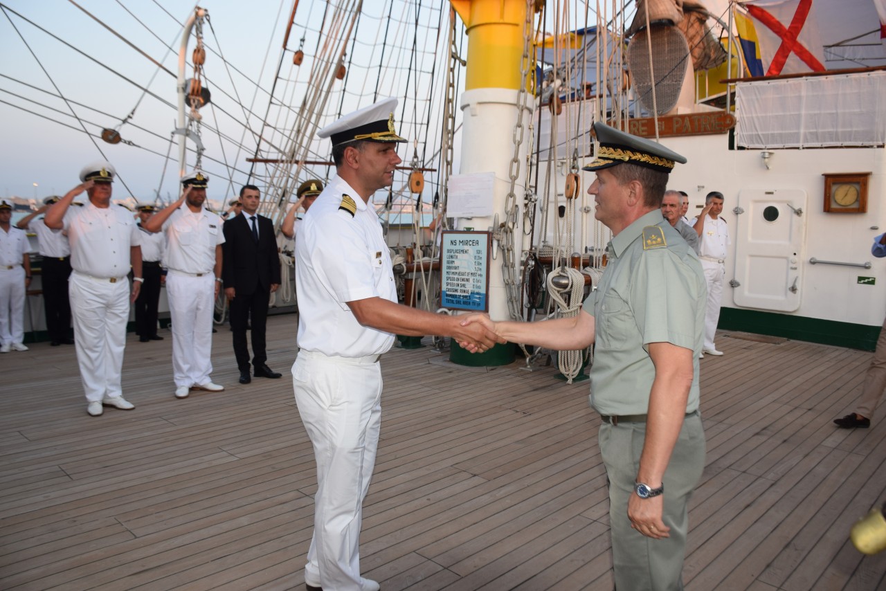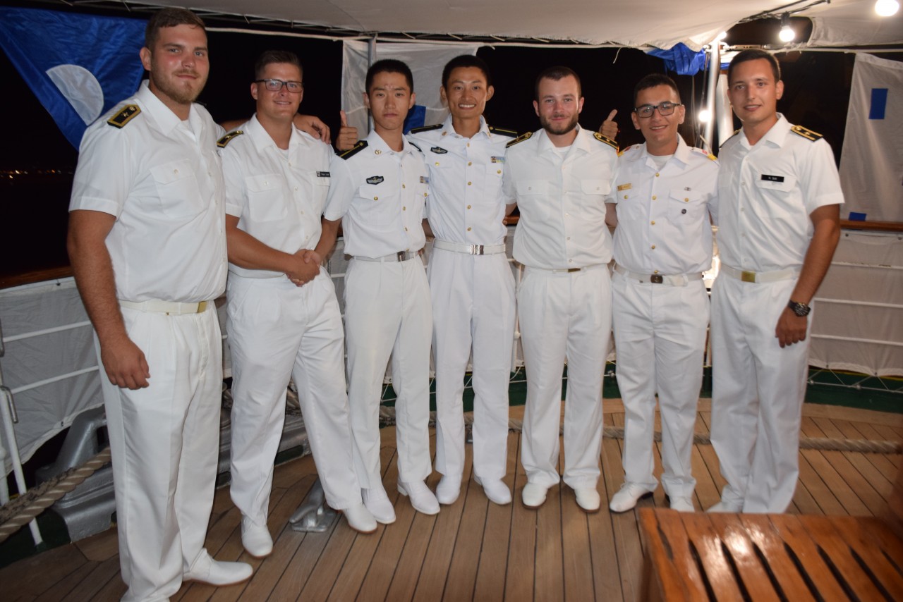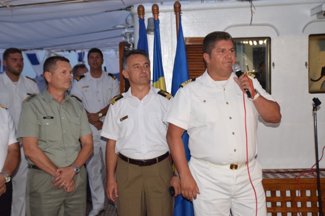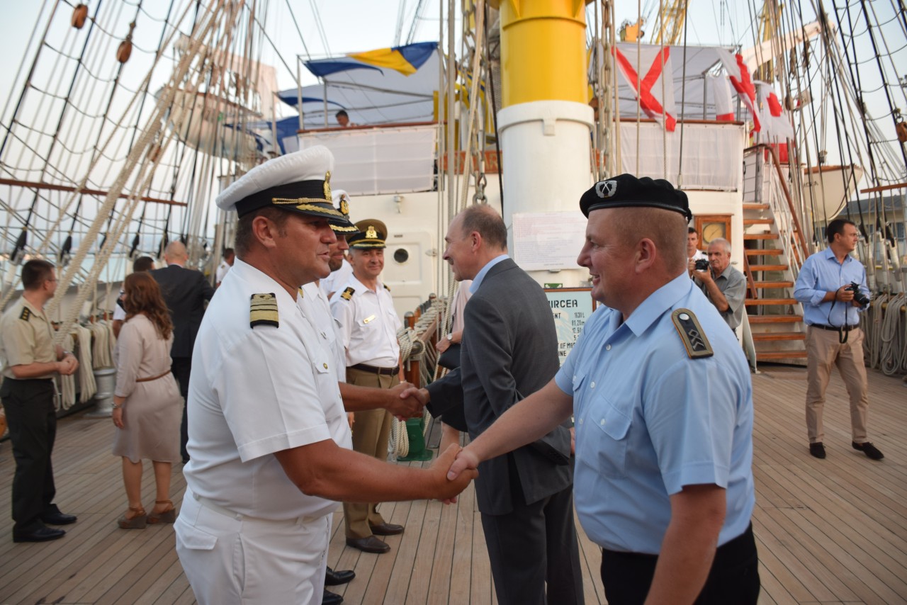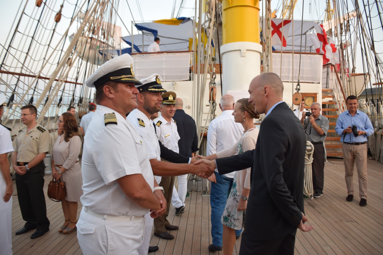 Au vorbit în deschidere colonelul Florin Ţuţuianu, comandorul Gabriel Moise, locotenent-colonelul Hans Peter Wamsler, ataşatul amilitar al Germaniei, iar din partea gazdelor a răspuns generalul de brigadă Nazmi Cahani. Dar sarea şi piperul recepţiei, care a surprins în mod plăcut invitaţii, au fost mini-recitalurile de cântece marinăreşti susţinute de cadeţii români şi străini de la bord. Rând pe rând, s-au perindat pe la microfon cadeţii din Bulgaria, China, Polonia, Marea Britanie şi la sfârşit corul cadeţilor români, aplaudaţi generos de către asistenţă. O idee foarte bună care a „încălzit” rapid atmosfera şi a facilitat socializarea, ieşind puţin dacă vreţi din tiparele oficiale. Mai mult, a fost elementul specific marinăresc – până la urmă recepţia se desfăşoară pe o navă, şi nu pe orice navă, ci pe un velier.
