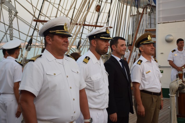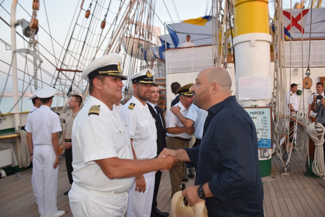Ultima zi de escală la Durres a fost şi cea în care bătrânul nostru velier şi-a îndeplinit, şi aici, cu succes cea de a doua misiune, după cea de instruire a cadeţilor, şi anume cea de ambasador al României pe mările şi oceanele lumii. Cu alte cuvinte, diplomaţie navală. Cum? Prin recepţia oficială organizată la bord în fiecare port şi la care au participat peste 80 de persoane, în afară de membrii echipajului. Aminteam de diplomaţie navală pentru că majoritatea invitaţilor au fost din corpul diplomatic al ambasadelor din capitala ţării, Tirana. Energicul şi inimosul ataşat al apărării de la ambasada noastră – l-am numit aici pe colonelul Florin Ţuţuianu - a reuşit performanţa de a aduce la bord nu doar pe foarte mulţi dintre colegii săi ataşaţi militari, dar şi ambasadori sau alţi reprezentanţi diplomatici.