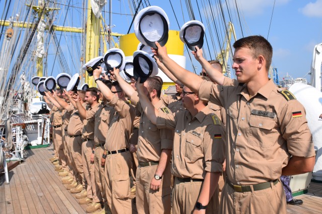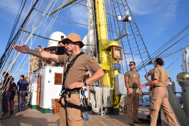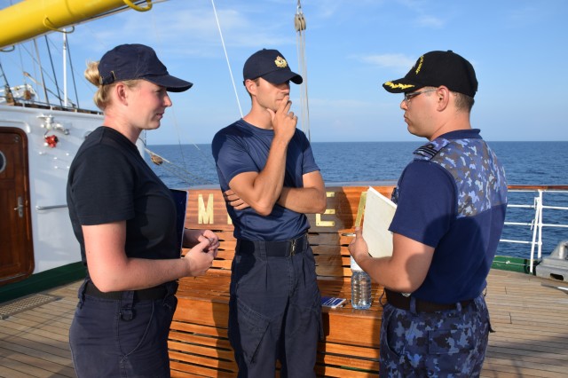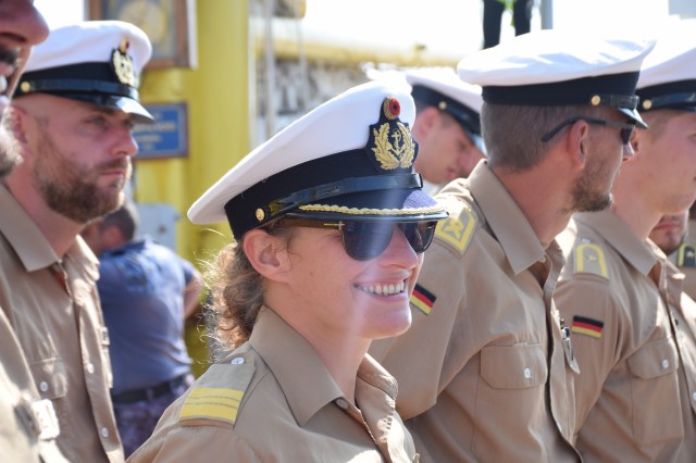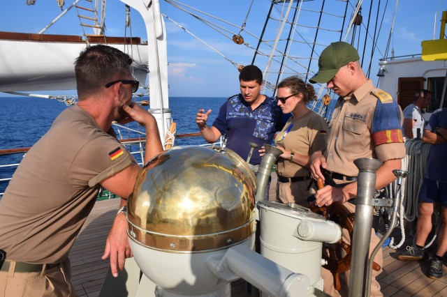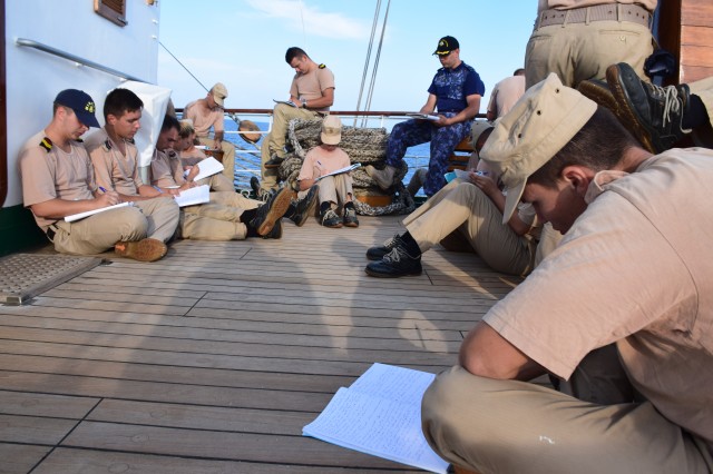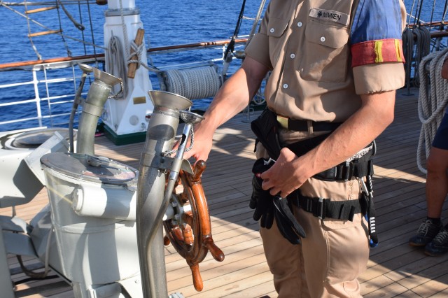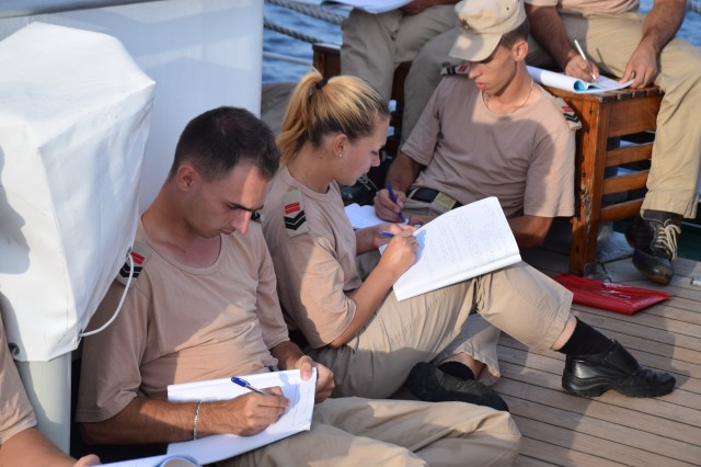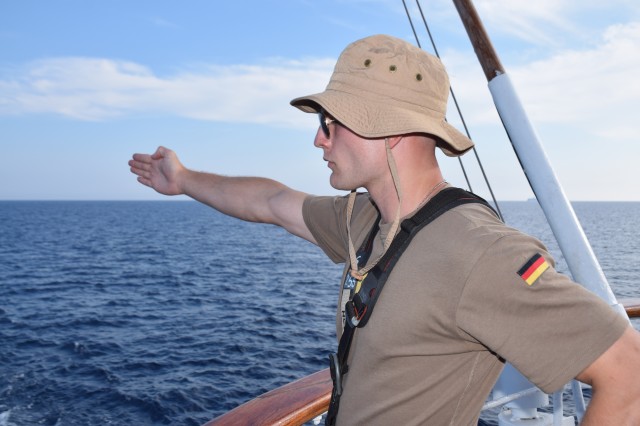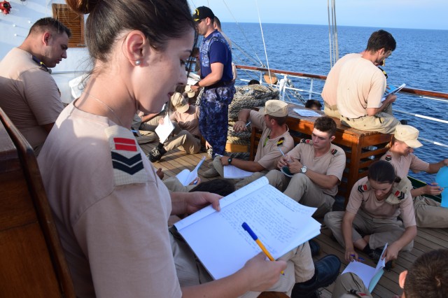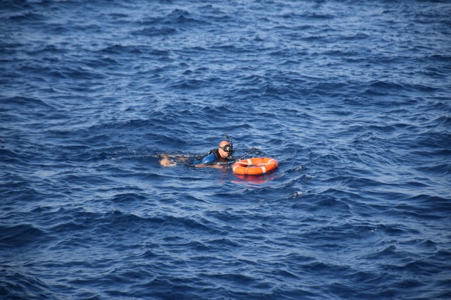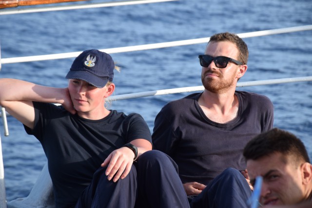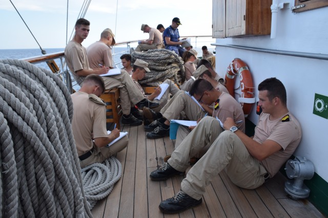 Urmează un exerciţiu de om la apă şi la solicitarea comandantului navei, comandorul Mircea Târhoacă, acesta va fi executat şi condus de către partea germană. Chiar dacă procedurile sunt aceleaşi, suntem curioşi să vedem cum se descurcă colegii noştri germani. Toţii cadeţii români sunt adunaţi la pupa sau urcaţi pe puntea etalon de deasupra comenzii, unde căpitanul Sergiu Şerban le explică deja etapele exerciţiului. Pe puntea dunetă, ofiţerul german de cart căpitanul Bettina Ludwig împreună cu aspirantul Enrico Stieber şi cadetul Luca Mennen la timonă (înainte de a fi cadet a fost în marina germană așa că este familiarizat cu timona) sunt gata de acţiune. Cartul de navigație este asigurat de cadetul Marcus Uellner, iar la veghea pupa e Tim Zerull. Așadar, o echipă 100% germană supravegheată totuși discret de comandantul navei, comandorul Mircea Târhoacă, de secund, căpitanul Florin Albici, și locotenentul Atilla Bokor, comandant grup de luptă comunicații și informatică, dar acum ofițer de cart. Surpriza totală pentru noi a fost că nu au folosit manechinul Oscar, ci chiar căpitan-comandorul Christian Riechelmann, şeful delegaţiei germane, a sărit în apă la puntea centru, echipat cu vizor şi tub, atunci când nimeni nu se aştepta. Se dă alarma, se aruncă un colac de salvare de la bord, cadeţii germani de la veghe pupa şi de pe puntea dunetă strigă puternic arătând, în permanenţă cu mâna întinsă, direcţia unde se află omul căzut în apă. Nava execută manevra de întoarcere, un rondou perfect, bombardul este lăsat la apă, recuperează „naufragiatul”, care este ridicat la bord cu ajutorul gruiului (instalația cu care este coborât și bombardul la apă). Om salvat, exercițiu reușit! Mai târziu căpitan-comandorul Riechelmann mi-a explicat că, și în marina germană, la începutul pregătirii cadeților se folosește Oscarul. Mai târziu, pe măsură ce pregătirea evoluează, după multe astfel de exerciții derulate în toate condițiile și situațiile, Oscarul este înlocuit de o persoană, tocmai pentru a conferi dinamism și realism în astfel de momente. După exercițiu, la pupa, căpitanul Sergiu Șerban explică din nou cadeților români și străini, adunați în jurul său, toate etapele exercițiului și care sunt pașii de făcut, oferind toate detaliile necesare. Continuă și cu explicarea exercițiilor și a modului de acțiune, în cazul exercițiilor de vitalitate, de lupta cu focul, a găurilor de apă și exercițiilor de abandon a navei. Toate au un rost, pentru că mâine este programat, tocmai, un astfel de exercițiu.