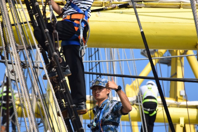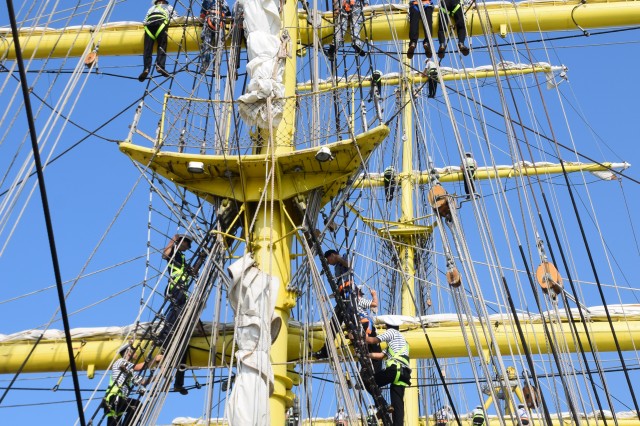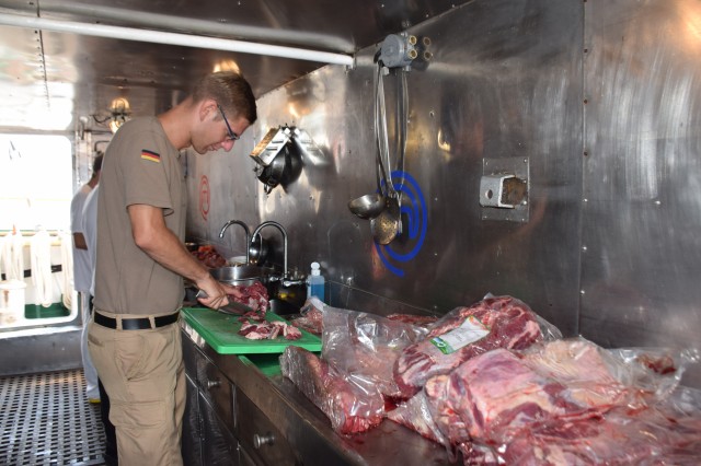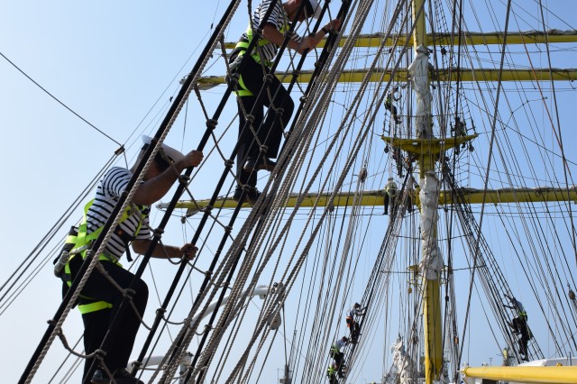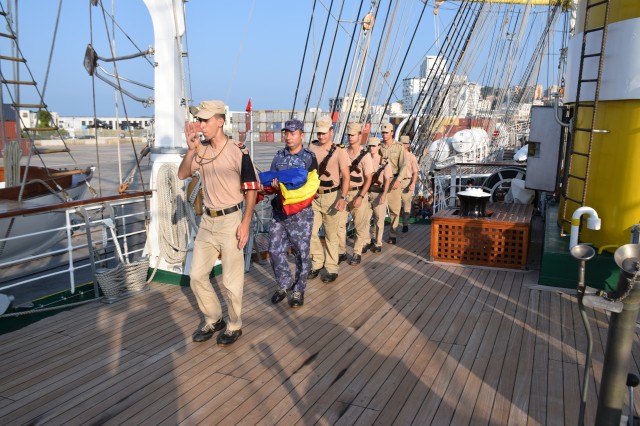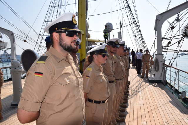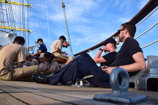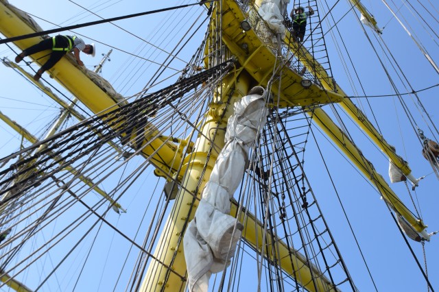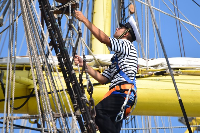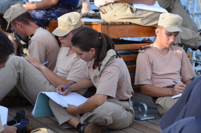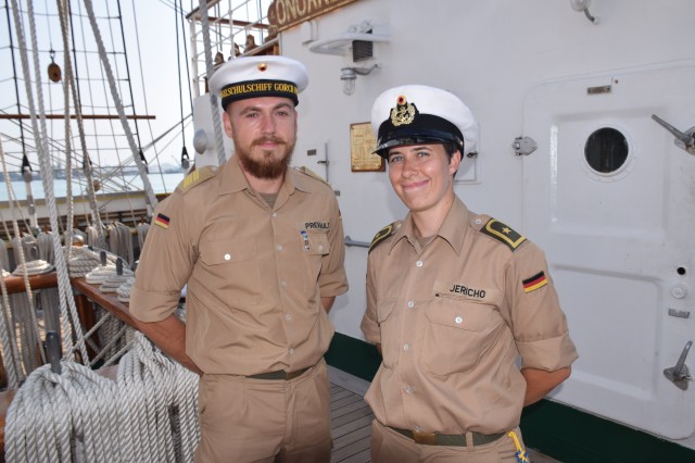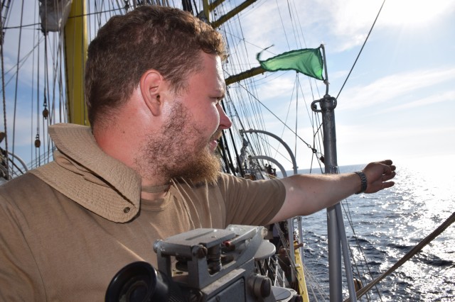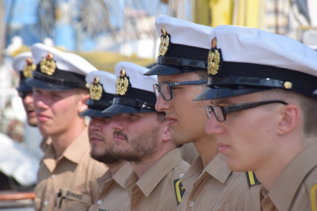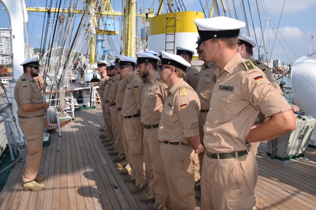 Urmează un exerciţiu de om la apă şi la solicitarea comandantului navei, comandorul Mircea Târhoacă, acesta va fi executat şi condus de către partea germană. Chiar dacă procedurile sunt aceleaşi, suntem curioşi să vedem cum se descurcă colegii noştri germani. Toţii cadeţii români sunt adunaţi la pupa sau urcaţi pe puntea etalon de deasupra comenzii, unde căpitanul Sergiu Şerban le explică deja etapele exerciţiului. Pe puntea dunetă, ofiţerul german de cart căpitanul Bettina Ludwig împreună cu aspirantul Enrico Stieber şi cadetul Luca Mennen la timonă (înainte de a fi cadet a fost în marina germană așa că este familiarizat cu timona) sunt gata de acţiune. Cartul de navigație este asigurat de cadetul Marcus Uellner, iar la veghea pupa e Tim Zerull. Așadar, o echipă 100% germană supravegheată totuși discret de comandantul navei, comandorul Mircea Târhoacă, de secund, căpitanul Florin Albici, și locotenentul Atilla Bokor, comandant grup de luptă comunicații și informatică, dar acum ofițer de cart. Surpriza totală pentru noi a fost că nu au folosit manechinul Oscar, ci chiar căpitan-comandorul Christian Riechelmann, şeful delegaţiei germane, a sărit în apă la puntea centru, echipat cu vizor şi tub, atunci când nimeni nu se aştepta. Se dă alarma, se aruncă un colac de salvare de la bord, cadeţii germani de la veghe pupa şi de pe puntea dunetă strigă puternic arătând, în permanenţă cu mâna întinsă, direcţia unde se află omul căzut în apă. Nava execută manevra de întoarcere, un rondou perfect, bombardul este lăsat la apă, recuperează „naufragiatul”, care este ridicat la bord cu ajutorul gruiului (instalația cu care este coborât și bombardul la apă). Om salvat, exercițiu reușit! Mai târziu căpitan-comandorul Riechelmann mi-a explicat că, și în marina germană, la începutul pregătirii cadeților se folosește Oscarul. Mai târziu, pe măsură ce pregătirea evoluează, după multe astfel de exerciții derulate în toate condițiile și situațiile, Oscarul este înlocuit de o persoană, tocmai pentru a conferi dinamism și realism în astfel de momente. După exercițiu, la pupa, căpitanul Sergiu Șerban explică din nou cadeților români și străini, adunați în jurul său, toate etapele exercițiului și care sunt pașii de făcut, oferind toate detaliile necesare. Continuă și cu explicarea exercițiilor și a modului de acțiune, în cazul exercițiilor de vitalitate, de lupta cu focul, a găurilor de apă și exercițiilor de abandon a navei. Toate au un rost, pentru că mâine este programat, tocmai, un astfel de exercițiu.