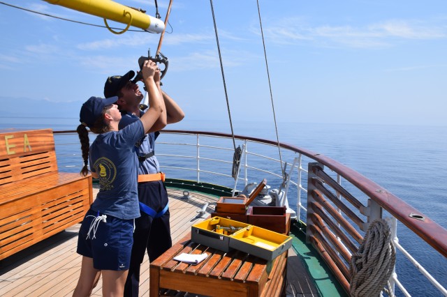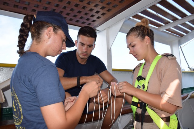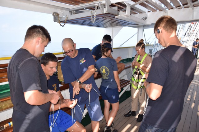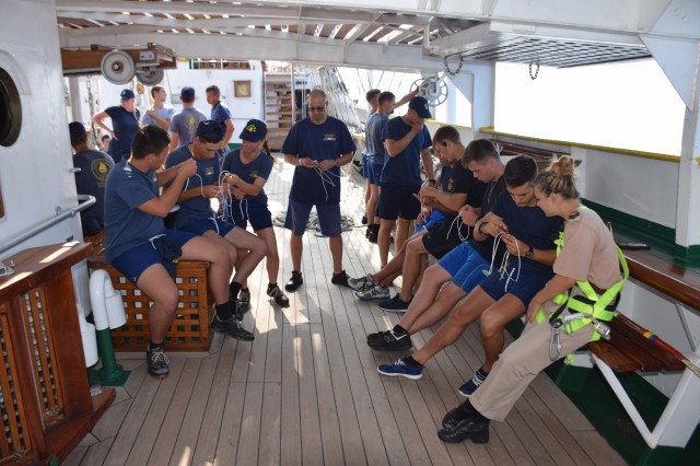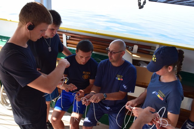 Tot până în masa de prânz, cadeţilor români le sunt repartizate lucrările de matelotaj pe care trebuie să le realizeze şi să le prezinte, peste două săptămâni, la examenul de la finalul marşului. La puntea centru, maistrul militar principal Ionuț Comună le arată cadeților români și străini cum să facă o ancoriță din saulă. O adevărată enciclopedie vie a lucrărilor de matelotaj, maistrul Comună duce, până aproape de artă, această pasiune pentru realizarea de obiecte decorative sau de folosință cotidiană din saulă sau parâmă. Paiete (covorașe), „urși” (tot un fel de covorașe dar mai „pufoase”, realizate pe un fel de cadru de lemn, asemănător gherghefului), împletituri, practic orice se poate realiza cu pricepere și pasiune. Detașat de la Școala de Maiștri Militari a Forțelor Navale „Amiral Ion Murgescu” ca specialist grup manevră vele, pentru acest marș, este unul dintre cei mai pricepuți din marină (pasionat și de „bucătăreală”, îl găsesc deseori în bucătărie, ajutându-i din plăcere pe cei de acolo în timpul liber), alături de maistrul militar clasa a II-a Marius Tomiță, de la aceeași școală sau șeful de echipaj, maistrul militar clasa a II-a Cristian Gâzea și maistrul militar clasa a IV-a Mihai Alexandru. Cadeții se întâlnesc cu lucrările de matelotaj doar în practica de la bordul N.Ș. Mircea, unii dintre ei sunt interesați și realizează cu plăcere lucrările pe care le-au primit ca temă, dar mai apoi contactul cu această veche îndeletnicire marinărească dispare.