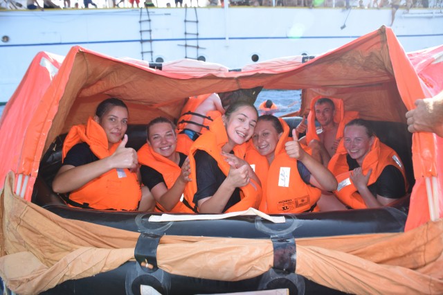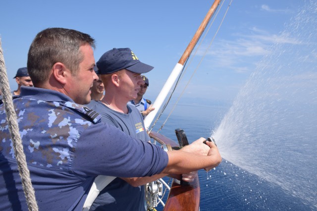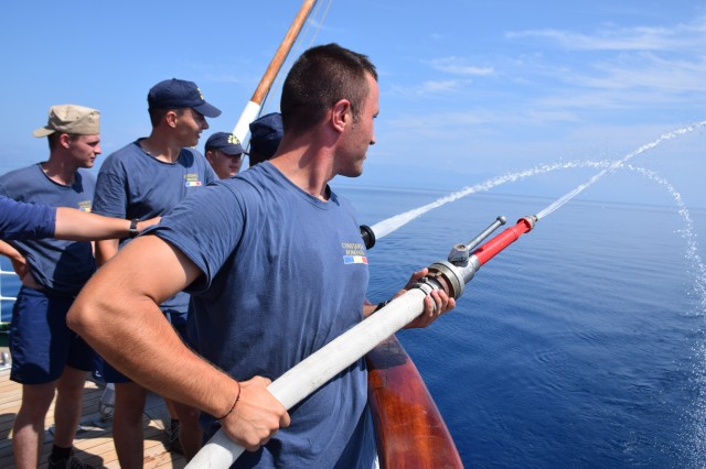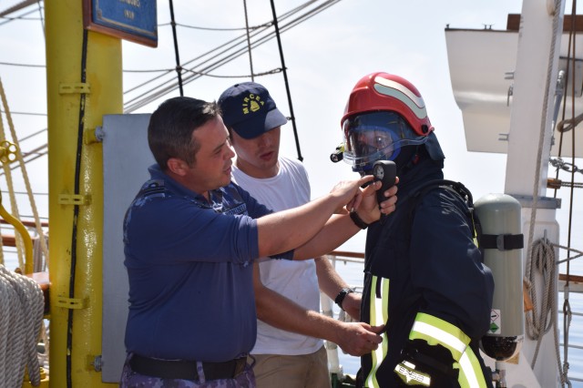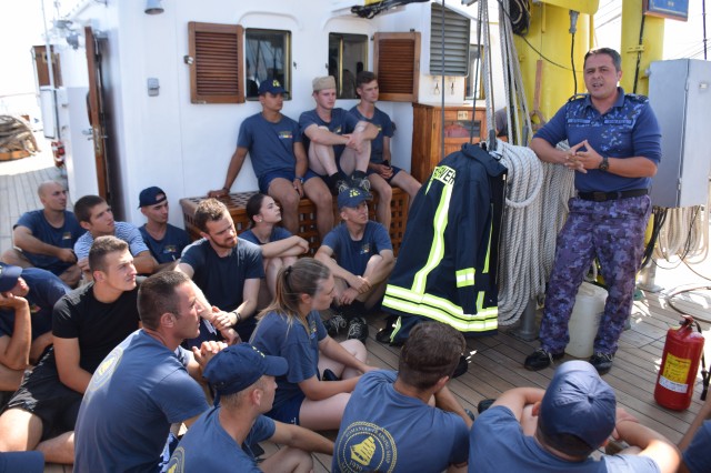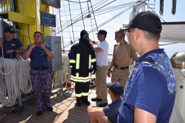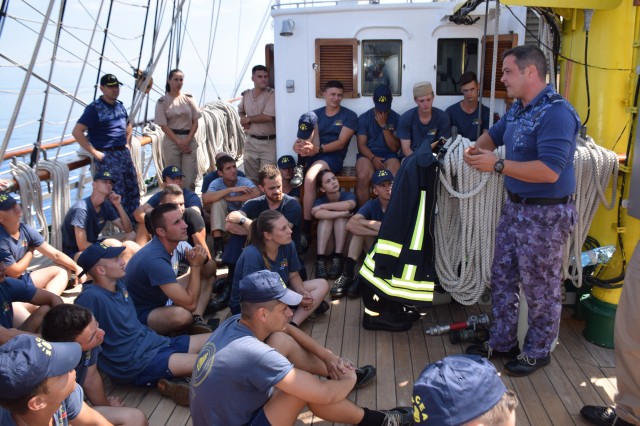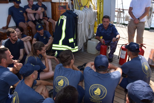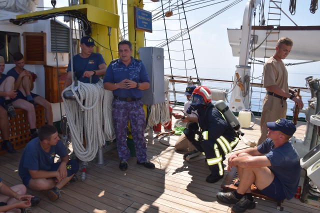 Dar până la activitate, în prima parte a dimineţii, căpitanul Flaviu Kmen, şeful mecanic al navei, face o prezentare a materialelor de vitalitate, astfel încât cadeţii să înţeleagă mai uşor cum se va acţiona pe timpul exerciţiilor. De data aceasta, exerciţiul este condus de partea română. La început, le sunt prezentate modul de acțiune la incendiu, apoi materialele și echipamentele. Fiecare dintre cadeți manevrează furtunul de incendiu, iar o parte dintre ei, inclusiv fete, se echipează complet cu costumul de protecție, cască, mască de oxigen, mănuși, cizme. Pe o căldură de 35 de grade și un soare nemilos, fiecare astfel de echipare este echivalentul unei saune.