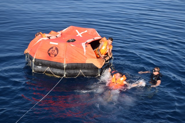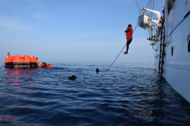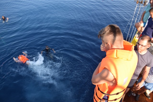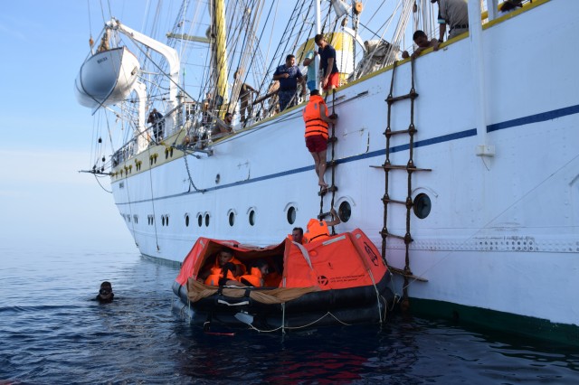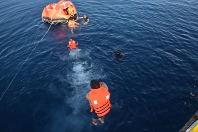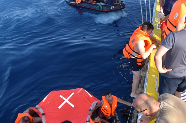La ora 15 se aude comanda „Stop mașina!”, urmată de fundarisirea ancorei din tribord cu patru chei de lanț. Ne aflăm la 13 mile marine travers de exclava Bosnia-Herțegovina și la șapte mile sud de insula croată Mljet. Marea este plată, „cearceaf” am putea spune, nu sunt valuri deloc, deși adie o briză ușoară, de un albastru ultramarin și o salinitate ridicată, care asigură o bună flotabilitate - cadrul perfect pentru ceea ce avea să urmeze. Brusc, soneriile navei încep să sune: „Incendiu în cazarma trei!”. Intervine grupa de vitalitate, dar incendiul nu poate fi stăpânit și continuă să se extindă. Comandantul ordonă abandonarea navei. Evident, este scenariul unui exercițiu, dar de data aceasta foarte aproape de realitate. Pluta de salvare, umflată în prealabil la prova, era deja lansată la apă și legată de navă în bordul tribord. În serii de câte zece, echipați cu veste de salvare, echipajul sare rând pe rând în apă de la puntea centru, înoată până la insulă, unde sunt ajutați să urce. Când pluta este plină este trasă lângă bordaj, iar „naufragiații” revin la bord pe scara de pilot. Exercițiul se desfășoară în condiții de siguranță deplină, cei doi scafandri de la bord, caporalii Ion Stoica și Cezar Butulescu, detașați de la Divizionul 175 Nave Scafandri, sunt demult în apă, gata să acorde asistență dacă este cazul, ca și bombardul navei care se învârte permanent în jurul plutei. Cățărați în bordul tribord maistrul militar clasa a II-a Marius Tomiță și căpitanul Sergiu Șerban de la Academia Navală repetă cu răbdare fiecărui cadet: „Mâna stângă sub brațul drept, dreapta pe nas, un pas mare în față, salt!”. Exercițiul are obiective clare și nu s-a dorit să fie o baie în mare liberă, dar ca să fim sinceri, este binevenit pe această vreme caniculară. Apa este caldă, limpede, dar... foarte sărată. Singurul regret este faptul că nu putem să sărim fără vesta de salvare. Regulile sunt stricte și nu există excepții. Mai bine de trei ore a durat exercițiul, iar comandorul Mircea Târhoacă, comandantul navei, ca de altfel și comandorul Gabriel Moise, nu s-au mișcat din bordul tribord, până când ultimul om nu a revenit la bord. O zi plină, un exercițiu mai mult decât reușit, cu obiectivele atinse, plus bonus o baie în mare, adică un echipaj mulțumit. Sărbătoritul zilei la bord este subofițerul german Malte Kruip, care a împlinit 34 de ani, aici în Marea Adriatică, dar care, ca să fac un joc de cuvinte, nu a abandonat nava!