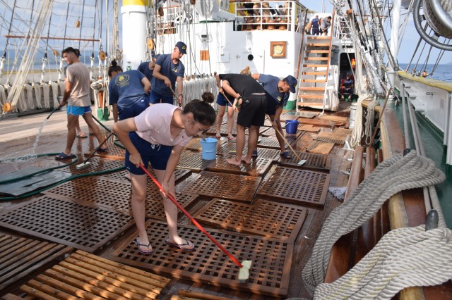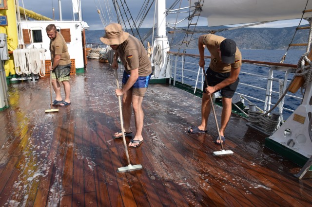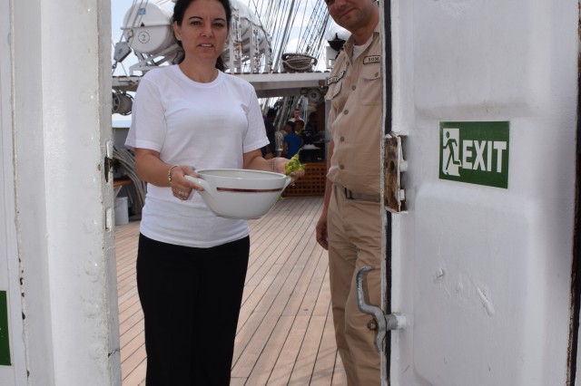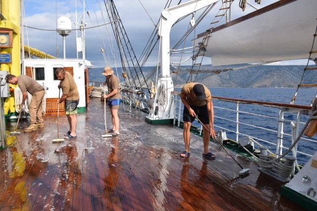 Este sâmbătă și, pentru că mâine intrăm în port, este și zi de curățenie pe navă. Se spală doar grătarele și punțile și nu se mai bricuiește, deoarece nu a trecut nici măcar o săptămână de la ultima activitate de acest fel. Așadar, un program mai relaxat după ziua solicitantă de ieri cu exercițiul de abandon al navei. Și pentru că suntem mai relaxați, astăzi o să vorbim despre ospătari, știți, acei membri ai echipajului care „intermediază” drumul mâncării pe vapor de la bucătăria din prova navei până în salonul de la pupa, acei oameni răbdători care ne servesc la masă de trei ori pe zi. Pentru cei care trebuie să precizăm că, pe navele marinei militare, ospătarii nu sunt niciodată doar... ospătari. Toți au rol pe navă, așa că, în cazul velierului nostru, o să-i găsim și la manevra prova sau pupa, la manevra velelor sau mai știu eu unde. Atunci când sună soneriile cu semnalul specific urmat de anunțul de la stația de amplificare: „Veselarii! Veselarii!” și apoi în engleză, ”Stewards on the mess room!” știm că se apropie ora mesei și sunt chemați să ridice mâncarea din bucătărie. Dar pentru ei munca începe cu cel puțin o oră înainte și se încheie poate și cu două ore după masă.