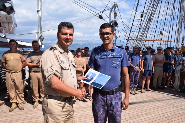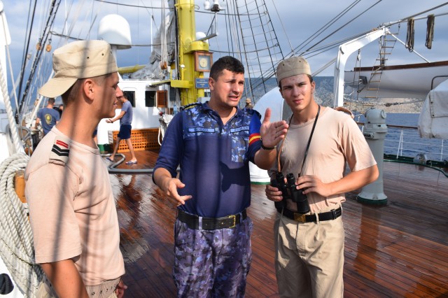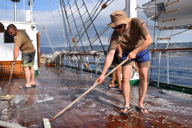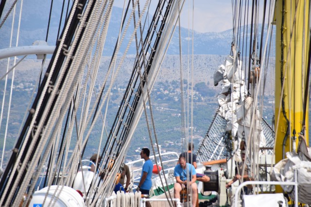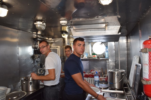 Pe N.Ș. Mircea, în acest marș de instrucție sunt patru ospătari, dar nici unul dintre ei nu se regăsește în echipajul de bază al navei (cadeții, soldații și gradații profesioniști se „gospodăresc” singuri în cazărmile de la prova). Caporalul Raluca Duță servește în elegantul salon de la pupa navei și este un veteran al marșurilor de instrucție și misiunilor pe mare - când ajungem în țară pe 20 septembrie coboară schela de pe bric și își mută „sacul de marinar” pe fregata „Regele Ferdinand”, pentru că pe 24 septembrie pleacă iar pentru o lună într-o nouă misiune în Marea Mediterană - așa că este stăpână pe situație. Detașată de la Școala de Aplicație a Forțelor Navale, reușește întotdeauna să aducă un plus de culoare și eleganță în decorarea mesei și a salonului, chiar cu o tentă națională tricoloră. La careul ofițeri, îl regăsim pe caporalul Florin-Ionuț Neacșu, de la Divizionul 67 Nave Purtătoare de Artilerie de la Brăila, și el un veteran al ultimelor 3-4 marșuri de instrucție, în timp ce greul de la careul maiștrilor (se află o punte mai jos și se mănâncă în două serii, așa că volumul de muncă este mai mare), îi găsim pe soldații Georgică-Nicușor Soare și Marius Moroie, ambii de la Divizionul 146 Nave Minare-Deminare, din echipajul puitorului de mine 274 Viceamiral Constantin Bălescu, că tot aminteam într-o corespondență trecută că la N.Ș. Mircea găsim marinari din toate unitățile marinei. Nu insist mai mult, am vrut doar să îi menționez și pe cei pe care nu îi vedem aproape niciodată în fotografiile marșului de instrucție dar care, la fel ca toți membrii echipajului, au rolul lor bine definit pe navă și, de ce nu, și în menținerea moralului echipajului. În altă ordine de idei, astăzi a fost aplaudat generos la puntea centru caporalul Alexandru Samoilă, mecanic vitalist de felul lui, care a împlinit vârsta de 28 de ani pe mare, aici la câteva cabluri de portul Split.