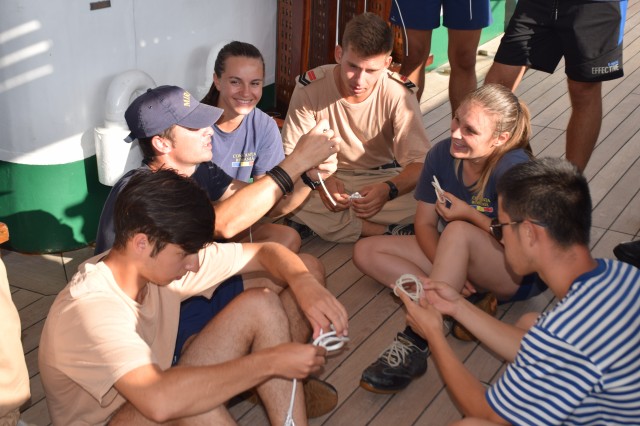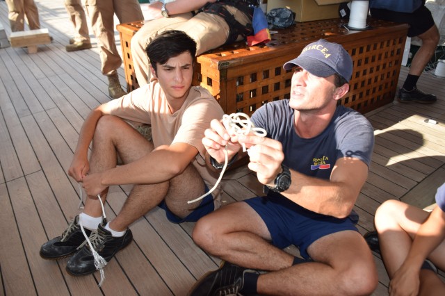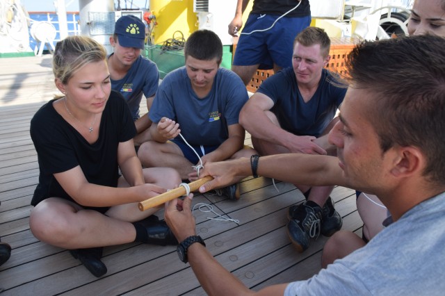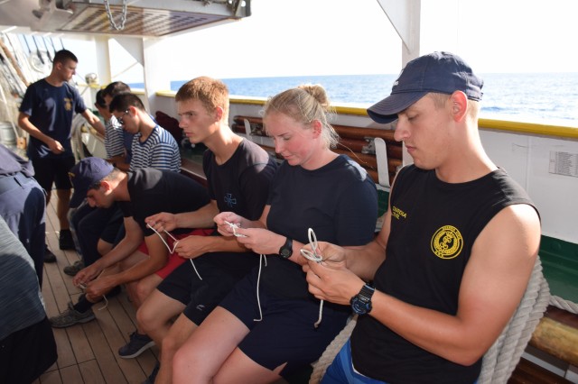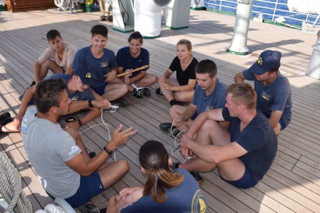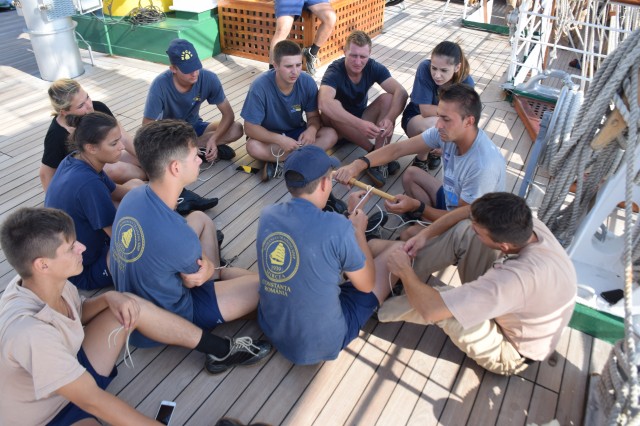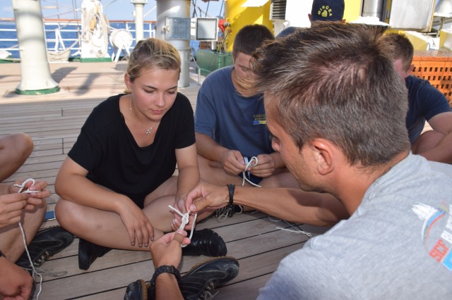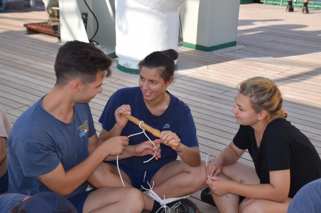 Paralel, o parte dintre cadeții români, tot la puntea centru, cu maistrul militar clasa a II-a Marius Tomiță, cealaltă parte cu maistrul militar clasa a IV-a Mihai Alexandru, pe puntea dunetă, încep cursul de noduri marinărești și lucrări de matelotaj. Lecțiile de noduri marinărești se vor desfășura printre picături, câte o oră-două, atunci când timpul permite. La final, cadeții români vor trebui să recunoască și să știe să facă 15 tipuri de noduri: de scaun, de gașă, nod în opt, la trei cazici, de pescar, gură de știucă, gură de lup, picior de câine, nod lat, de văcar, etc. Ați obosit deja doar citind enumerarea de mai sus? Încercați să le și faceți dacă le-ați reținut măcar denumirea. Cel mai folosit de cadeți este nodul de foarfecă cu care își leagă hamacul în fiecare seară, este de altfel primul nod pe care l-au învățat la bord. Aflu de la instructor că, pentru cadeți, cele mai grele noduri, sau cel puțin așa le par lor, sunt nodurile de gașă, de școtă sau picior de câine. Adevărul este că cel mai greu nod marinăresc este cel de măr, dar nu este cerut la examen. Poate vă întrebați de ce trebuie viitorii ofițeri să cunoască nodurile marinărești? Un răspuns decent ar fi că orice marinar de la bordul unei nave, indiferent de mărime, ofițer sau nu, trebuie să cunoască nodurile... marinărești. Uneori îți pot salva viața. Apoi, pentru că atunci când vor ajunge la nave, pot fi de exemplu șefi manevra prova sau pupa, adică acolo unde sunt folosite o parte dintre aceste noduri la acostare, la legarea navelor, etc. Evident, nu le vor face ei personal, dar trebuie să supravegheze și să cunoască dacă cei care le execută chiar știu ce fac sau dacă le execută în mod corect. Surprinzător poate, dar nu nodurile îi preocupă pe cadeți, ci mai mult lucrările de matelotaj. Aici este mult mai mult de muncă, iar timpul alocat fiecărei lucrări variază în funcție de dificultate. Dar, deocamdată nu își fac probleme, mai au zece zile până la examen. Așezați în cerc, în lumina blândă a apusului, încearcă, rând pe rând, să reproducă nodurile arătate, cu răbdare și migală, de către instructori, până când reușesc singuri. O activitate pe care o iau foarte în serios, o să fie subiect la examenul de practică, de pe data de 18 septembrie, de la bord, când vor trebui să recunoască și să facă singuri diferite tipuri de noduri. Maistrul militar principal Ionuț Comună nu se dezminte, are deja câțiva discipoli în jurul său, care meșteresc împreună câteva ancorițe din saulă, în timp ce navigăm tot mai spre sud-est în Marea Ionică. Seara, la puntea centru, o parte din echipaj încearcă să urmărească meciul de fotbal dintre România și Muntenegru, o transmisie recepționată greu și fără sunet și încheiată cu un dezamăgitor scor alb.