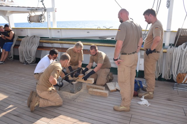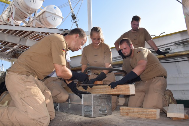 Ziua se scurge ușor, după curățenie, continuă lucrările de mentenanță, sunetul flexului de data aceasta predomină și un praf fin plutește la puntea centru de la șlefuirea bancheților în vederea lăcuirii, totul pe fundalul insulei grecești Kerkira, pe lângă care am mai trecut la venire și care rămâne, pentru câteva ore, în babordul nostru, dar la o distanță de peste 10 mile. Dar rumegușul se adună la puntea centru și de la tăierea lemnelor de către cadeții germani pentru exercițiul de vitalitatea navei, de data aceasta, gaura de apă. Din materialul lemnos adus tocmai din Germania și depozitat pe puntea etalon, cadeții învață să taie cu fierăstrăul bucățile potrivite, să le îmbine adecvat și să astupe astfel ipotetica gaură de apă, sub supravegherea celor doi instructori germani specialiști în lupta pentru vitalitatea navei. Treabă serioasă, nu se glumește, iar cadeții sunt implicați 100%. Dacă tot am amintit de germani, sărbătoritul de azi de la puntea centru este aspirantul Enrico Stieber, ofițer de cart, 31 de ani.