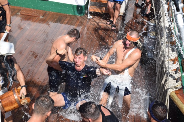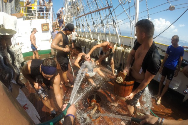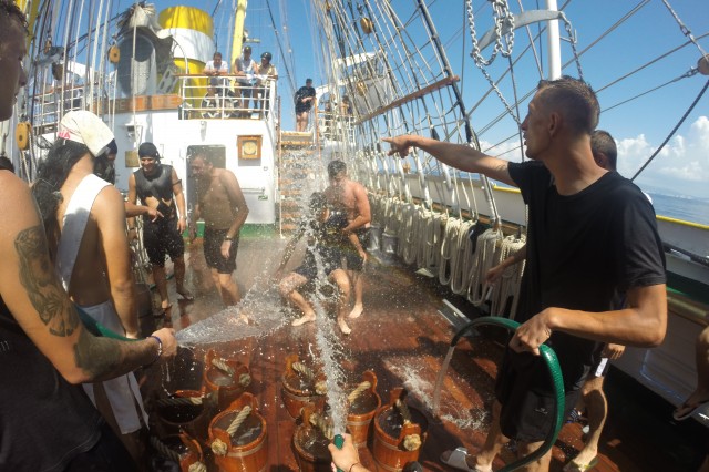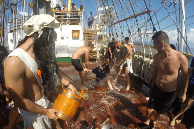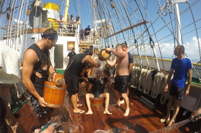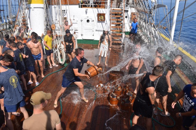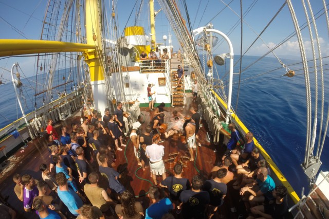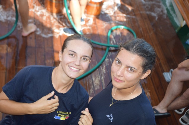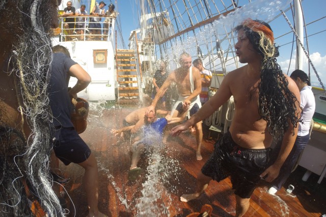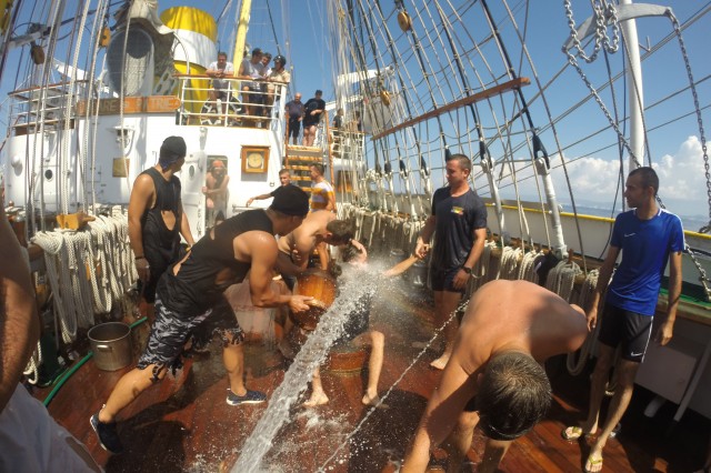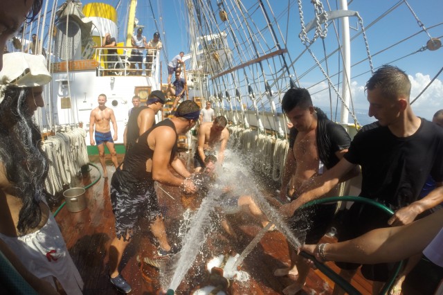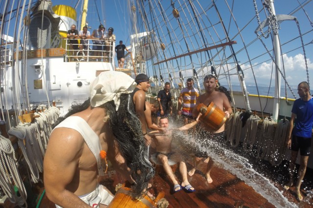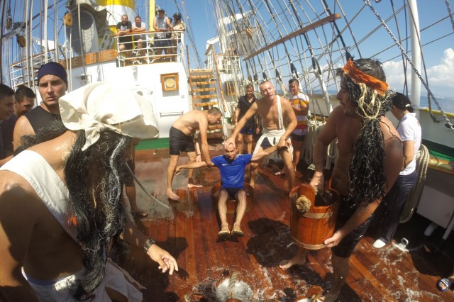 Despre cadeți ce să mai spunem? După primele momente de ezitare, entuziasmul a fost general. Pentru cei din afara marinei, pentru publicul larg, vizionarea unui astfel de clip poate părea că aduce puțin cu ritualurile barbare marinărești, că Zeul și ajutoarele sale sunt puțin cam duri cu cei nebotezați. În realitate, lucrurile sunt la polul opus, iar distracția este garantată și generală. Nu am auzit pe nimeni pe navă care să se plângă de această experiență. Chiar și cadeții germani s-au distrat, iar unora le-a plăcut atât de mult încât au cerut să mai fie botezați o dată. La ei, tradiția este mai strictă, în sensul că astfel de evenimente se organizează doar atunci când nava trece Cercul Polar sau Ecuatorul și mult mai dură. Aici în Marea Ionică, în drumul nostru spre sud-est, de ziua Sf. Marii, cadeții și echipajul au mai adăugat în bagajul de amintiri încă o filă, încă un moment de care își vor aminti cu plăcere în anii care vor veni. Pe lângă cei 4-5 Mariani de la bord, sărbătoritul zilei este caporalul Vasile Gheorghe, de nerecunoscut la adunarea de la ora patru, îmbrăcat regulamentar în ținuta albastru camuflaj (tot timpul îl vedem în costumul alb de bucătar), când a fost felicitat de comandantul navei la împlinirea vârstei de 31 de ani.