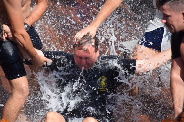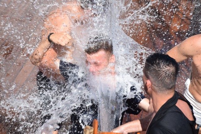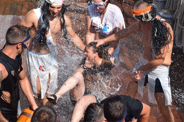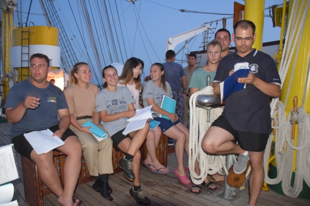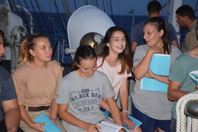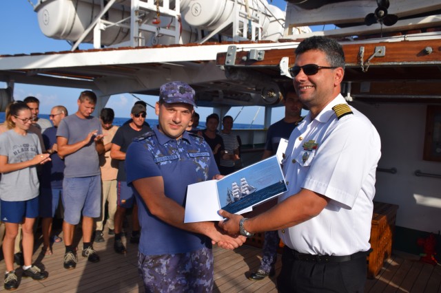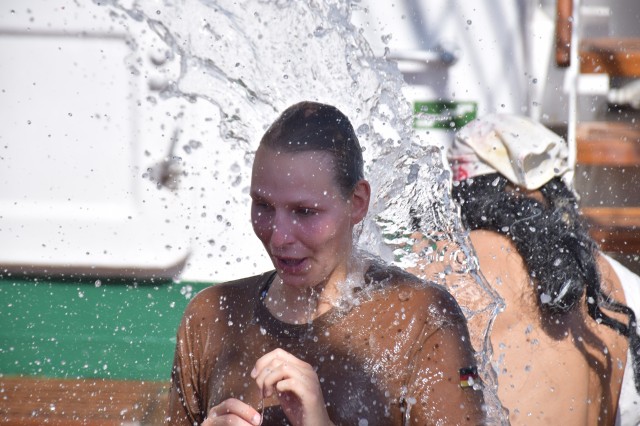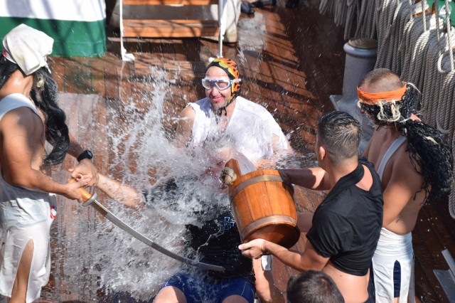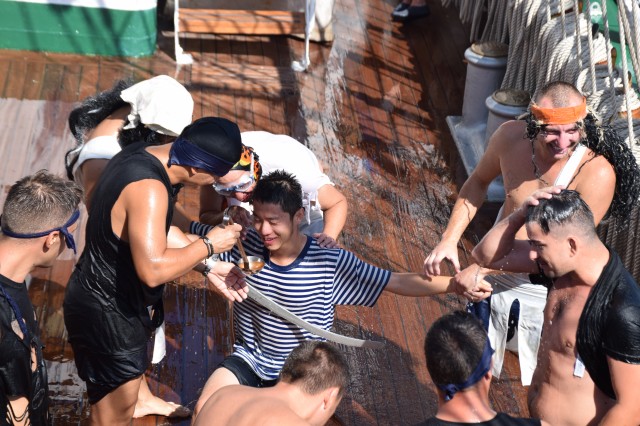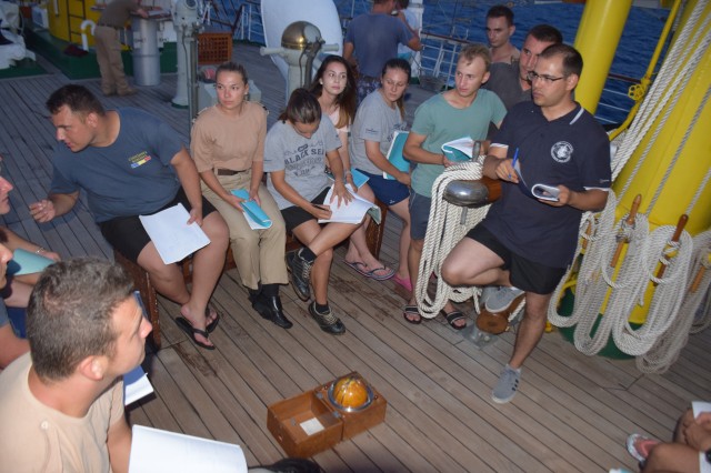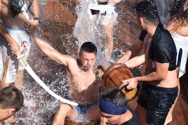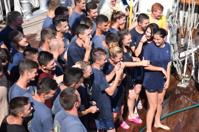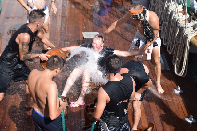 Despre cadeți ce să mai spunem? După primele momente de ezitare, entuziasmul a fost general. Pentru cei din afara marinei, pentru publicul larg, vizionarea unui astfel de clip poate părea că aduce puțin cu ritualurile barbare marinărești, că Zeul și ajutoarele sale sunt puțin cam duri cu cei nebotezați. În realitate, lucrurile sunt la polul opus, iar distracția este garantată și generală. Nu am auzit pe nimeni pe navă care să se plângă de această experiență. Chiar și cadeții germani s-au distrat, iar unora le-a plăcut atât de mult încât au cerut să mai fie botezați o dată. La ei, tradiția este mai strictă, în sensul că astfel de evenimente se organizează doar atunci când nava trece Cercul Polar sau Ecuatorul și mult mai dură. Aici în Marea Ionică, în drumul nostru spre sud-est, de ziua Sf. Marii, cadeții și echipajul au mai adăugat în bagajul de amintiri încă o filă, încă un moment de care își vor aminti cu plăcere în anii care vor veni. Pe lângă cei 4-5 Mariani de la bord, sărbătoritul zilei este caporalul Vasile Gheorghe, de nerecunoscut la adunarea de la ora patru, îmbrăcat regulamentar în ținuta albastru camuflaj (tot timpul îl vedem în costumul alb de bucătar), când a fost felicitat de comandantul navei la împlinirea vârstei de 31 de ani.