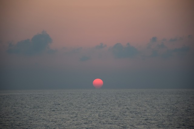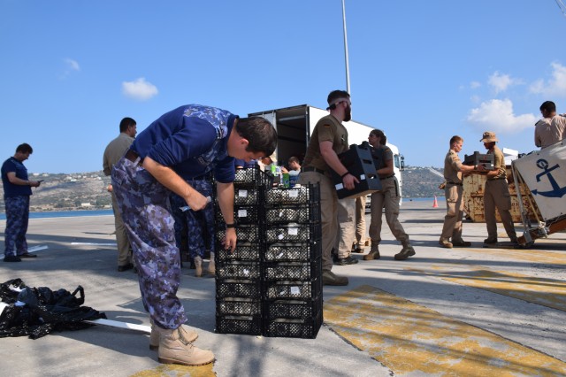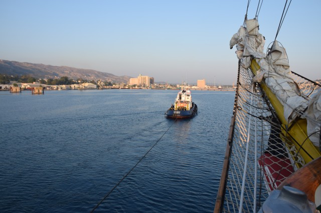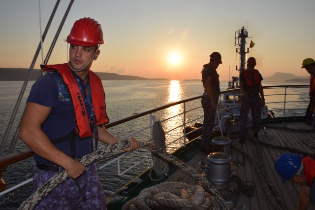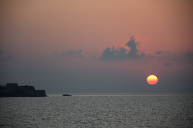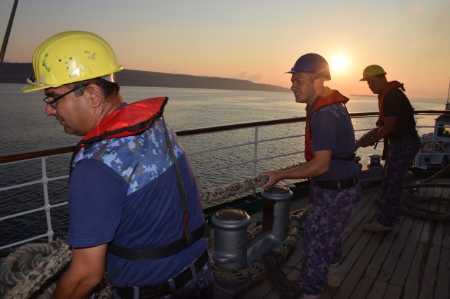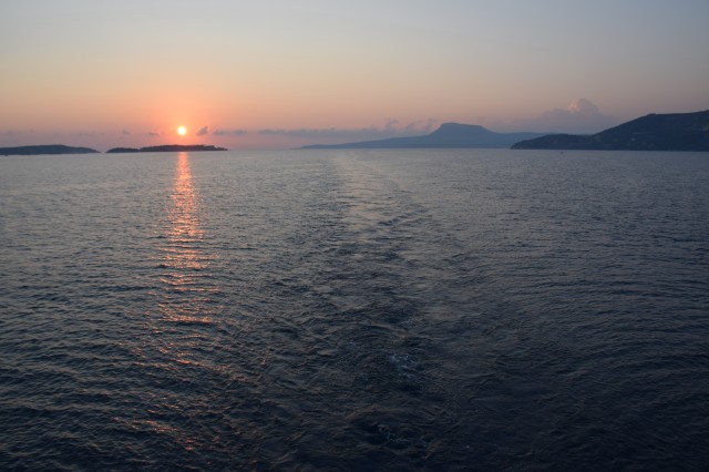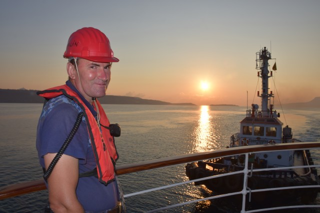La ora 5.45, înainte de deșteptare, suntem treziți de pornirea motorului principal. Ca orice motor, are nevoie de încălzire, dar manevra de intrare în port începe de la ora 7 cu pilot la bord. Doar cinci mile ne despart de locul de ancorare din golful Kalyvion de cheul din Souda. Așadar, în timpul răsăritului, pe măsură ce soarele se înalță, intrăm tot mai adânc în golful Souda, însoțiți de două remorchere. În cele două borduri, peisajul este asemănător, cu țărm stâncos și înalt, cu repere cunoscute pentru mulți dintre marinarii militari din Forțele Navale Române, deoarece este un port de escală tradițional pentru fregatele noastre, care participă la misiuni în Marea Mediterană și chiar și N.Ș. Mircea a mai fost aici anul trecut. Tot aici se află o bază navală, dar și Centrul NATO de pregătire pentru operațiile de interdicție maritimă (NATO Maritime Interdiction Operational Training Centre, pe scurt NMIOTC), unde și Forțele Navale Române au un ofițer.