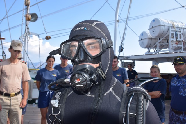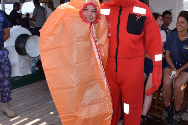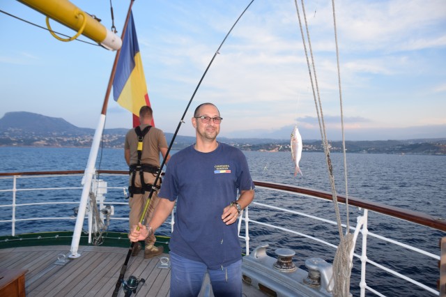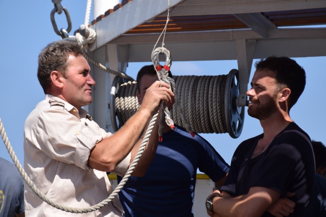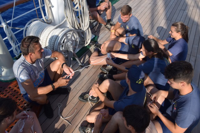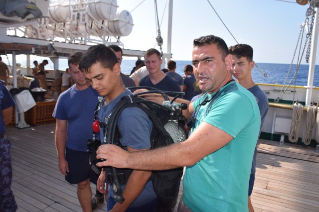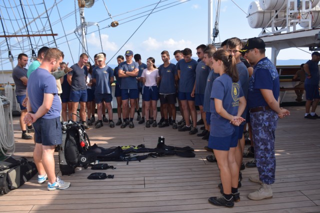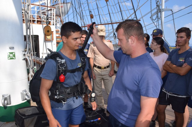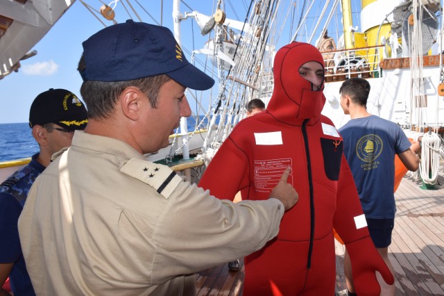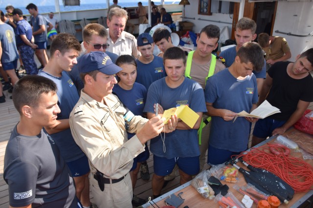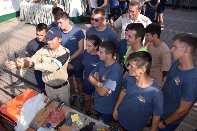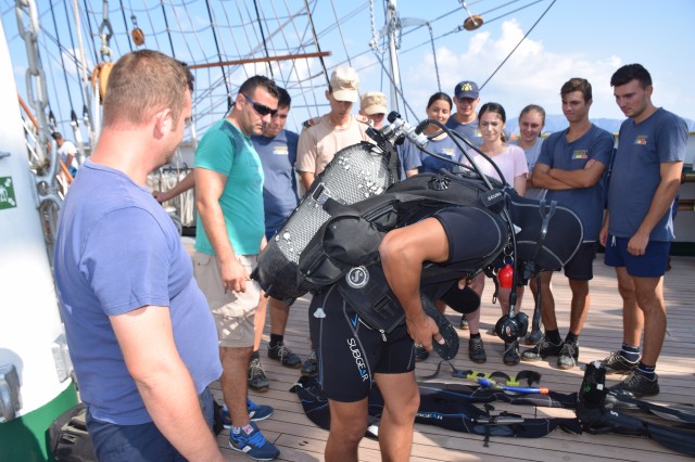 Dar, lecția cea mai importantă a zilei se desfășoară la puntea centru, începând cu ora 10, și se referă la supraviețuirea pe mare. Maistrul militar clasa a II-a Cristian Gâzea, șeful de echipaj, le arată în detaliu ce conține o plută de salvare, utilitatea și modul de folosire a fiecărui obiect. De la ancore de furtună pliabile, dopuri, petice, adezivi, saule, pompă, lanterne, până la pelerine de protecție și costume de protecție termică, nou achiziționate la bord, probate de cadeți, care le pot salva viața. Tot la puntea centru, în bordul babord, se desfășoară un alt atelier. Aici, cei doi scafandri de bord – iată unde ajung militarii de la Divizionul 175 Nave Scafandri, caporalul Ion Stoian de la Secția de scafandri de luptă de incursiune și Cezar Butulescu de la Secția de scafandri de mare adâncime – le prezintă echipamentul de scufundare. Ca întotdeauna, interesul este mai mare pentru acest domeniu, sunt interesați să afle amănunte și mulți dintre membrii echipajului nu doar cadeții. Se echipează rând pe rând, își pun și butelia în spate și zâmbesc fericiți din spatele vizorului și cu detentorul în gură. Nu e rău, marina are nevoie în permanență de noi candidați pentru cursul de scafandri și, cine știe, peste câțiva ani, unii dintre ei se vor regăsi scafandri calificați în cadrul Divizionului 175 Nave Scafandri sau poate chiar la colegii de la Divizionul 164 Forțe Navale pentru Operații Speciale. Cadeții străini s-au încadrat bine în echipaj. La puntea centru, maistrul militar clasa a II-a Marian Vîrlan este mai mult decât mulțumit de cei doi britanici, Neil Connell și Callum Tapper, care scurtează și refac gașa unei parâme. „Se vede că au mai fost la nave!”, concluzionează scurt.