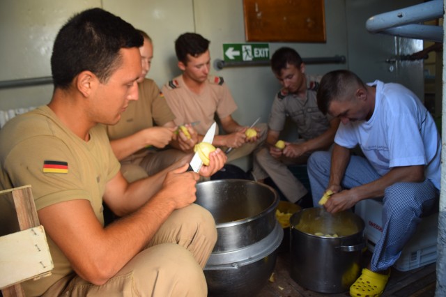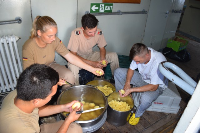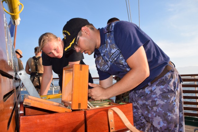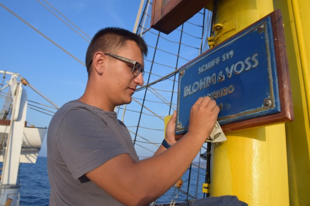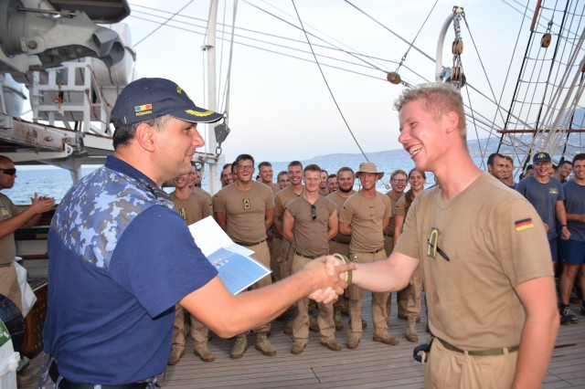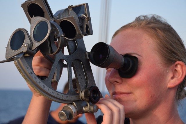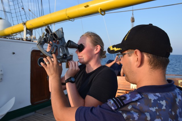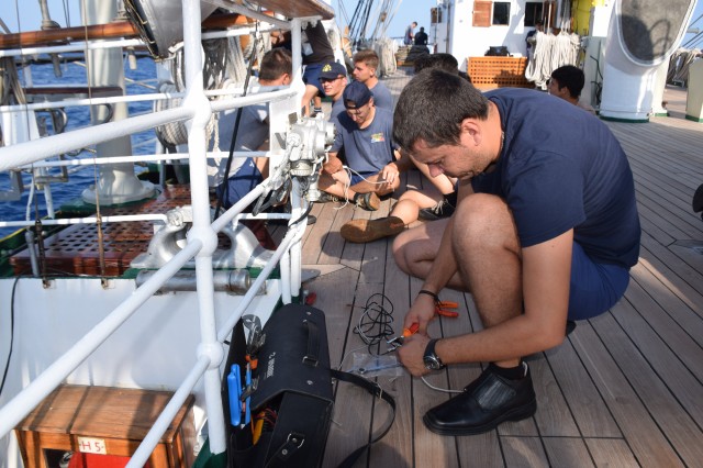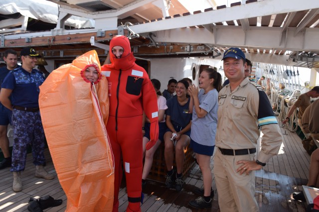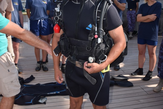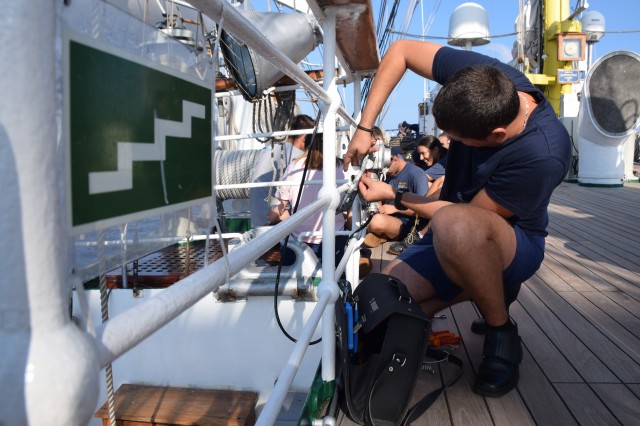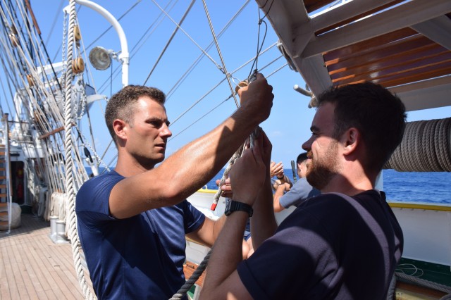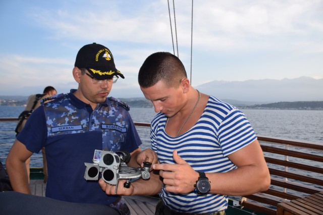 Dar, lecția cea mai importantă a zilei se desfășoară la puntea centru, începând cu ora 10, și se referă la supraviețuirea pe mare. Maistrul militar clasa a II-a Cristian Gâzea, șeful de echipaj, le arată în detaliu ce conține o plută de salvare, utilitatea și modul de folosire a fiecărui obiect. De la ancore de furtună pliabile, dopuri, petice, adezivi, saule, pompă, lanterne, până la pelerine de protecție și costume de protecție termică, nou achiziționate la bord, probate de cadeți, care le pot salva viața. Tot la puntea centru, în bordul babord, se desfășoară un alt atelier. Aici, cei doi scafandri de bord – iată unde ajung militarii de la Divizionul 175 Nave Scafandri, caporalul Ion Stoian de la Secția de scafandri de luptă de incursiune și Cezar Butulescu de la Secția de scafandri de mare adâncime – le prezintă echipamentul de scufundare. Ca întotdeauna, interesul este mai mare pentru acest domeniu, sunt interesați să afle amănunte și mulți dintre membrii echipajului nu doar cadeții. Se echipează rând pe rând, își pun și butelia în spate și zâmbesc fericiți din spatele vizorului și cu detentorul în gură. Nu e rău, marina are nevoie în permanență de noi candidați pentru cursul de scafandri și, cine știe, peste câțiva ani, unii dintre ei se vor regăsi scafandri calificați în cadrul Divizionului 175 Nave Scafandri sau poate chiar la colegii de la Divizionul 164 Forțe Navale pentru Operații Speciale. Cadeții străini s-au încadrat bine în echipaj. La puntea centru, maistrul militar clasa a II-a Marian Vîrlan este mai mult decât mulțumit de cei doi britanici, Neil Connell și Callum Tapper, care scurtează și refac gașa unei parâme. „Se vede că au mai fost la nave!”, concluzionează scurt.