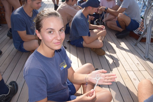 Spuneam că este doar teoretic duminică, deoarece lucrurile continuă în nota obișnuită la bord. Ne-am odihnit ieri, de Sfânta Maria, așa că azi munca continuă cu electricienii, se schimbă lumina de la bastonul pupa, vopsit, lăcuit, mentenanță curentă, schimbare de garnituri, etc. Printre picături continuă lecțiile la nodurile marinărești și lucrările de matelotaj. Studenta caporal Ioana Brumă nu are nicio problemă cu nodurile, îmi face imediat un nod de măr – spuneam că este cel mai greu de făcut – urmat, pentru amuzament, de o spânzurătoare. Ce nu poți să faci doar dintr-o bucată de saulă! Ce ironie, studenta caporal Ioana Brumă este în anul II la Academia Navală „Mircea cel Bătrân”, după ce timp de un an și jumătate a fost caporal și a făcut parte din echipajul navei, cu sute de carturi la stația radio, în timp ce maistrul militar clasa a IV-a Mihai Alexandru, adică fostul coleg de echipaj și instructorul care le predă acum cadeților taina nodurilor marinărești, este acum student în anul I la Academia Navală!