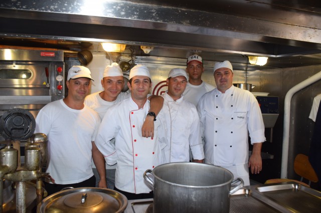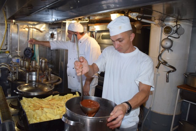 De la început, vă spun că mâncarea este bună, iar uneori chiar foarte bună la bord, deși unii au tendința de a mă contrazice și oricum cei șase bucătari de pe navă nu vor putea niciodată să împace pe toată lumea sau să gătească meniul perfect pentru toți membrii echipajului. Ajungi să apreciezi mâncarea de la bord doar atunci când ajungi să mănânci prost prin alte locuri și nu mă refer doar la alte nave. Poate nu vă vine să credeți dar cel mai vechi membru al echipajului este... un bucătar. Maistrul militar principal Corneliu Dumitriu a venit direct din promoție la navă și aici a rămas în următorii 25 de ani. Orice poveste despre bucătarii și bucătăria de pe N.Ș. Mircea ar trebui să înceapă cu el. Aproape două decenii și jumătate și-a petrecut jumătate din viață în spațiul îngust, fierbinte și plin de aburi de sub teugă, în bucătăria navei. Este adevărat însă că de aproape doi ani nu a mai pus mâna pe polonic, adică de când a trecut pe funcția de comandant grup intendență, dar acum hârtiile îi mănâncă viața. Oricum, tot în bucătărie îl găsești și nu pentru că face parte din fișa postului, ci pentru că altfel nu poate.