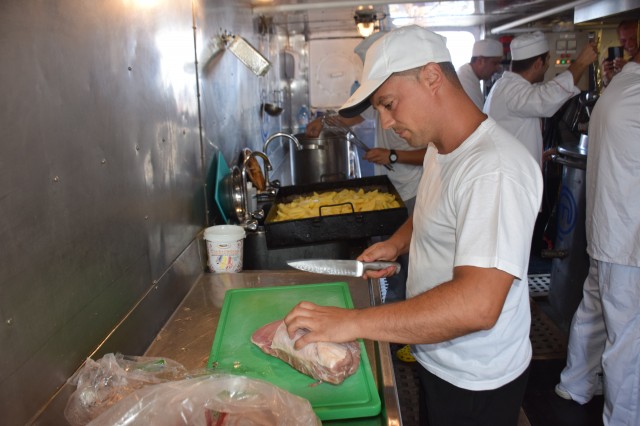Nu sunt bucătari, dar trebuie să spunem că grupa de serviciu de la bucătărie formată în fiecare zi din cadeți are un rol foarte important pentru bucătarii navei. Cadeții sunt cei care îi ajută la curățarea cartofilor și a legumelor, la curățenie, la colectarea și sortarea deșeurilor. Este o muncă grea, cadeții recunosc asta și este serviciul cel mai greu pentru ei pe navă. Îi menționăm aici pentru că fără munca lor cea a bucătarilor ar fi mult mai grea dacă nu chiar imposibilă.