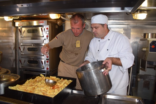 Dar, sufletul și personajul principal al bucătăriei din prezent este Mitică bucătarul, caporalul Dumitru Antochie pe numele lui întreg. În divizion este din anul 2004, iar la bord a ajuns în anul 2006. Adică din cei 36 de ani câți are acum, mai bine de 12 i-a petrecut în bucătăria navei și în tot atâtea marșuri spre supărarea soției și a celor doi copii. Poate părea iarăși ciudat, dar felurile de mâncare cele mai solicitante pentru bucătari sunt cele de genul fast-food: pizza, șaorma (greu de crezut, dar s-a gătit și asta), pentru că bucătăria este relativ mică, nu permite să te desfășori, este nevoie de multe cuptoare, etc. (odată cu instalarea noii friteuze, cartofii prăjiți nu mai sunt o problemă). Poate vă întrebați câți bucătari sunt la bord. Vă spun eu, sunt șase la număr, care lucrează în ture de câte trei, o zi cu o zi, dar în „vârfurile de sarcină” intervin toți. Mai sunt și doi bucătari germani, Marco Sohst și Stefan Hettich, care s-au adaptat cu ai noștri, având în vedere și experiența din marșurile anterioare, chiar dacă cele două bucătării sunt destul de diferite (de la gust și până la flux de muncă).