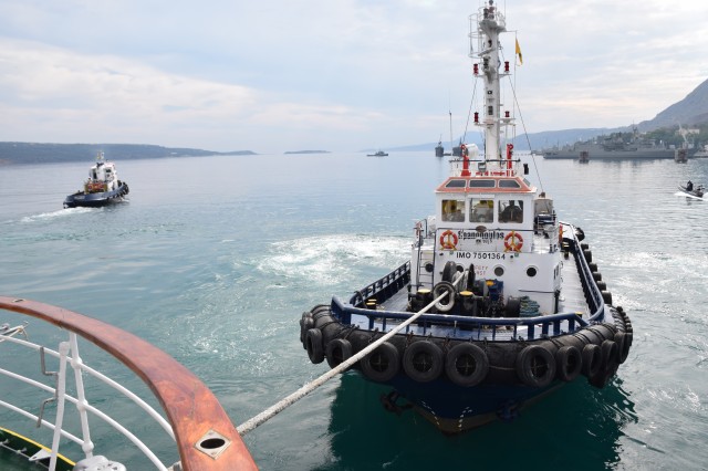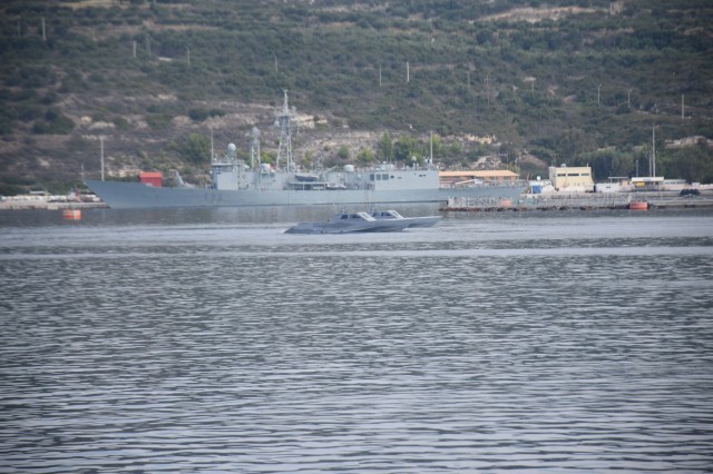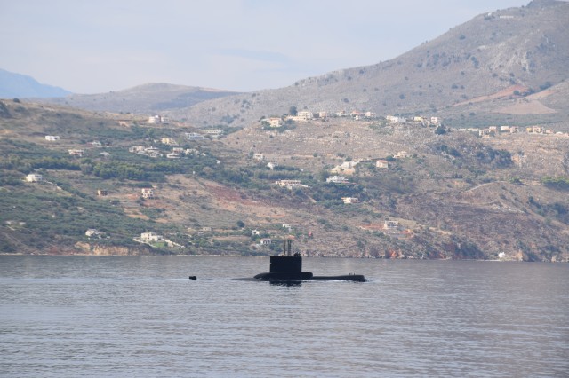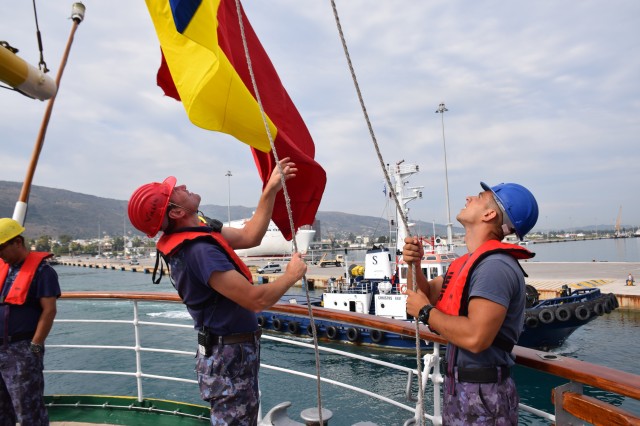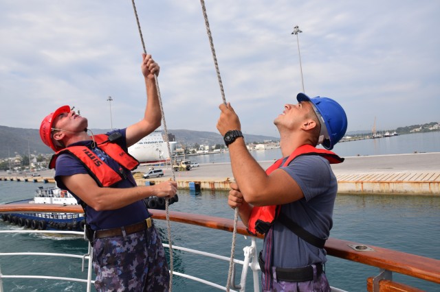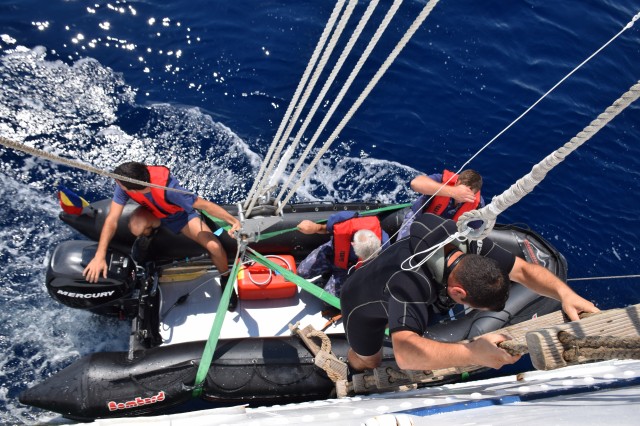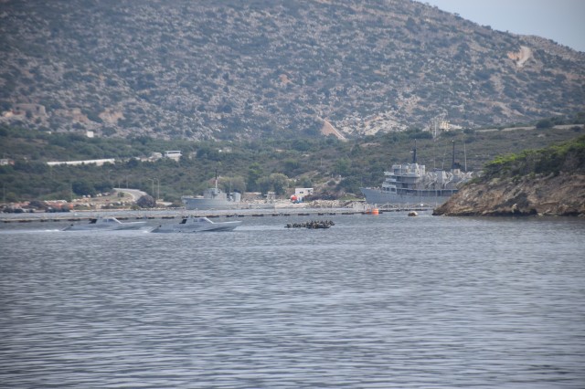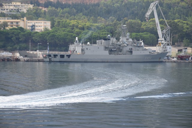 La ora 10, părăsim cheul din Souda - locul unde acostează și feriboturile din Pireu – și, ajutați de două remorchere, începem drumul înapoi spre țară prin mijlocul golfului. Baza navală de aici din Souda este una aglomerată, cu nave militare sub toate pavilioanele, care pleacă și intră permanent. Acum două zile, fregata spaniolă Numancia – o veche cunoștință, care a acostat de câteva ori și la Constanța – la fel și distrugătorul USS Carney, staționau la cheu. În ziua plecării noastre, două fregate grecești din clasa Hydra (Meko-200), Psara și Salamis, au apărut în tribordul nostru la o oarecare depărtare. De asemenea, nava de suport logistic germană Mosel s-a aflat în același loc timp de două zile, iar tot azi, pe când ieșeam din golful Souda, intra un submarin grecesc Tip 209 și eram depășiți în viteză de bărcile stealth ale celor de la SEAL de la centrul de instruire amintit în corespondența de ieri. Trafic naval militar serios printre care trece elegant și velierul nostru!