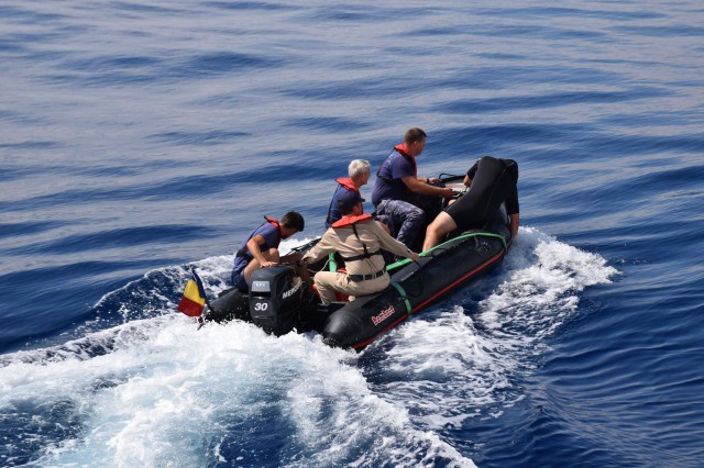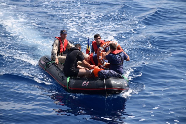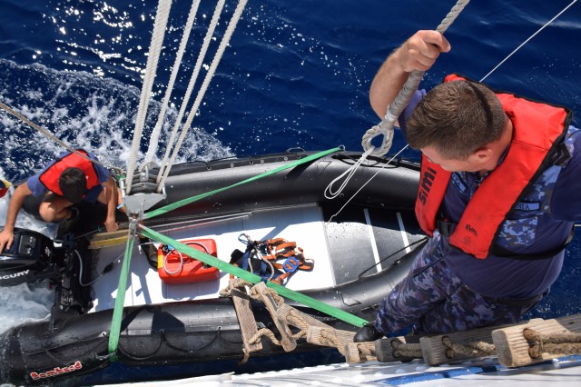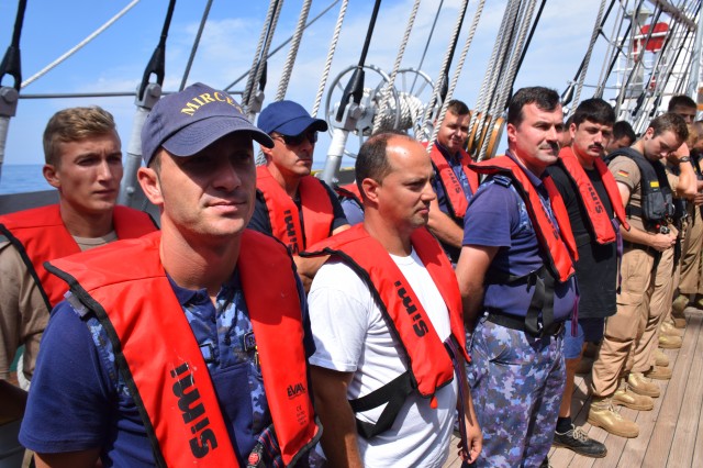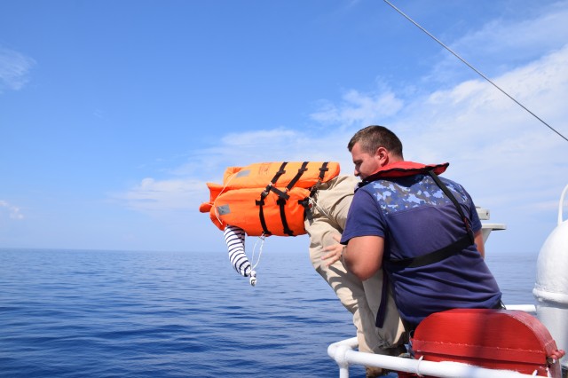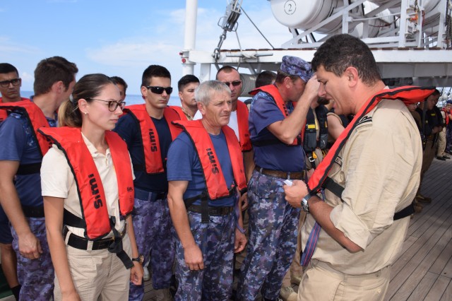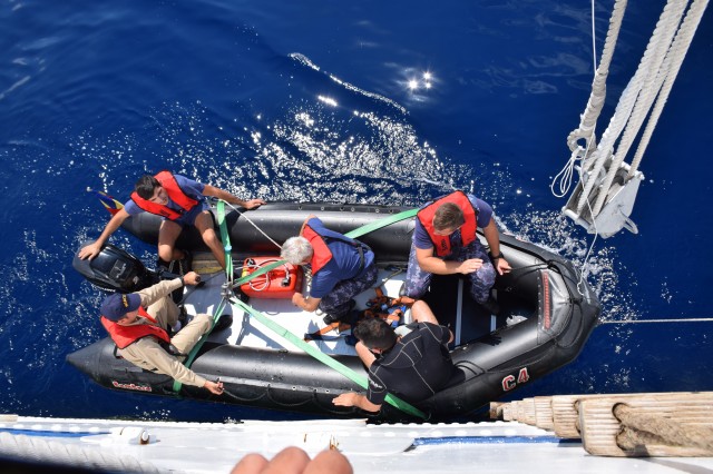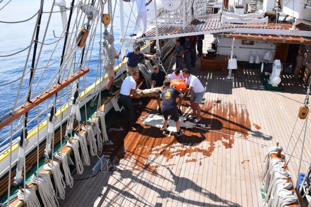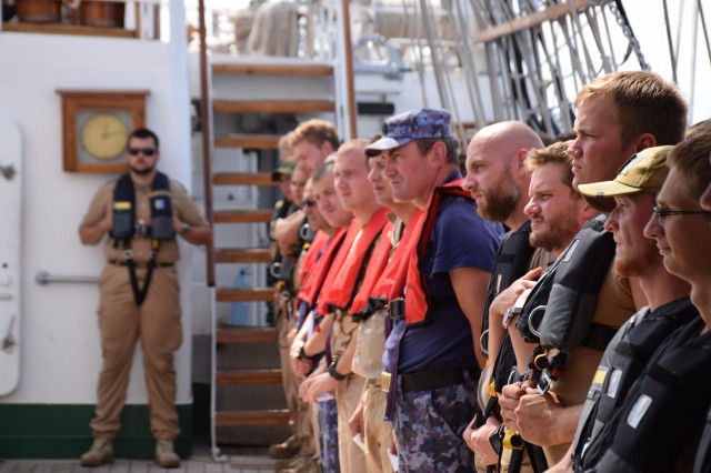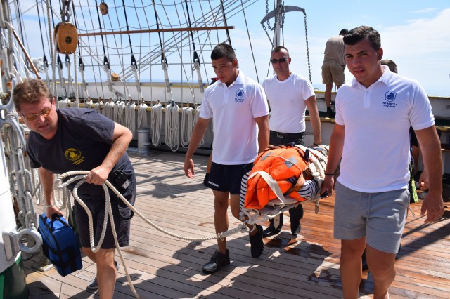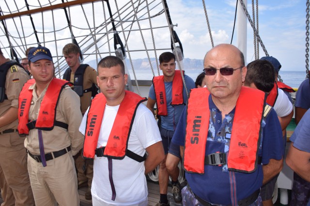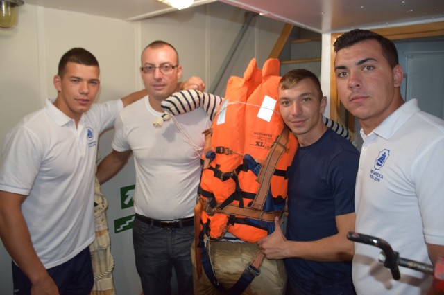 Până în prânz, are loc primul exercițiu al zilei, este vorba de cel de abandon al navei executat invariabil după ce părăsim fiecare port parcă pentru a ne reconecta cu viața la bord și pericolele navigației pe mare. Urmează aproape imediat cel de om la apă, exercițiu condus și executat de data aceasta de partea română. În prova babord, caporalul Gheorghiță Nechita, ajutorul șefului de echipaj, îi face vânt peste copastie vechiului prieten Oscar, îmbrăcat „regulamentar” cu tricou de marinar și vestă de salvare. Desigur, este vorba despre un manechin, denumit Oscar, și folosit la astfel de exerciții. Strigătul „Om la apă!” răsună pe toate punțile, se aruncă colacul de salvare, nava execută o girație simplă, bombardul este coborât rapid la apă (13 minute a durat, dar nu atât de rapid conform procedurilor în astfel de cazuri și pentru secundul navei, căpitanul Florin Albici, care a ținut să precizeze acest lucru la adunarea de la ora 16, cu alte cuvinte, după patru zile de escală echipajul trebuie să-și intre rapid în ritm), cu scafandru, „omul” recuperat cu barca și adus la bord, unde echipa sanitarului principal al navei, plutonierul adjutant principal Daniel Flueraru, formată numai din ospătari (aminteam într-o corespondență de rolul fiecăruia pe navă și de faptul că ospătarii, ca și bucătarii, nu sunt doar... ospătari la bord) transportă pacientul cu ajutorul tărgii Neil-Robertson în infirmerie. Ca de obicei, cadeții români și germani, dar și echipajul au asistat la toate momentele exercițiului de pe puntea centru sau puntea dunetă.