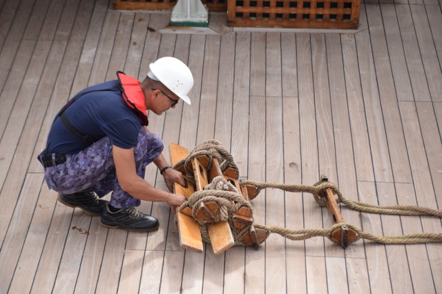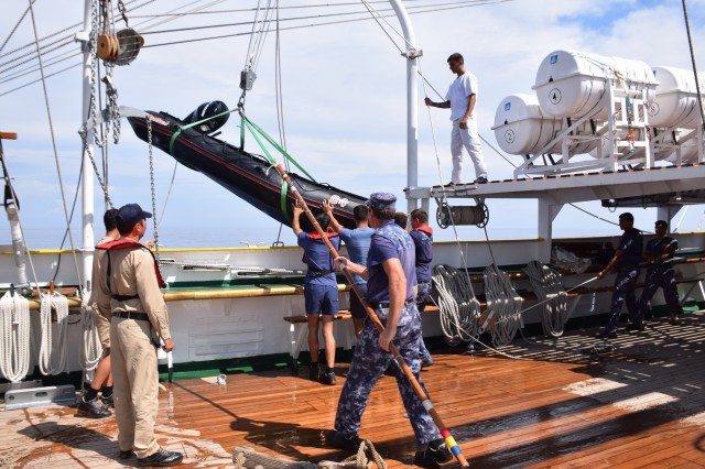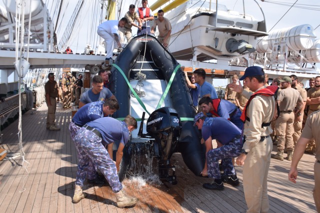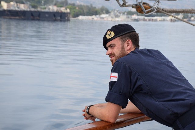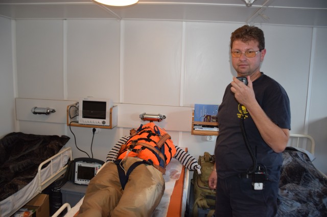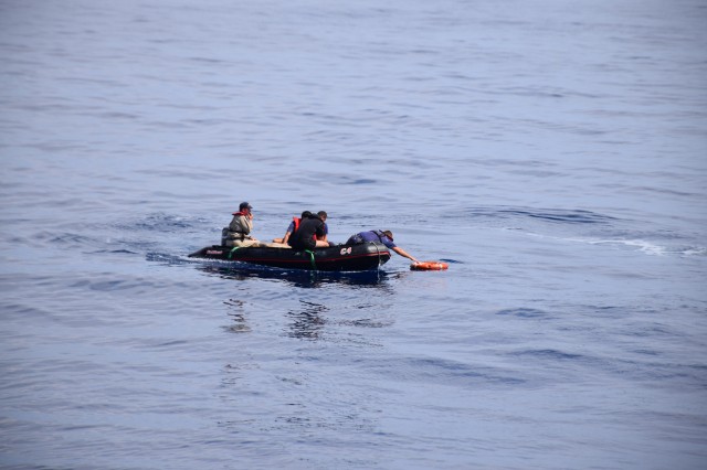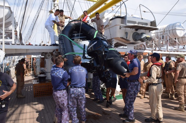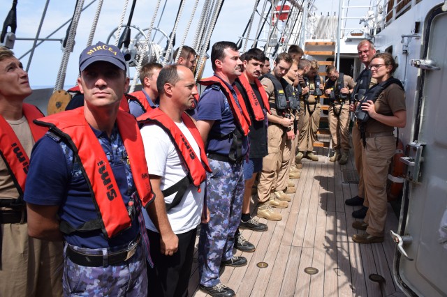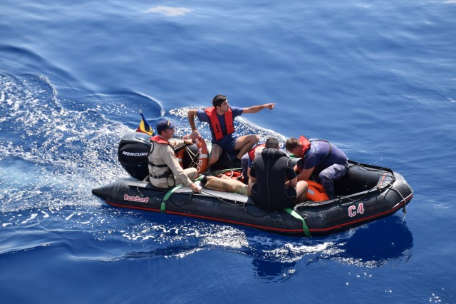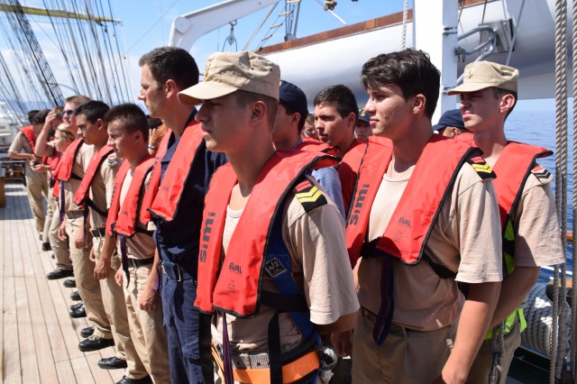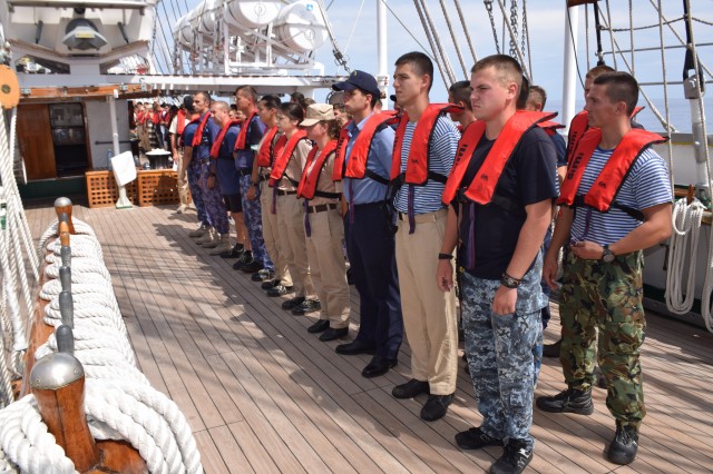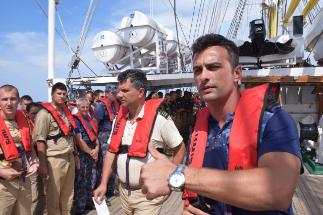 Până în prânz, are loc primul exercițiu al zilei, este vorba de cel de abandon al navei executat invariabil după ce părăsim fiecare port parcă pentru a ne reconecta cu viața la bord și pericolele navigației pe mare. Urmează aproape imediat cel de om la apă, exercițiu condus și executat de data aceasta de partea română. În prova babord, caporalul Gheorghiță Nechita, ajutorul șefului de echipaj, îi face vânt peste copastie vechiului prieten Oscar, îmbrăcat „regulamentar” cu tricou de marinar și vestă de salvare. Desigur, este vorba despre un manechin, denumit Oscar, și folosit la astfel de exerciții. Strigătul „Om la apă!” răsună pe toate punțile, se aruncă colacul de salvare, nava execută o girație simplă, bombardul este coborât rapid la apă (13 minute a durat, dar nu atât de rapid conform procedurilor în astfel de cazuri și pentru secundul navei, căpitanul Florin Albici, care a ținut să precizeze acest lucru la adunarea de la ora 16, cu alte cuvinte, după patru zile de escală echipajul trebuie să-și intre rapid în ritm), cu scafandru, „omul” recuperat cu barca și adus la bord, unde echipa sanitarului principal al navei, plutonierul adjutant principal Daniel Flueraru, formată numai din ospătari (aminteam într-o corespondență de rolul fiecăruia pe navă și de faptul că ospătarii, ca și bucătarii, nu sunt doar... ospătari la bord) transportă pacientul cu ajutorul tărgii Neil-Robertson în infirmerie. Ca de obicei, cadeții români și germani, dar și echipajul au asistat la toate momentele exercițiului de pe puntea centru sau puntea dunetă.