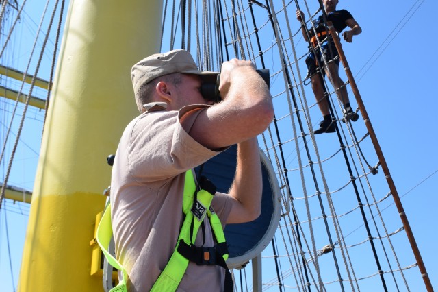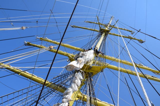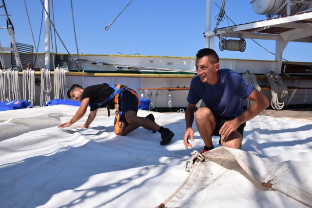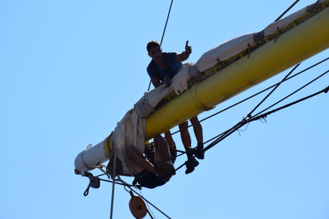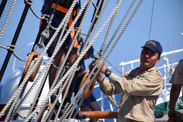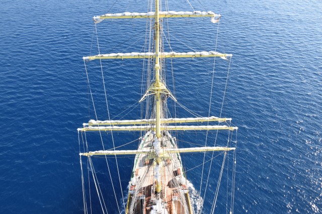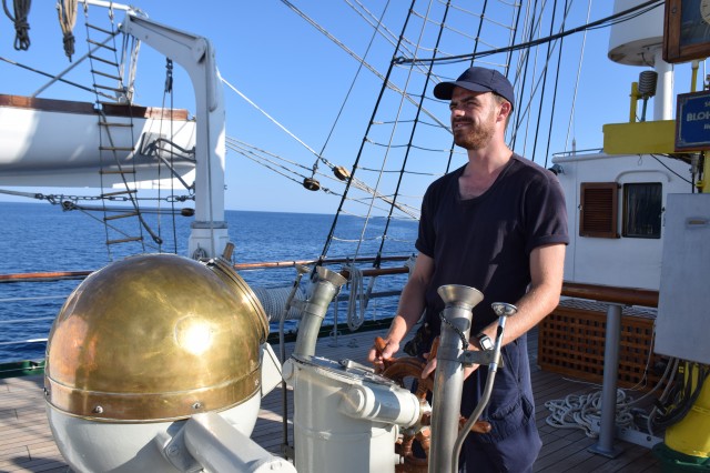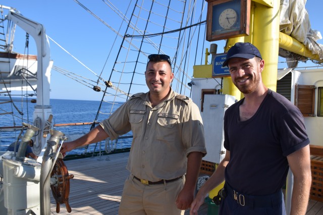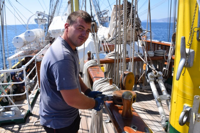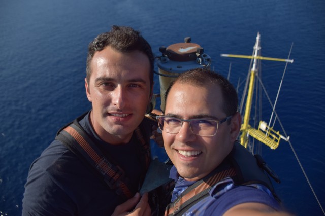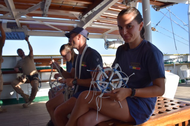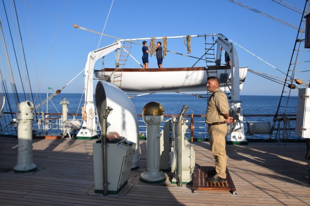 Tot dimineață, căpitanul Sergiu Șerban de la Academia Navală „Mircea cel Bătrân”, dar comandant Serviciu de Luptă Operații (și instructor superior) în acest marș, urcă până la mărul catargului mare (așa cum a făcut-o și în marșul din 2015), pentru a retrăi senzațiile din urmă cu zece ani, când era cadet în marșul de instrucție din anul 2008. Este însoțit de căpitanul Florin Albici, tânărul ofițer secund al bordului, iar imaginile sunt surprinse la intrarea în Strâmtoarea Kafirea. Indiferent de funcțiile pe care le ocupă în prezent, sunt oarecum privilegiați, deoarece spre deosebire de colegii de generație, fac parte dintre cei care își pot retrăi cadeția de la bordul Navei-Școală „Mircea”.