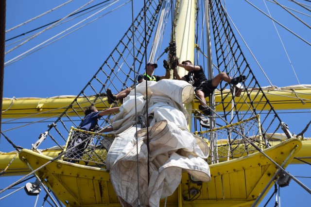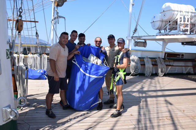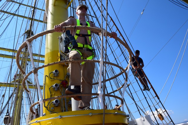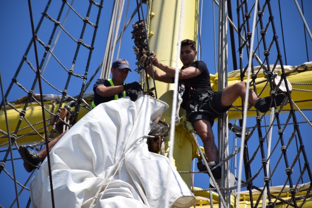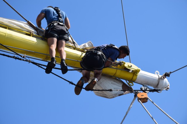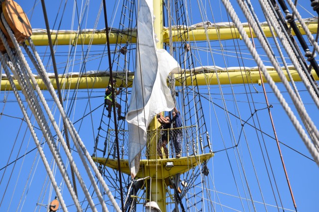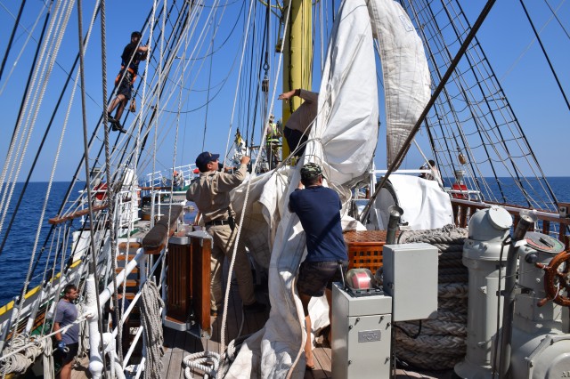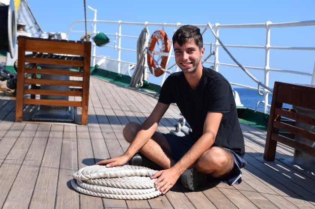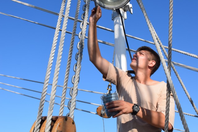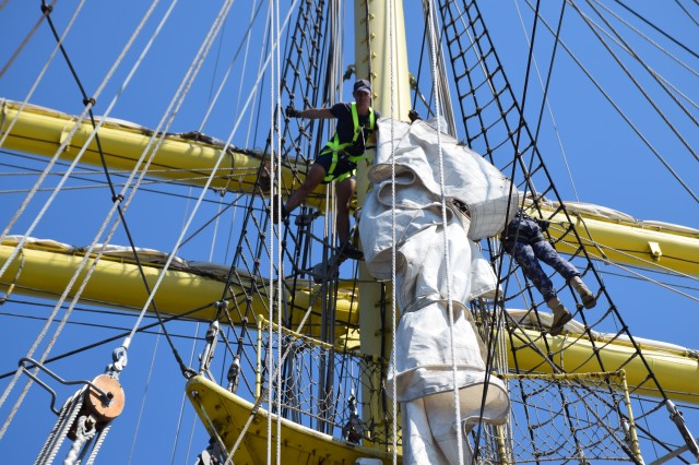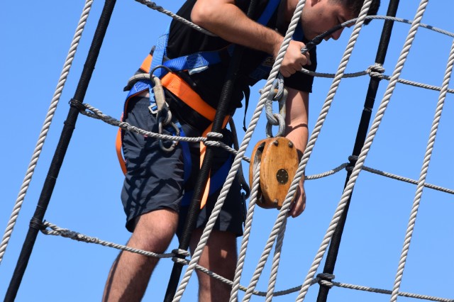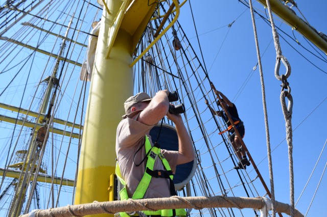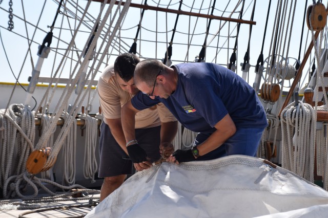 Tot dimineață, căpitanul Sergiu Șerban de la Academia Navală „Mircea cel Bătrân”, dar comandant Serviciu de Luptă Operații (și instructor superior) în acest marș, urcă până la mărul catargului mare (așa cum a făcut-o și în marșul din 2015), pentru a retrăi senzațiile din urmă cu zece ani, când era cadet în marșul de instrucție din anul 2008. Este însoțit de căpitanul Florin Albici, tânărul ofițer secund al bordului, iar imaginile sunt surprinse la intrarea în Strâmtoarea Kafirea. Indiferent de funcțiile pe care le ocupă în prezent, sunt oarecum privilegiați, deoarece spre deosebire de colegii de generație, fac parte dintre cei care își pot retrăi cadeția de la bordul Navei-Școală „Mircea”.
