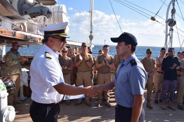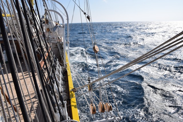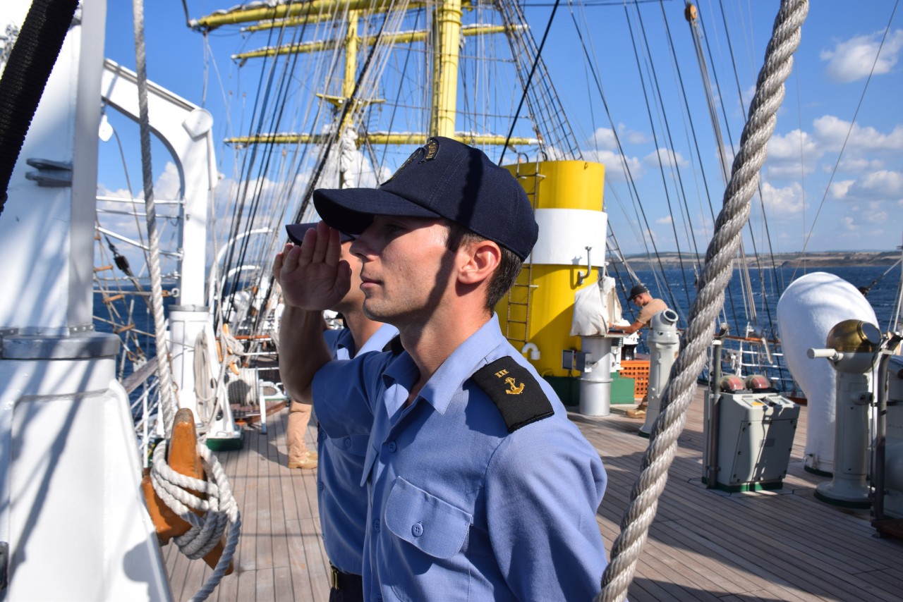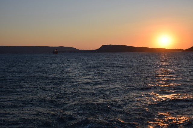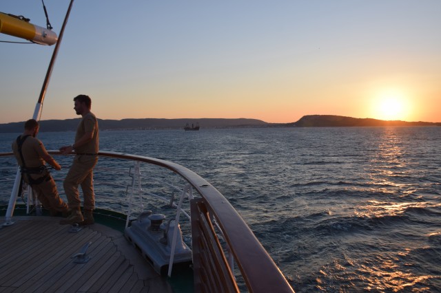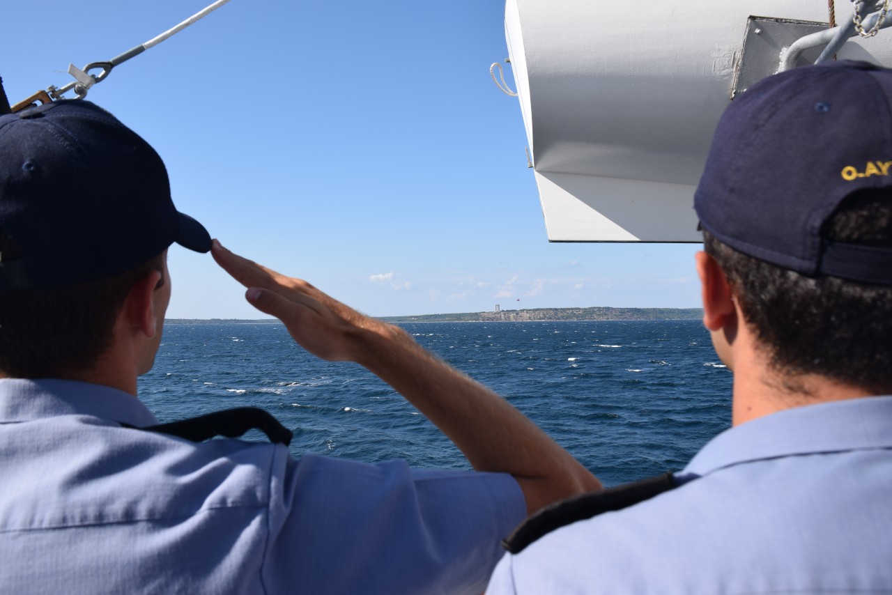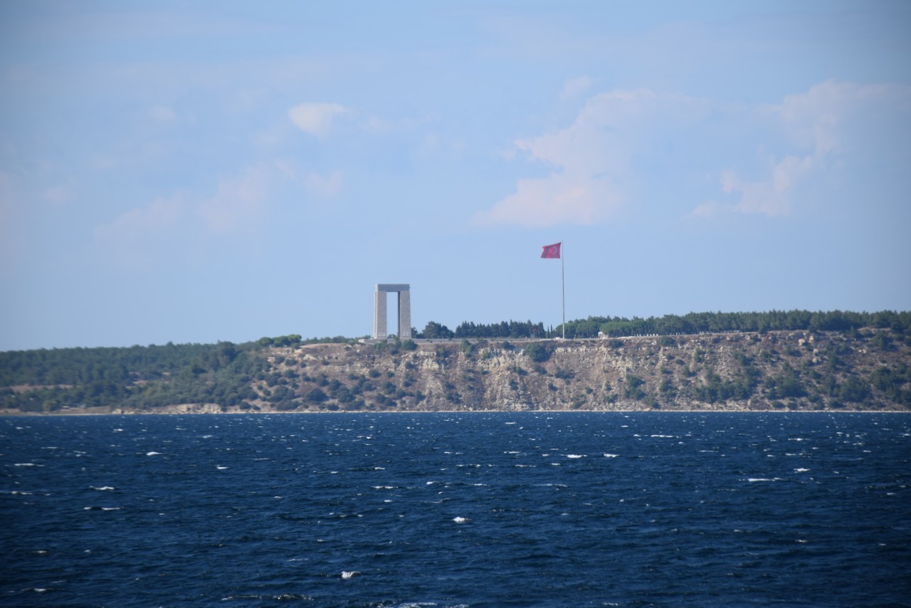 Dimineața devreme, luni 17 septembrie, început de săptămână, la ora șase ridicăm ancora de lângă insula Limnos și începem să parcurgem ultimele mile în Marea Egee, înainte de a intra în Dardanele. Sunt și cele mai dificile. Vântul bate puternic cu 21 de noduri din direcția nord-est, adică direct din prova noastră, iar marea s-a montat bine, este deja de gradul 2-3, dar ajunge repede și trece și de gradul 3. Mașina este toată înainte, dar din cauza vântului (valurile nu sunt deocamdată foarte mari în prova), nu reușim să avem o viteză mai mare de 5,6 noduri. Mai târziu, vântul atinge și 26 de noduri. Cu vergile brațate la tribord, ne croim drum încet prin marea înspumată. La ora 16, suntem în gura Dardanelelor și ambarcăm pilot la bord. Surprinzător pentru cei prezenți pe dunetă, când ajungem travers de impozantul monument turcesc de la intrarea în Dardanele, cei doi cadeți turci, Onur Aydinli și Selcuk Erim, iau poziția de drepți și salută. Rămân în aceeași poziție până îl lăsăm la babord, iar mai târziu îmi explică că astfel se întâmplă la toate navele militare, dar și civile turcești, în astfel de momente. Patriotism? Respect? Probabil amândouă. Dacă tot am amintit de gloria vechiului Imperiu Otoman, să mai precizăm că azi sărbătoritul bordului este chiar cadetul turc Aydinli Onur, care a împlinit 21 de ani la trecerea prin Dardanele. Frumoasă coincidență! La Canakkale, vântul scade la jumătate, dar datorită curentului nu avem o viteză mai mare de 6,5 noduri cu mașina toată înainte. Abia mult după apusul soarelui, în jur de ora 22, intrăm în Marea Marmara. La asfințit, după ce au învățat toată ziua, studenții se relaxează la puntea centru și speră la subiecte ușoare la examenul de mâine.