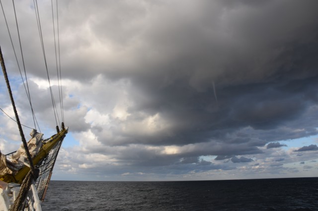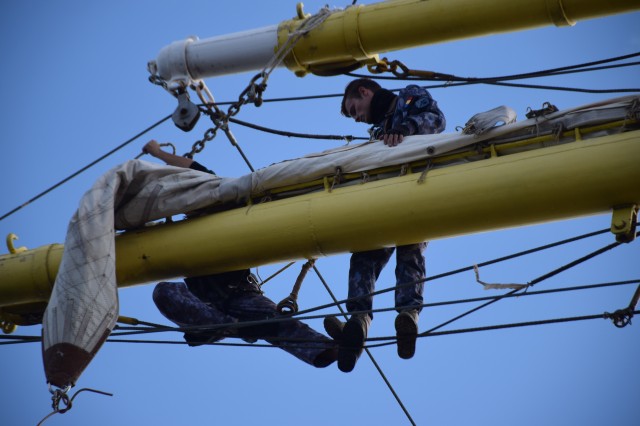 Navigăm în Marea Neagră, în ultima zi a marșului, 19 septembrie. Mâine dimineață vom intra în portul Constanța și vom pune punct și celui de-al doilea marș de instrucție al anului. Dar, deocamdată, în dimineața aceasta, suntem în mare liberă și navigăm cu motor, undeva la 35 de mile travers de portul Burgas. Am schimbat puțin de drum spre nord-est, pentru a avea vântul din pupa și a continua, astfel, dezvergarea ultimelor vele pătrate de pe cei doi arbori, contargabierul, gabierul și vela mare. Ca de obicei, după amiază, urmează o curățenie generală pe navă.