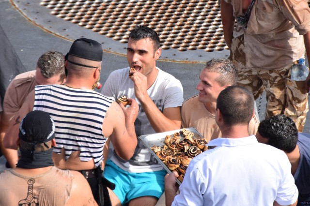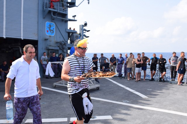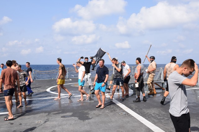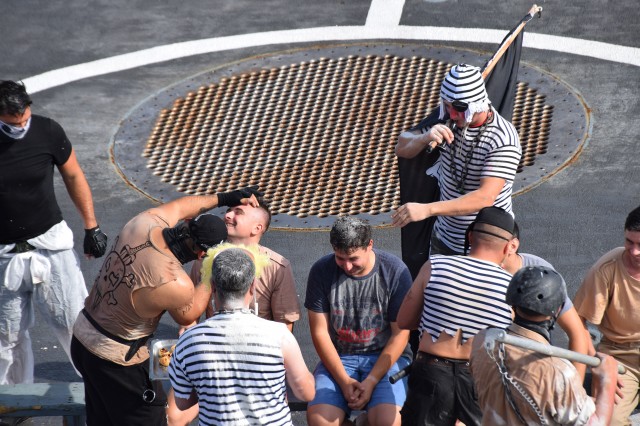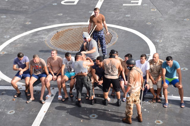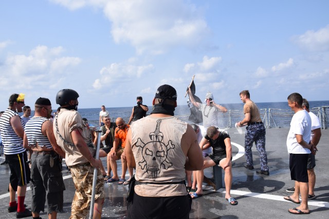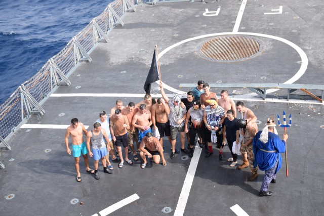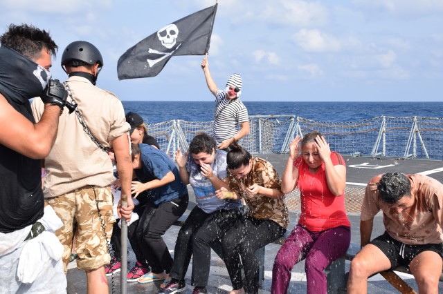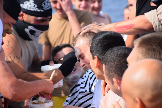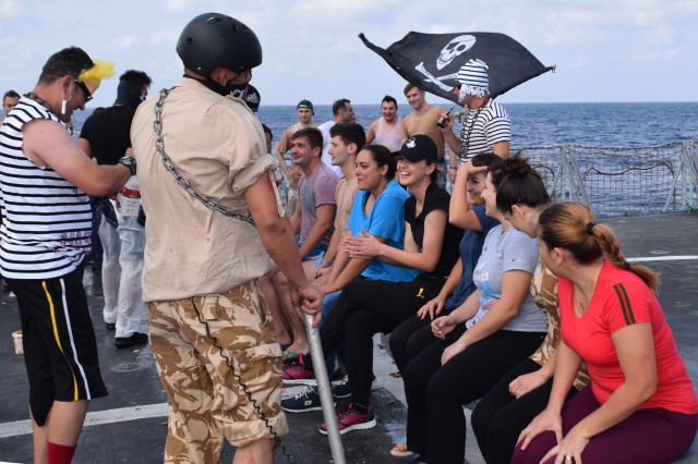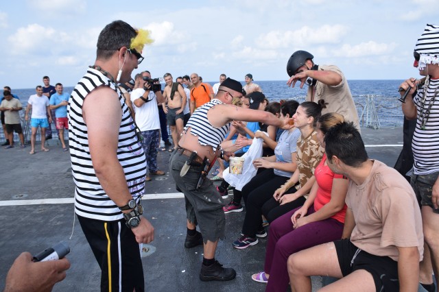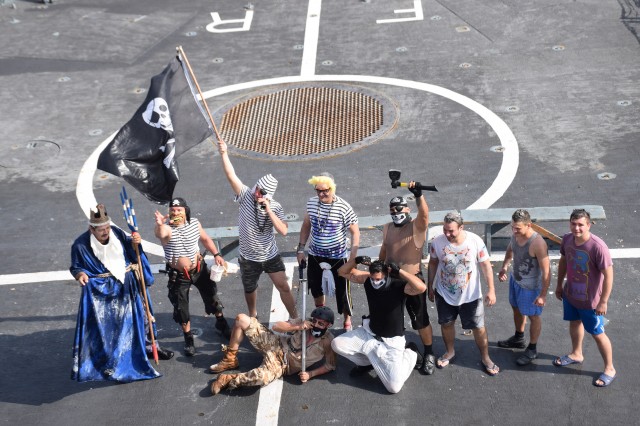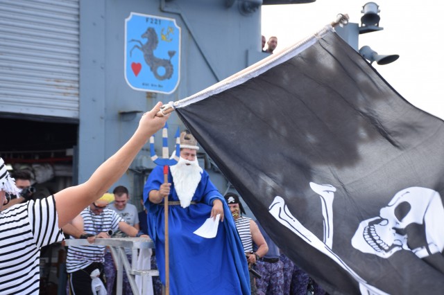 Cu o zi înainte ca fregata „Regele Ferdinand” să intre în portul Taranto, pentru o ultimă escală înainte de revenirea în portul Constanţa, nava românească a fost interceptată de „piraţi”. Era o după amiază însorită pe albastrul Mediteranei, atunci când la bordul navei s-a anunţat că „piraţii” au urcat la bord; îi însoţea însuşi Zeul Neptun, înfuriat că mateloţi fără experienţa navigaţiei în Mediterană au îndrăznit să se avânte până aici. Pe puntea heliport a fregatei, au fost aduşi toţi cei care s-au aflat la prima misiune în Mediterană sau care au navigat aici, dar fără să-şi fi primit botezul marinăresc.