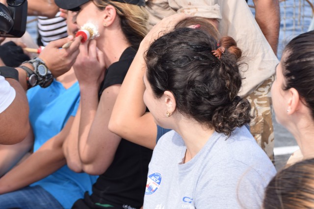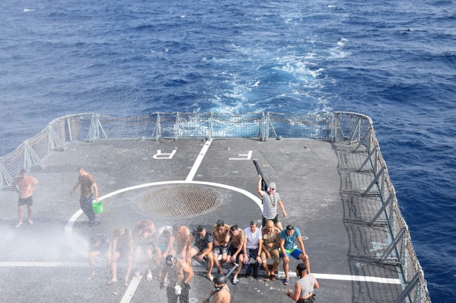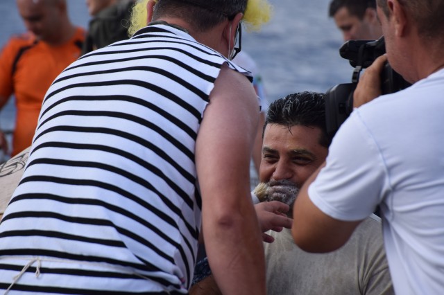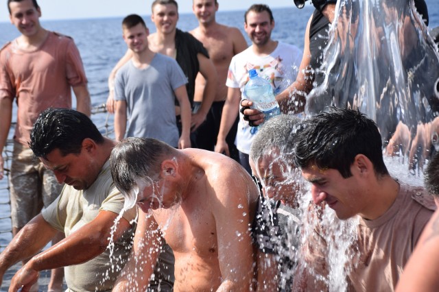 Ce a urmat, este lesne de înţeles. Neptun a dat citire ordinului prin care toţi cei care nu au primit botezul său, să i se supună. Prăjituri cu ardei iute, vin cu fel de fel de ingrediente greu de digerat, apă de mare, spumă făcută din detergenţii de la bord, înlăturată de pe faţa mateloţilor cu satârul, un amestec ciudat cu aspect de vaselină, făină, ouă şi apă, multă apă... prin asta au avut de trecut aproape jumătate dintre membrii echipajului. Nimeni însă nu s-a împotrivit, astfel, că la finalul zilei, toţi membrii echipajului aveau certificat de botez semnat de Zeul Neptun.