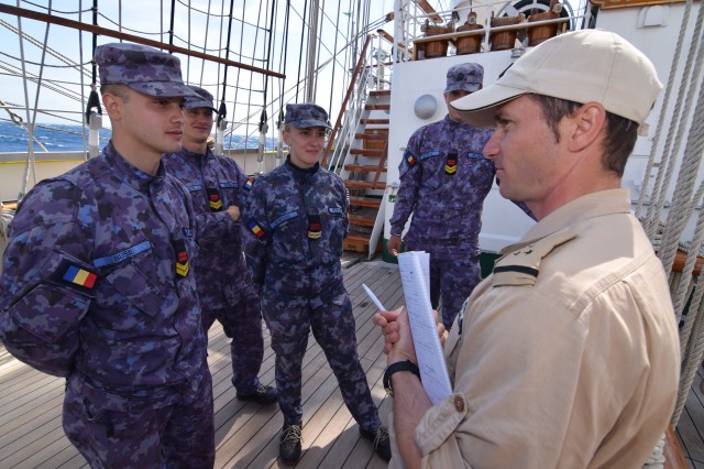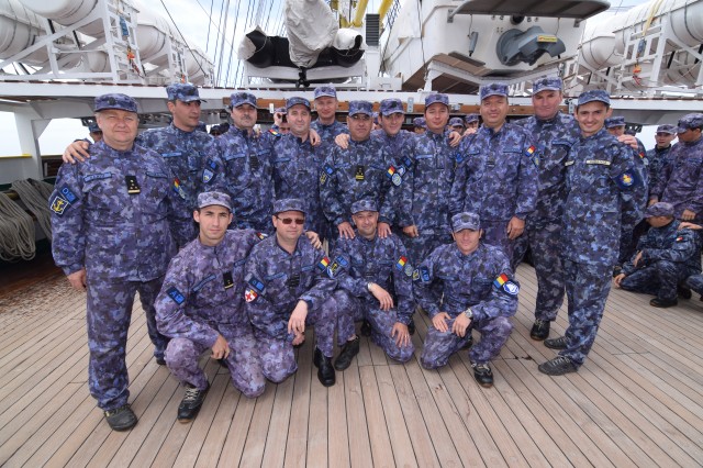 Pentru aproape două zile după plecarea din Siracusa din 14 mai vremea a fost frumoasă și marea la fel. Pe înserat traversam Strâmtoarea Messina, iar noaptea doar puteam ghici undeva la tribord insula și vulcanul Stromboli. Parcă pentru a confirma ceea ce italienii numesc vremea capricioasa de primăvara - maledetta primavera, marea s-a „stricat” tot mai rău pe măsură ce ne îndepărtam de nordul insulei Sicilia și ne îndreptam spre sudul Sardiniei, prin Marea Tireniană. În următoarele zile și nopți marea a fost în permanență de gradul 3 spre 4, uneori chiar de 5, cu un vânt păcătos de travers și o hulă exasperantă, cu valurile aruncând bătrânul nostru velier în toate părțile. Pe navă răsună în mod repetat ordinul de amarare a tuturor obiectelor de la bord, iar răul de mare, în toate formele sale, pune stăpânire pe cadeți și o parte din echipaj, deopotrivă. Bătrânii „lupi de mare” îi încurajează pe mai tinerii colegi marinari; la bord sunt mulți ofițeri tineri, fie din echipajul permanent al navei, fie dintre cei detașați. Sunt nu mai puțin de patru aspiranți, dintre care trei au terminat anul acesta Școala de Aplicație, dar și trei locotenenți. Unii dintre ei, evident, că suferă de răul de mare care nu își alege victimele. Maistrul militar principal Corneliu Dumitriu, cel mai vechi din actualul echipaj, care mai are doar șase luni până la data când poate trece în rezervă, îi încurajează pe aspiranții din cart spunându-le că au 30 de ani să se obișnuiască cu acesta! Dar carturile sunt carturi, toată lumea își face treaba, nu au existat cazuri severe care să necesite intervenția doctorului marșului, colonelul medic Eduard Moise, în afară de distribuirea unor pastile. Elevul fruntaș Ionuț Bogdan Blaj de la Școala Militară de Maiștri Militari a Forțelor Navale Amiral Ion Murgescu: „A fost cea mai grea noapte de până acum, am avut și „fericirea” de a fi de serviciu ca timonier de cart schimbul doi chiar pe marea aceasta grea; a fost ceva deosebit, n-am prea văzut așa ceva până acum, am înfruntat marea. Am înțeles că fost și de gradul 5, nu e ceva ce vezi în fiecare zi, trebuie să te ții bine pe picioare, te face să te simți mai bărbat. Orele din cart au trecut greu, m-am străduit să mă țin pe picioare și am rămas la post, pentru militarul nu iese din post niciodată, mereu duce misiunea la bun sfârșit. Unii dintre colegi sunt mai bine, alții mai rău. La bord se mănâncă bine, mai ales masa specială din ziua de ieri, când nava a sărbătorit 80 de ani, chiar dacă unii, ca să mă exprim elegant, „au dat-o înapoi.” Să vedem, însa, cum au făcut față fetele primului test de marinărie la bord. Studenta caporal Sorina Florentina Băcanu de la Academia Navală Mircea cel Bătrân ne-a declarat: „Am fost veghe prova azi noapte, patru ore, tot de la ora 12 la 4; au fost cele mai grele ore, marea a fost foarte agitată. Am reușit să ”fur” două ore de somn azi noapte, dar încă mă țin bine. Acum avem curățenie generală și trebuie să facem față, să ne descurcăm. Și colegele mele sunt bine, câteva dintre ele sunt mai „lovite”, dar cu pastilele, ne descurcăm. Mă gândesc că o astfel de experiență ne întărește, după atâta chin ne vom descurca mai bine în viitor. Nu ne sperie Atlanticul, mai rău de atât nu poate fi.”