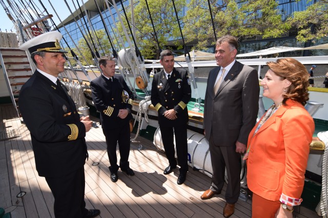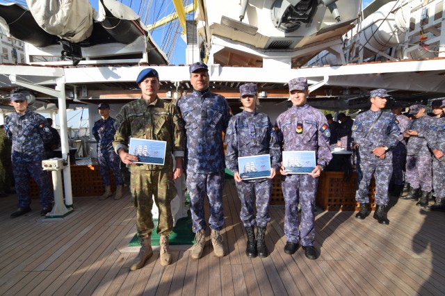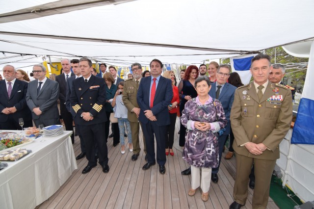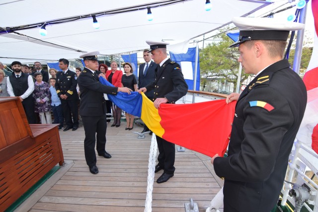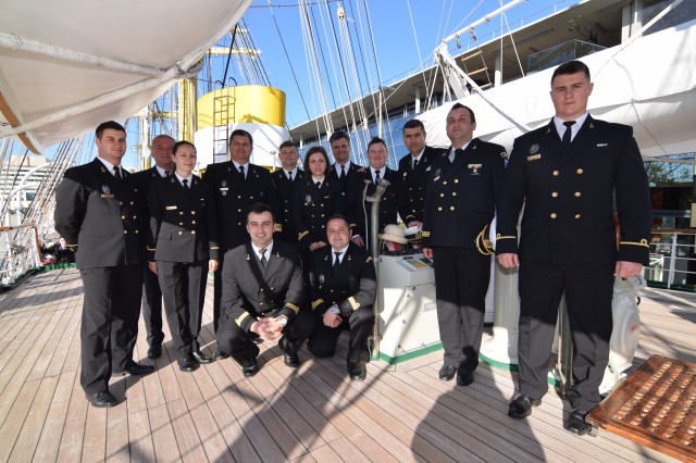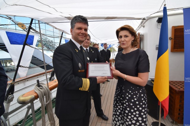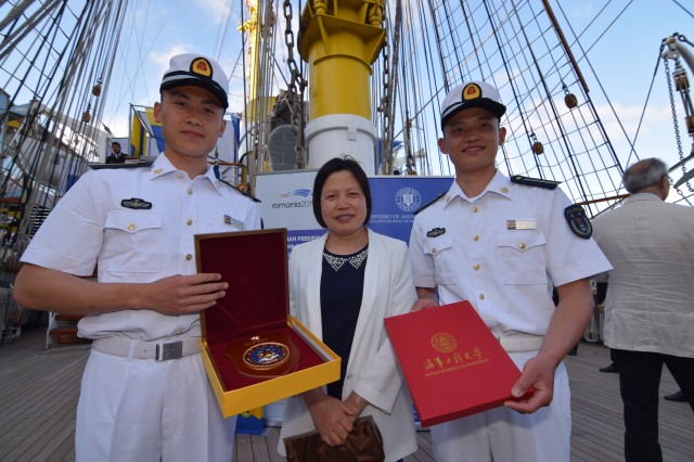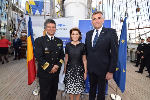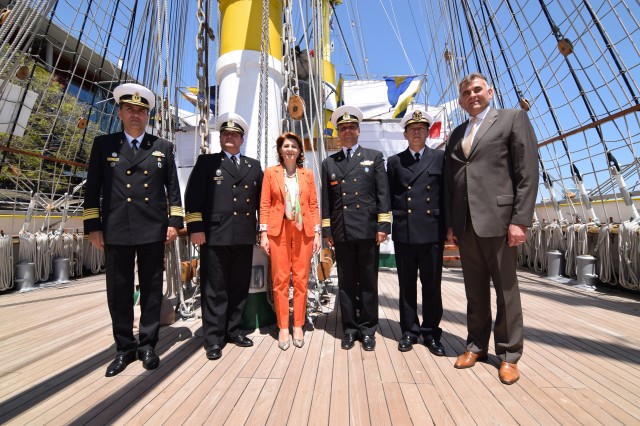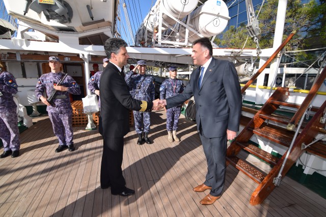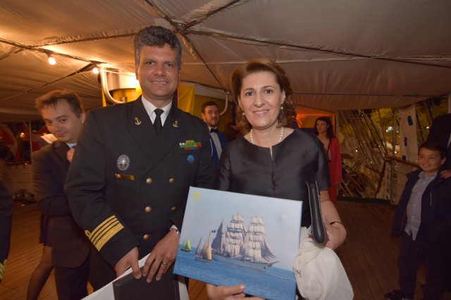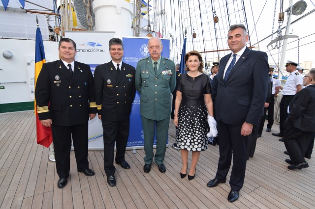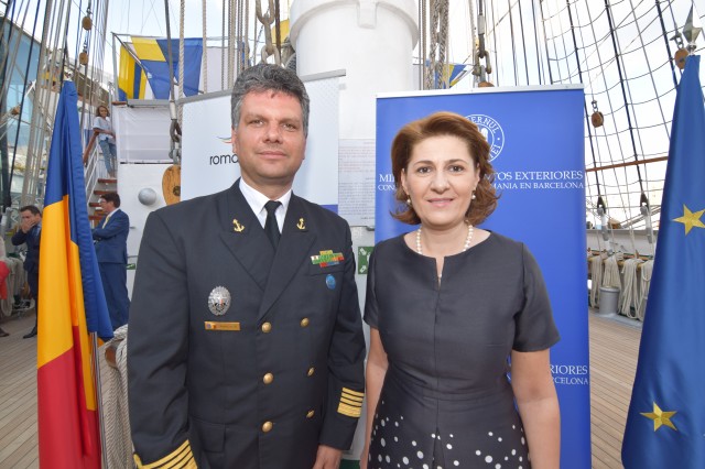 Recepția a fost una de succes, pe timpul căreia au ținut scurte discursuri E.S. doamna Gabriela Dancău, domnul Manuel Pleșca și comandorul Mircea Târhoacă, comandantul navei. S-a cântat românește, în afara corului cadeților care a interpretat o serie de cântece marinărești, au fost și alte momente muzicale interpretate cu talent de unii membri ai echipajului. De asemenea, comandantul navei a primit din partea doamnei ambasador o plachetă în amintirea acestei escale și a celor 80 de ani de existență a navei. Au participat comandanții și reprezentanții autorităților militare si civile din Barcelona, precum și reprezentanții diplomatici ai consulatelor din orașul catalan. Printre acestia, am remarcat prezența consulului general al Ucrainei, doamna Oksana Dramaretskaia, al consulului onorific al Albaniei, Jose Maria Clamet sau al consulului general adjunct al Chinei, care au purtat discuții cu cadeții din propriile țari ambarcați la bord pentru acest marș de instrucție.