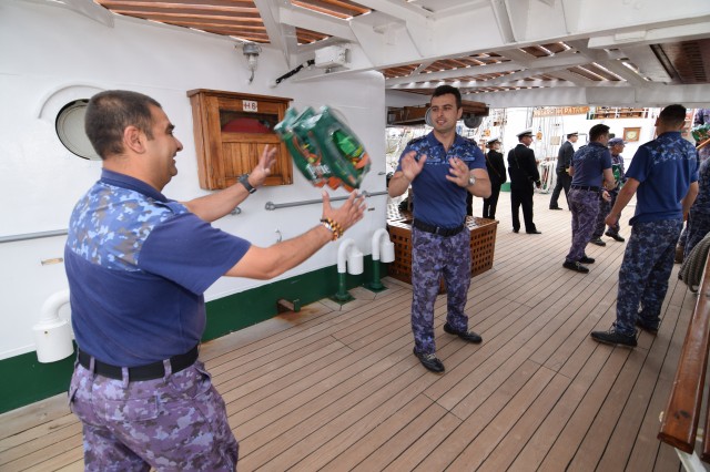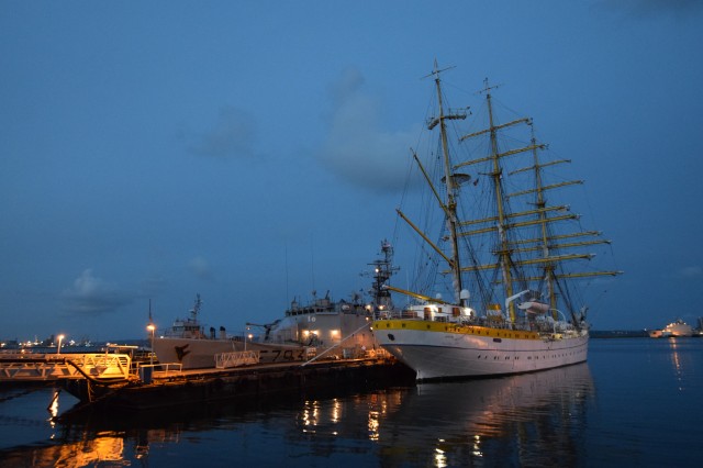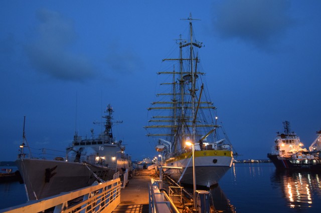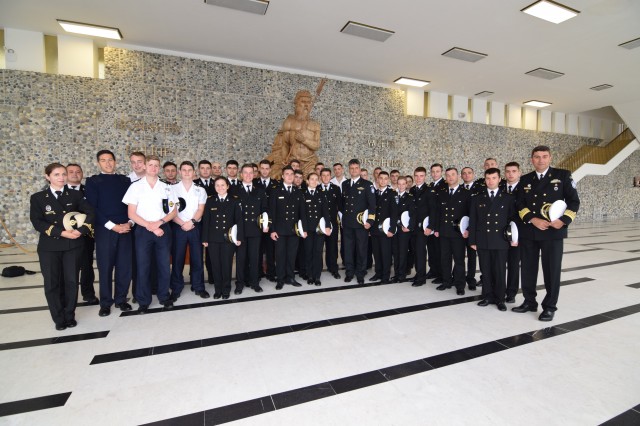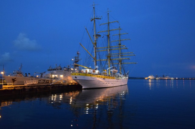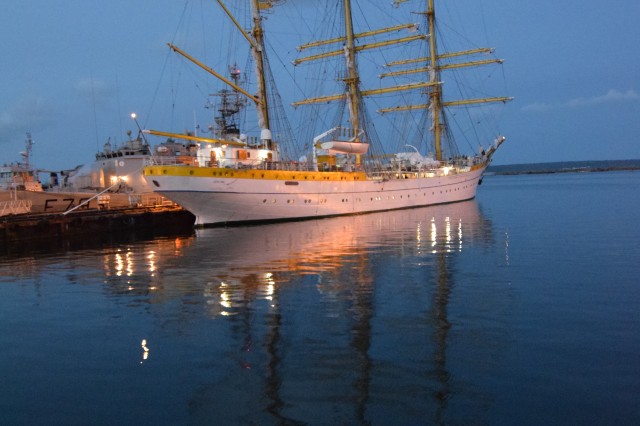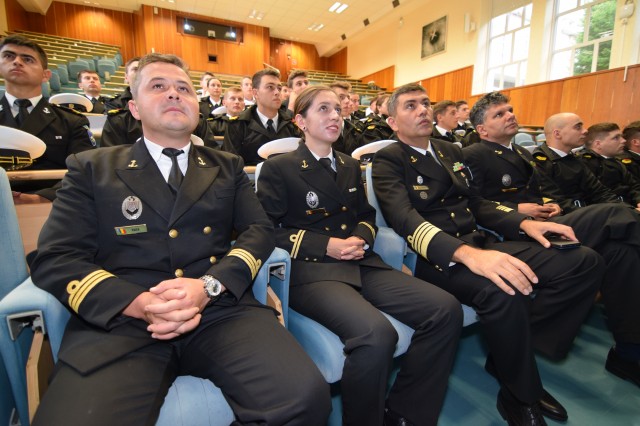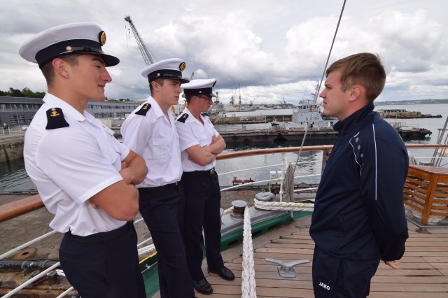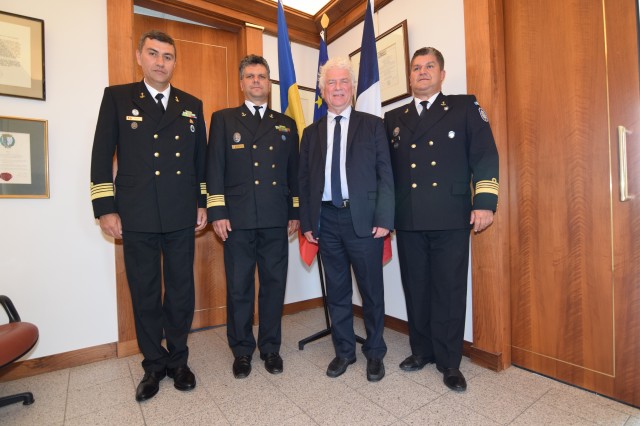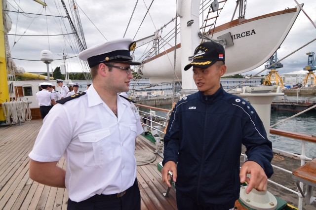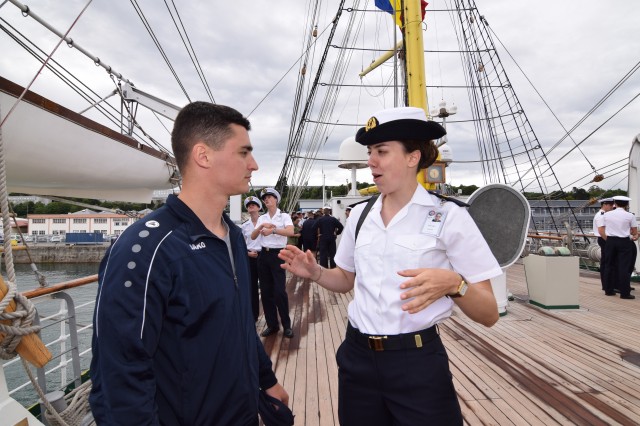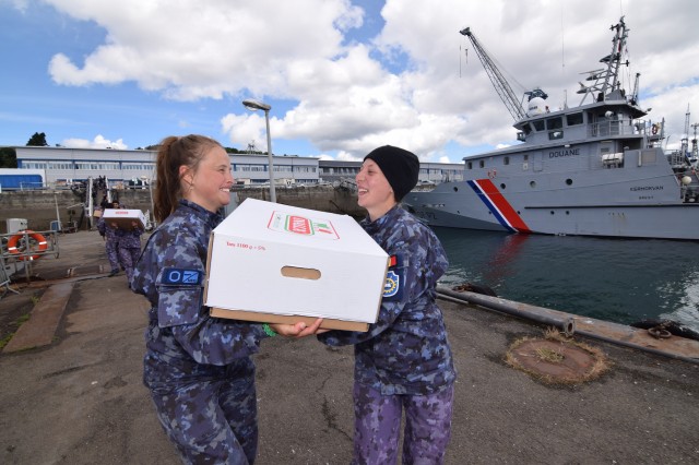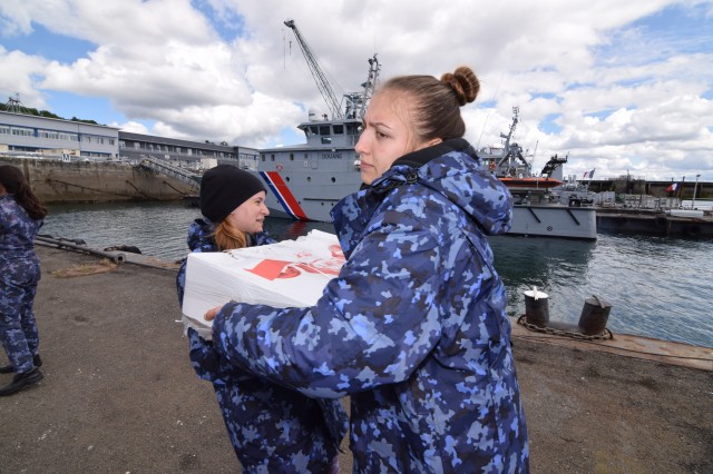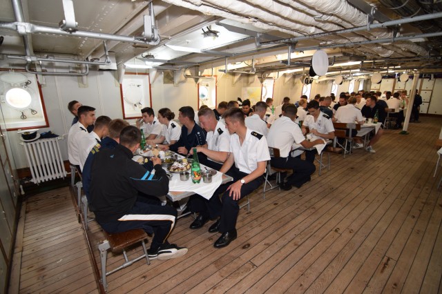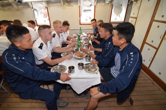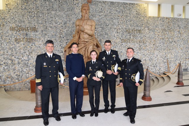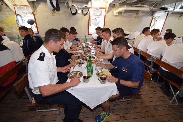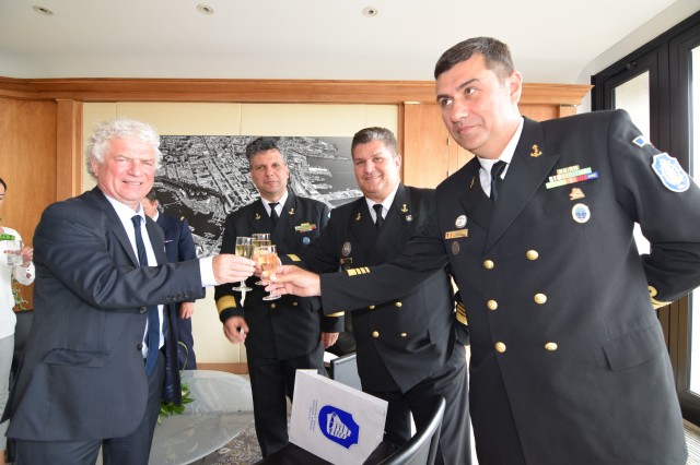 Spre seară cadeții români au revenit la bord dar nu singuri, ci însoțiți de 38 de colegi francezi de la Școala Navală. Ai noștri au fost gazdele perfecte, le-au prezentat nava de la prova la pupa, au râs, au glumit, au făcut fotografii după care au coborât în cazarmă și au luat masa împreună. O experiență incredibilă pentru toți, pentru câteva ore au format un ”echipaj” cu adevărat internațional: români, francezi, albanezi, chinezi, bulgari și ucraineni. S-au simțit bine și, chiar dacă nu vă vine să credeți, francezii au apreciat la superlativ mâncarea românească. Comandorul Gabriel Duță, șeful practicii de la bord: „Neașteptată și pentru noi a fost atitudinea studenților francezi care, după câteva meciuri amicale de volei și un concurs de orientare în echipe mixte, au fost invitați la masă la bord și au petrecut câteva ore agreabile, i-am urmărit cu toții, în compania cadeților români.” În același timp avea loc și o cină oficială la bord oferită autorităților militare franceze și la care au fost prezenți comandorul Xavier Mazauric, comandantul bazei navale, locotenent-comandorul Thomas Vuong, locotenent-comandorul Pelatan, doamna Fiona Simoneau-Byrne, toți de la Școala Navală, Sorin Moga și ofițerul nostru de legătură, căpitanul Jean-Francoise Jaouen.