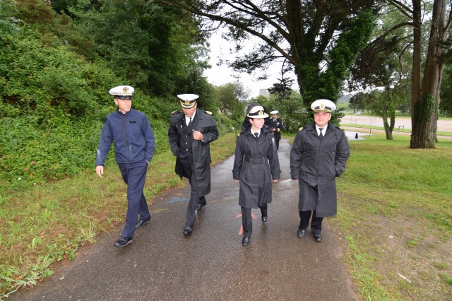 Revenind la escala de acum, trebuie să precizăm că a fost organizată prin eforturile domnului Sorin Moga, fostul consul onorific al României la Brest (din 2008 și până anul trecut, când consulatul a fost mutat la Rennes) și care a fost cel care a depus toate eforturile pentru ca șederea noastră aici și programul oficial să decurgă cât mai bine. A fost o escală tehnică, dar cu foarte multe activități, atât cu Marina Militară franceză și Școala Navală, cât și cu comunitatea românească din zonă. Aproape imediat după acostare, am fost primiți chiar în clădirea de secol XVIII a primului port militar de către domnul comandor Xavier Mazauric, comandantul Bazei Navale Brest, cea mai mare de la litoralul atlantic al Franței. Să menționăm că, este pentru prima dată când nava noastră acostează în baza navală, la precedentele escale fiind acostați la cheul de la poalele castelului construit de Vauban, chiar lângă podul Recouvrance, singura zonă care a rămas intactă după bombardamentele aeriene ale aliaților și asediul orașului până la capitularea germanilor în septembrie 1944. Baza navală este mare. Ca o curiozitate, aici se află și unele din faimoasele adăposturi ale submarinelor germane din al doilea război mondial - ținta atacurilor aeriene asupra orașului – iar traficul naval militar este unul semnificativ, cu numeroase intrări și ieșiri de nave. La pontonul de la cheul K am stat alături de avizoul Comandant Blaison, o mai veche cunoștință a marinarilor militari români datorită escalelor din Constanța din ultimii 25 de ani. Tot în prima zi 40 dintre cadeții noștri au plecat cu o navă de transport persoane (pe apă drumul este mai scurt cu o oră decât pe uscat) la Școala Navală din Lanveoc-Poulmic - aflată pe o peninsulă, un domeniu de câteva zeci de hectare și asupra căreia o să revin mai jos – pentru a participa la competiții sportive cu colegii francezi. Fiind o escală tehnică, aici s-au făcut și plinurile la combustibil și alimente. O imagine frumoasă a tuturor membrilor echipajului disponibili, inclusiv maiștri militari și ofițeri, ”all hands” cum spun britanicii, înșirați pe cheu și ponton aducând la bord proviziile, o altă expresie a spiritului Mircea și coeziunii echipajului.