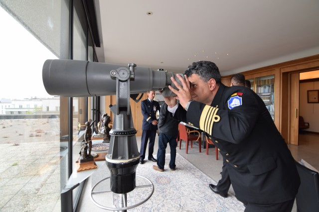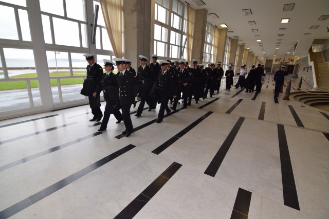 Furtuna Miguel care venea pe urmele noastre din Biscaya a ajuns în a doua zi a escalei și la Brest unde a plouat torențial pe tot parcursul zilei. Asta nu a împiedicat ca o nouă delegație de cadeți și ofițeri români să viziteze Școala Navala pe parcursul câtorva ore. Instituția de învățământ militar de marină de aici, Ecole Navale – Grande Ecole Militaire de la Mer cum se prezintă, își respectă blazonul și istoria de aproape 190 de ani fiind înființată în 1830. Chiar dacă tot timpul a funcționat la Brest – cu excepția celui de-al doilea război mondial – aici la Lanveoc este cea de a treia locație în care se află. Un spațiu imens, cu toate facilitățile necesare instruirii celor peste 1300 de cursanți: săli de sport, laboratoare, simulatoare, poligon de tragere, propriul port cu zeci de ambarcațiuni, spații de cazare, amfiteatre, etc. toate foarte moderne și la cele mai înalte standarde. Gazda noastră a fost locotenent-comandorul Thomas Vuong, comandantul studenților, care ne-a făcut un tur complet în timp ce cadeții noștri au făcut același lucru dar împreună cu colegii lor francezi din anul I. O experiență interesantă și suntem convinși că în viitorul apropiat Academia Navala va iniția o colaborare între cele două instituții de elită. Comandorul Gabriel Duță: „Studenții și elevii au fost încântați să descopere că baza materială de instrucție și învățământ de aici de la Ecole Navale este asemănătoare cu cea din Academia Navală Mircea cel Bătrân și Școala Militară de Maistri Militari a Forțelor Navale Amiral Ion Murgescu și chiar aș putea spune că simulatorul integrat de navigație din Academia Navală este chiar mai modern și mai complex decât cel francez. Ne-a impresionat foarte mult în primul rând locația Școlii Navale, un perimetru larg, relativ izolat, pe malul Atlanticului în capătul golfului Brest, înconjurat de pădure, beneficiind de o marină amenajată cu o multitudine de ambarcațiuni cu vele și motor și care stau la dispoziția personalului care se instruiește aici. Am găsit interesantă diversitatea programelor de studii pentru că aici se pregătesc nu numai viitorii ofițeri ai Marinei franceze ci și maiștrii de marină și personalul care urmează diverse cursuri de formare continuă, în jur de 1300 de cursanți în fiecare an. Chiar dacă în acest moment relațiile Academiei Navale cu Școala Navală din Brest nu sunt așa cum ne-am dori să fie, sperăm să le dezvoltăm. Am făcut un prim pas anul acesta și vom ambarca un student francez la bord la Lisabona, în luna iulie, care ne va însoți până la Constanța. Un pas mic poate dar sperăm noi cu o deschidere ulterioară mare. Pot să menționez că și pe durata vizitei noastre la Școala Navală studenții francezi repartizați grupului nostru i-au condus pe cadeții români prin toate facilitățile de învățământ, de cazare sau recreere. Apreciez această vizită ca fiind un succes, cel puțin din punctul de vedere al creării unei imagini în mintea cadeților noștri despre ce înseamnă o școală navală a unei țări cu tradiție în marină și diplomație navală.”