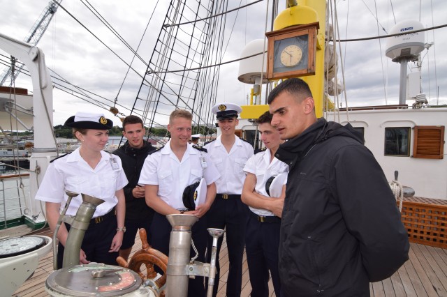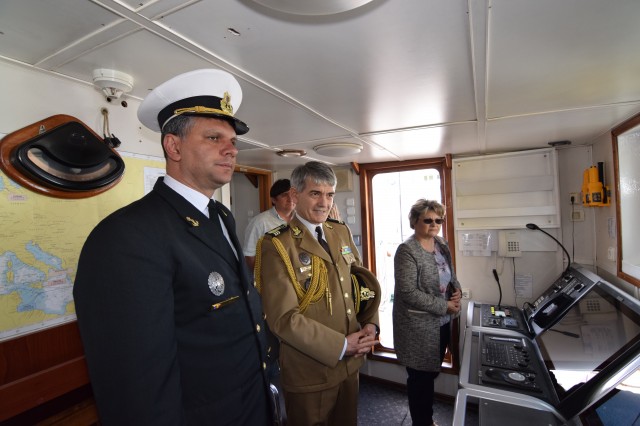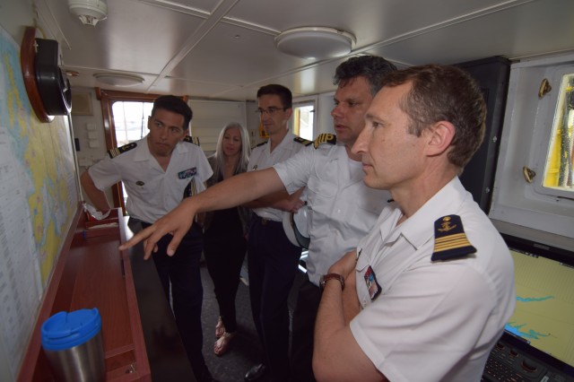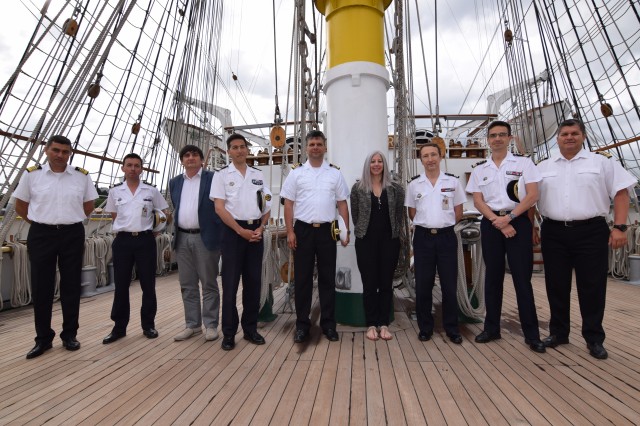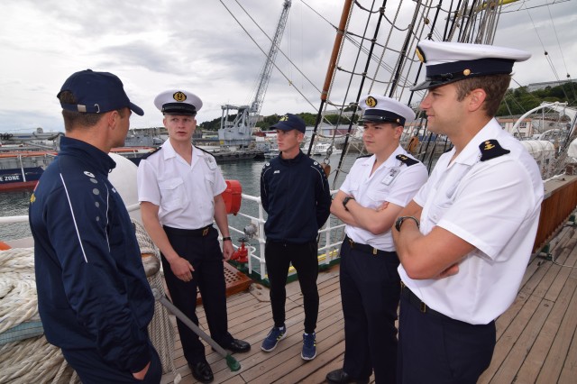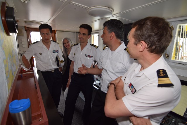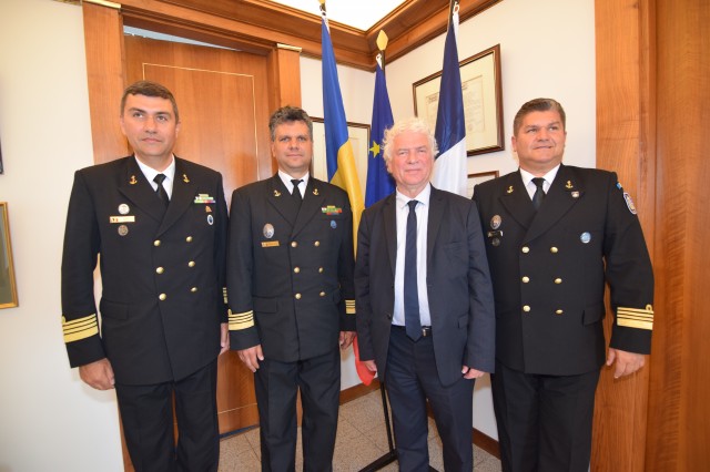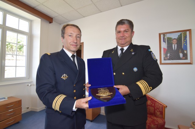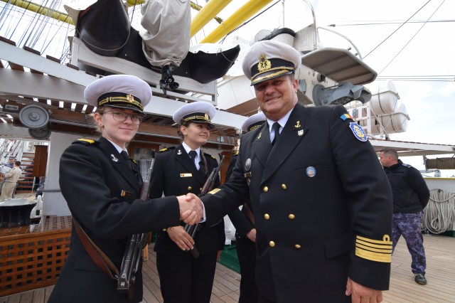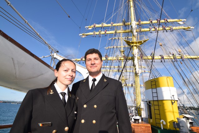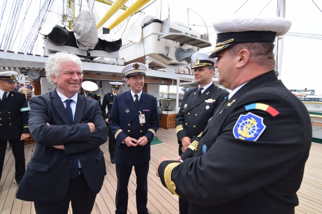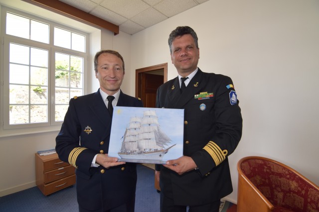 Și aici la Brest nu putea să lipsească din program întâlnirea cu comunitatea românească din zonă. S-a întâmplat în cea de a treia zi când la bord s-au aflat aproximativ 60 de persoane, cetățeni români rezidenți în zona Brestului, care au vizitat nava, au vorbit cu cadeții și membrii echipajului sau au depănat amintiri de la precedenta noastră escală aici din 2008. Domnul Sorin Moga, fostul consul onorific al României la Brest până anul trecut și cel care s-a implicat și anul acesta în organizarea escalei noastre: „Am ținut să organizez această escală în primul rând pentru că sunt român, pentru că trăiesc la Brest, deci sunt locuitor al Bretaniei și am vrut ca eu și comunitatea românească de aici să beneficiem de această oportunitate extraordinară de a vizita nava și a face ca echipajul să se simtă cât mai bine acolo unde trăim noi. Relațiile dintre Brest și România sunt vechi, începute în 1989 când autoritățile locale de atunci au mers în România și s-au oprit la Constanța punând bazele înfrățirii orașului cu Brest iar de atunci România și Constanța sunt foarte bine văzute aici. Acum, în 2019, autoritățile locale au fost mai mult decât entuziasmate de faptul că N.Ș.Mircea s-a oprit în escală la Brest și au considerat asta un semn de mare onoare. În ultima zi am organizat împreună cu asociația Doina Finistere Roumanie, asociația culturală a românilor din Brest, o vizită la N.Ș.Mircea și o întâlnire cu membrii echipajului. Printre participanți s-au aflat ghizi care au asigurat și traducerea pentru vizitatorii navei din 2008, precum și alți membri ai comunității române. Ne-am bucurat de această bijuterie a României discutând cu toată lumea, vizitând nava și am observat cum s-au înfiripat primele legături între cadeți, ofițeri sau membri ai echipajului și locuitorii de origine română ai Brestului. Felicit echipajul și am un sentiment de mândrie pentru această navă minunată. La Brest o să fiți întotdeauna bine primiți și continuați tot așa.” De la ambasada României de la Paris a fost prezentă doamna consilier Mioara Pituț, cea care se ocupă cu relațiile cu comunitățile românești. Surpriza plăcută a fost că a ajuns și colonelul ing. Constantin Paraschivu, atașatul apărării al României în Franța (de fapt acreditat și în Elveția, Belgia, Olanda, Luxemburg și Senegal) care a petrecut câteva ore agreabile la bord înainte de pleca spre Cherbourg unde urma să se întâlnească cu detașamentul de parașutiști militari români care a participat la comemorarea a 75 de ani de la debarcarea din Normandia, detașament din care fac parte și câțiva dintre scafandrii de luptă din Forțele Navale Române. „N.Ș.Mircea este extraordinară. O știam din povești, din imagini dar să o cunoști pe viu este altceva. Este o istorie vie, acum am avut ocazia să o vizitez, cred că este o experiență pentru toți cadeții și care le marchează cariera.Echipajului îi doresc să folosească fiecare zi pentru a se instrui, bucurați-vă de timpul petrecut la bord, de vremea frumoasă și de vizitele în porturile de escală. Multă sănătate și am onoarea să vă salut!” ne-a declarat domnul colonel ing. Constantin Paraschivu.