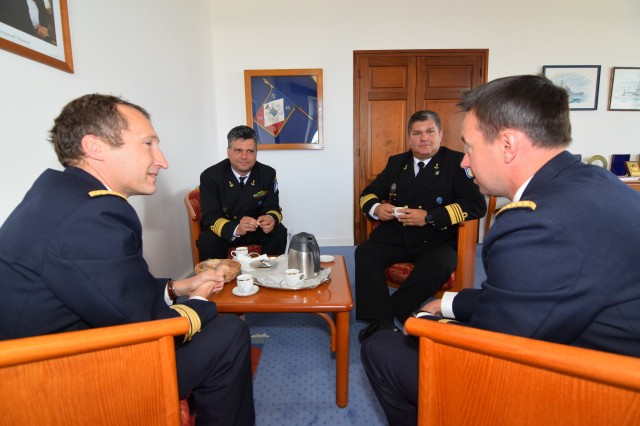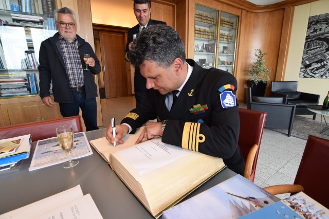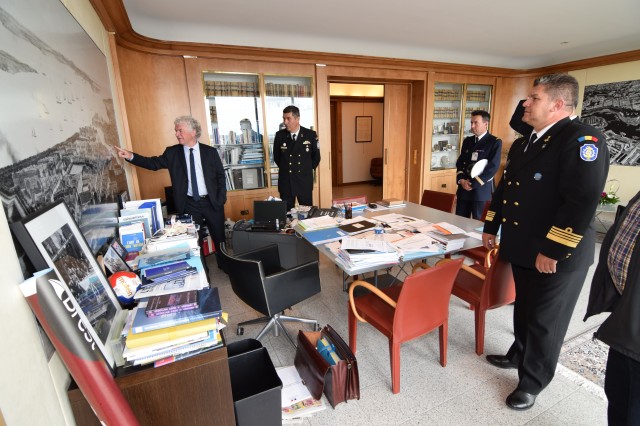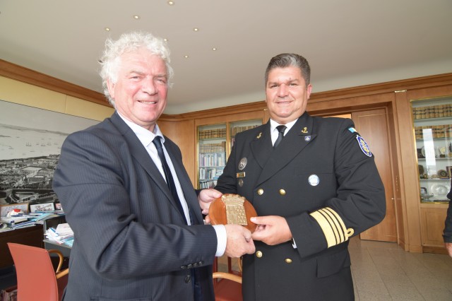 În prima zi a fost oferit și un prânz la bord de către comandantul navei și al marșului gazdelor noastre franceze. Au onorat invitația domnul Francoise Cuillandre, primarul Brestului, domnul Tino Kerdraon, consilier și inițiatorul relațiilor cu România și Constanța, fost deputat, Sylvie Cariou, președinta asociației de înfrățire, Daniel Stoenescu din asociația românilor de aici și desigur, domnul Sorin Moga. A urmat vizita noastră de răspuns la primăria orașului unde domnul primar ne-a primit ca între vechi prieteni. La loc de cinste se afla protocolul de prietenie și de înfrățire a Brestului cu Constanța semnat în 1993, relații cordiale care continuă și în prezent. S-au depănat amintiri, s-au schimbat cadouri simbolice, comandorul Mircea Târhoacă a semnat în cartea de onoare iar domnul primar ne-a adresat invitația oficială de a participa anul viitor cu N.Ș.Mircea la Fete de Brest – Sărbătoarea Brestului.
