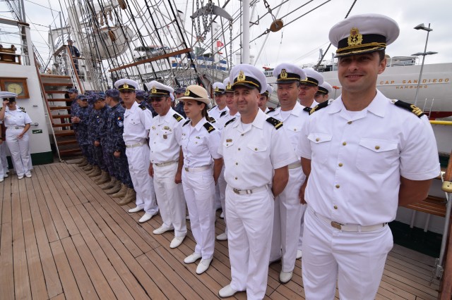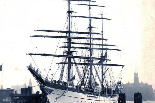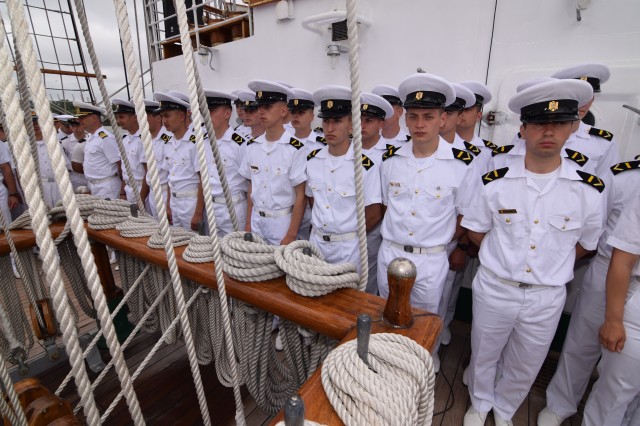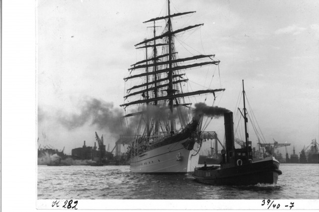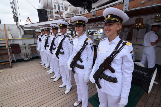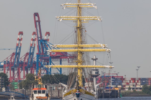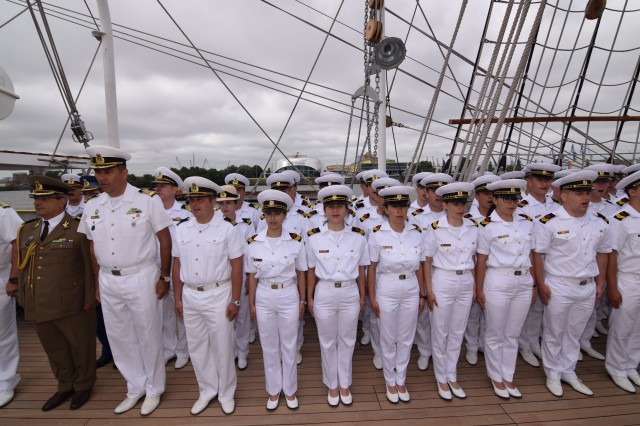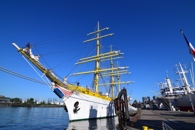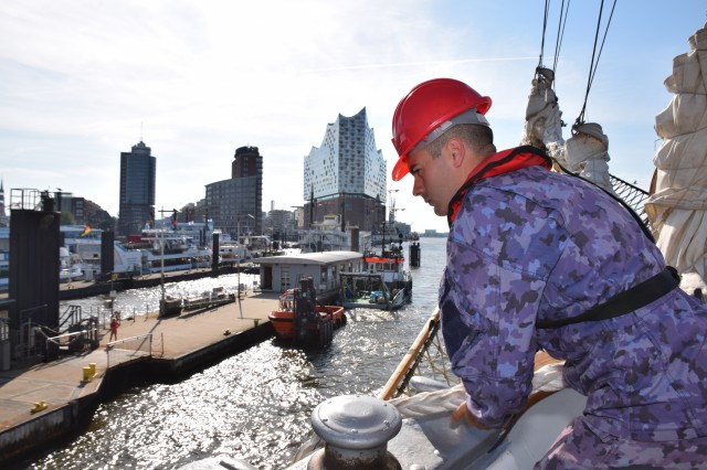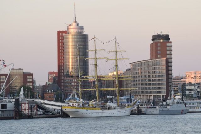 Tot acum au sosit la bord și cei doi cadeți portughezi, Ricardo Chaves și Francisco Marques care vor debarca la Lisabona dar se vor ambarca alți doi, precum și cel turc, Murat Tetik, și a mai rămas ca o singură națiune să fie reprezentată prin cadeți la bord și anume Franța, al cărei reprezentant va urca la bord din Lisabona. Ca o pată de culoare și element inedit trebuie să menționez și faptul că plinurile la alimente și combustibil s-a realizat la Hamburg cu ajutorul ... barjelor, probabil exact ca acum opt decenii. Fiind acostați la un ponton, legat de cheu prin intermediul unei pasarele iar amenajarea urbanistică a falezei Elbei aici în punctul Uberseebrucke nu permite accesul camioanelor, a fost singura modalitate, una firească aici în Hamburg, un oraș brăzdat de numeroase canale, dacă vreți o ”Veneție” a nordului deoarece localnicii se mândresc că este orașul cu cele mai multe poduri din Europa, peste 2000 susțin ei. Așadar, gruiul din tribord a fost folosit pentru ridicarea paleților cu alimente la bord într-o scenă care ne amintea de activitatea de demult a docherilor din port dar repet, absolut firească în peisajul hamburghez cu superba clădire a filarmonicii și vechilor antrepozite – imagine simbol pentru oraș - ca fundal pentru decorul din prova navei.