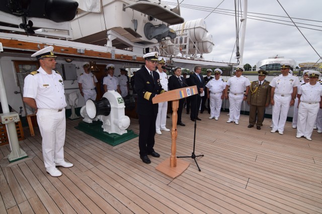 După două zile caniculare vremea a fost închisă în ziua ceremoniei, pe 27 august, la fel ca și cu 80 de ani în urmă dar fără să plouă de data aceasta. La puntea centru (în 1939 toate ceremoniile aveau loc pe dunetă) tot echipajul era adunat în ținuta albă de ceremonie în timp ce se ridica pavilionul, geacul și marele pavoaz și se intonau imnurile Germaniei și României, ultimul cântat cu entuziasm de tot echipajul (doar ca amănunt, în 1938 se intona și imnul nazist Horst Wessel). A urmat primul moment emoționant, atunci când viceamiralul Alexandru Mîrșu, în numele ministrului Apărării Naționale, domnul Gabriel Leș, a înmânat comandantului navei, comandorul Mircea Târhoacă, titlul de ambasador onorific în serviciul României N.Ș.Mircea iar echipajul a răspuns cu trei strigăte puternice de ura care au reverberat până departe pe faleza Hamburgului. Două idei a dorit să sublinieze șeful Statului Major al Forțelor Navale Române în discursul domniei sale: faptul că România este una din puținele țări care dispun de o astfel de navă cu o vechime și tradiție de peste 80 de ani precum și faptul că am ales să marcăm acest eveniment aici la Hamburg cu reprezentanții șantierului unde a fost construit, Blohm&Voss. De asemenea, spiritul Mircea, rolul de ambasador plutitor și caracterul internațional dat de prezența cadeților străini la bord și numeroasele voiaje și escale în porturi străine precum și apropiata circumnavigație au fost alte elemente prezente în discursul viceamiralului Alexandru Mîrșu care a încheiat prin a felicita întreg echipajul. Discursul de răspuns al gazdelor a aparținut viceamiralului Andreas Krause, comandantul Marinei Militare a Germaniei (inspector general al Marinei este funcția oficială) care ne-a urat bun venit în Hamburg și a ținut să reamintească nu doar voiajele comune din ultimii doi ani pentru care a mulțumit marinei române ”din adâncul inimiii” dar și bucuria și analogia pe care a făcut-o cu recentul eveniment de săptămâna trecută când Gorch Fock II a părăsit docul uscat după atâția ani și plutește din nou pe apă chiar dacă lucrările de modernizare vor mai continua. Discursul domniei sale a fost o adevărată pledoarie despre importanța și utilitatea navelor școală cu vele în formarea viitorilor marinari militari și aproape l-a parafrazat (sunt convins că fără intenție ci doar pentru că mesajul este identic pentru orice om al mării) pe contraamiralul Eustațiu Sebastian – ”Numai la bordul navelor cu vele se pot forma adevărații marinari.” Fiind aici la Hamburg, chiar vizavi de șantierul Blohm&Voss, pe velierul unde fiecare din miile de nituri au fost bătute cu mândrie de muncitorii germani într-un timp record și de o calitate, cum altfel decât germană, dovadă că rezistă impecabil după 80 de ani, așadar în mod firesc a ținut un scurt discurs – la fel ca acum opt decenii când la ceremonia lansării la apă era prezent chiar Walter Blohm, directorul de atunci al șantierului - și domnul dr.Ralph Petersen, directorul șantierului Blohm&Voss/Lurssen (din 2016 șantierul este parte a grupului Lurssen dar și-a păstrat numele). Ambasadorul României în Germania, E.S.domnul Emil Hurezeanu, care s-a aflat pentru prima dată la bordul navei a luat cuvântul în încheiere și a mulțumit pentru șansa de a putea fi prezent la bord cu ocazia celei de a 80-a aniversări și, glumind, a acceptat provocarea de a avea de acum înainte un nou competitor în diplomație, de azi N.Ș.Mircea devenind oficial ambasador onorific în serviciul României.