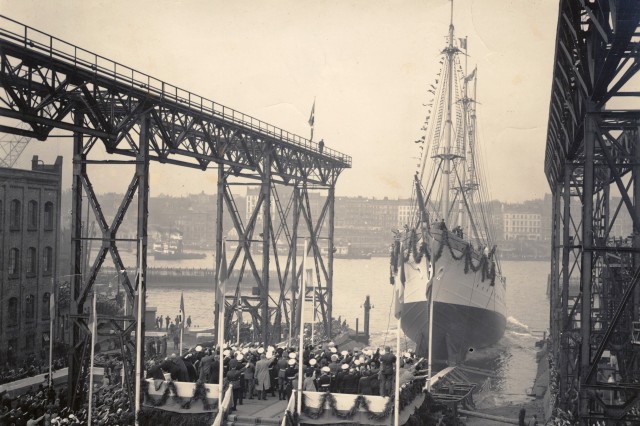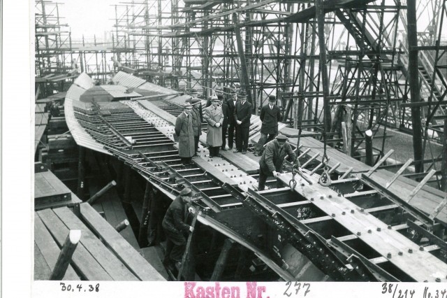 Cu două șalupe puse la dispoziție de gazde traversăm Elba cea tulbure și pe un canal îngust intrăm pe teritoriul șantierului Blohm&Voss de azi, cu steagul României arborat la intrarea în șantier, locul unde N.Ș.Mircea a prins viață în mai puțin de un an. Contractul a fost semnat pe 26 ianurie 1938, lucrările au început pe 15 aprilie, aproape șase luni mai târziu avea loc lansarea la apă pe data de 22 septembrie iar predarea navei comandorului August Roman, ofițerilor și echipajului român, după probele de mare, a avut loc pe data de 25 ianuarie, preluarea definitivă a comenzii și ceremonia ridicării pavilionului național la bord desfășurându-se pe 27 martie (recordul timpului de construcție la navele surori aparține însă primului Gorch Fock – după planurile ușor modificate ale acestuia a fost construit și Mircea - care a fost finalizat în doar 100 de zile, se întâmpla imediat după catastrofa navei școală cu vele Niobe care s-a scufundat în Marea Baltică la ancoră, fără supraviețuitori, iar marina germană dorea o nouă navă școală, nescufundabilă dar care să fie gata pentru promoția de anul următor, pariu câștigat de șantier). Gazdă ne-a fost tot domnul dr.Ralph Peterson care ne-a prezentat șantierul în sala de conferințe – pe fereastră se vedea locul unde a fost construit Mircea, lângă uriașul iaht Octopus aflat în doc plutitor, pentru că șantierul construiește și repară o varietate de nave, comerciale, militare (corvete și fregate), iahturi. A urmat un schimb de cadouri simbolice între cele două delegații iar viceamiralul Alexandru Mîrșu, șeful Statului Major al Forțelor Navale a oferit șantierului macheta N.Ș.Mircea, poate pentru a sta alături de cea a primului Gorch Fock care te întâmpina pe scările de la intrare. Gazdele au fost pregătite, ne-au aranjat chiar o miniexpoziție cu fotografii din perioada construcției N.Ș.Mircea și ne-au oferit și o vizită într-una din halele de producție, o clădire originală din 1906 dar modernizată la standardele de azi precum și un tur la una din cele două moderne fregate din clasa 125, Rheinland-Pfalz (F 225), a doua era Sachsen-Anhalt (F 224), aflate în faza de recepție și probe de mare, foarte moderne.