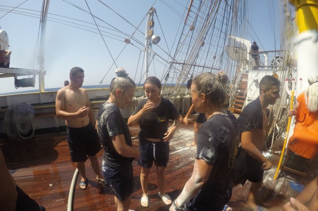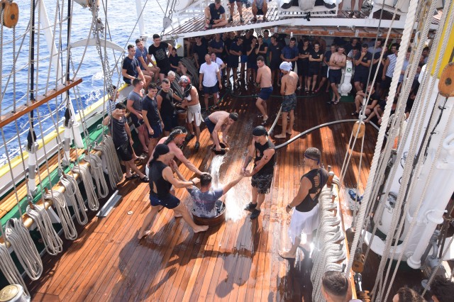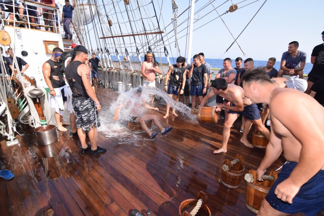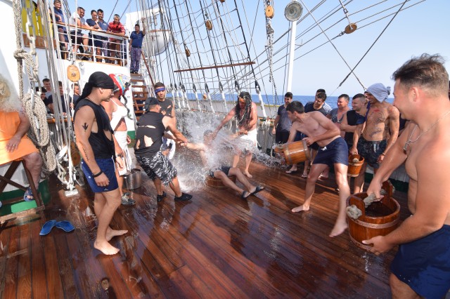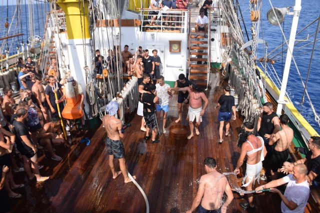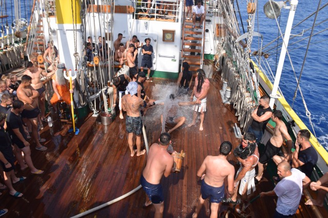 Două ore de distracție, veselie, soare și apă de mare, cu alte cuvinte botezul marinăresc pentru cadeții anului 2019 de pe nava-școală „Mircea”. S-a întâmplat în mijlocul Mării Ionice, în drum spre ultima noastră escală de la Istanbul din marșul istoric, la 80 de ani de la intrarea în serviciu.