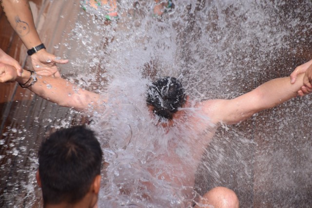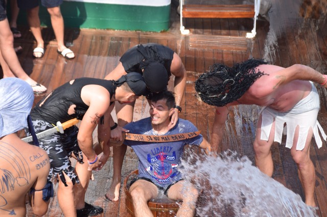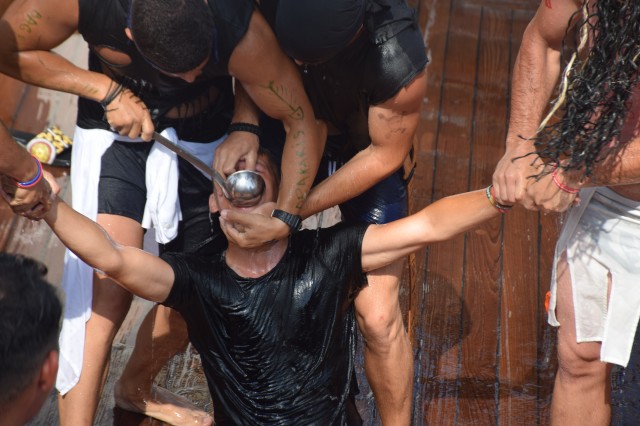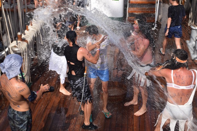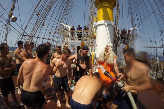 Toți cei nebotezați până acum de Zeul Neptun, studenți, elevi sau membri ai echipajului au avut ”norocul” să treacă prin ”supliciile” nimfelor și piraților, foarte hotărâți de altfel să nu ierte pe nimeni, Cei care nu s-au prezentat la chemarea zeului au fost aduși pe sus de către ”comandourile” organizate de pirați. Apă de mare, ghiordele, furtunul de incendiu, cocktailul, realizat special din detergent de vase, vaselină, rumeguș și făină, iată câteva dintre ingredientele folosite de pirați pentru a-i chinui pe marinari. A rezultat o scenografie aproape cinematografică și câteva imagini chiar surprinzătoare pentru cei botezați. Au trecut pe la cazanul de botez toți elevii și studenții, inclusiv toate fetele, fără discriminări, toți cadeții străini, precum și membrii mai noi ai echipajului.