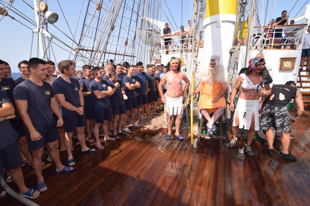 În mijlocul Mării Ionice, la bordul navei-școală „Mircea”, Zeul Neptun și-a făcut apariția, pentru a vedea cine sunt ”intrușii” și pentru a-i boteza pe ”păcătoșii” pretendenți la statutul de marinar adevărat, cei care au avut îndrăzneala să-i tulbure apele, nu doar ale Mediteranei, ci și ale Atlanticului. Neptun a venit însoțit de nimfele sale și de pirați și, în scurt timp, s-a dezlănțuit botezul marinăresc la puntea centru a navei.