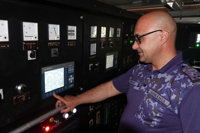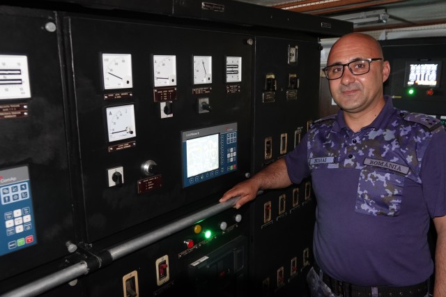 La intrarea în sala motoarelor, șeful mecanic, căpitanul Daniel Ioachim, ne întâmpină protocolar și simțim imediat că intrăm în lumea unei caste aparte. Din anul 2011, este membru al echipajului puitorului de mine și plase cu număr de bordaj 274, iar cei nouă ani petrecuți la bord fac ca tânărul de 33 de ani să fie un militar de bază al navei. „Sunt pasionat de motoare și mi-am pus cunoștințele și chiar sufletul la bătaie, când a început modernizarea puitorului. Nu regret decizia luată, pentru că am putut vedea, pe timpul misiunii, cum s-a comportat întregul angrenaj de propulsie. Asta a fost și una dintre marile provocări, pe care cred că toți colegii mei din serviciul de luptă electromecanic au avut-o, din luna ianuarie și până acum.