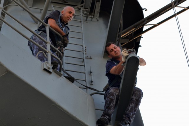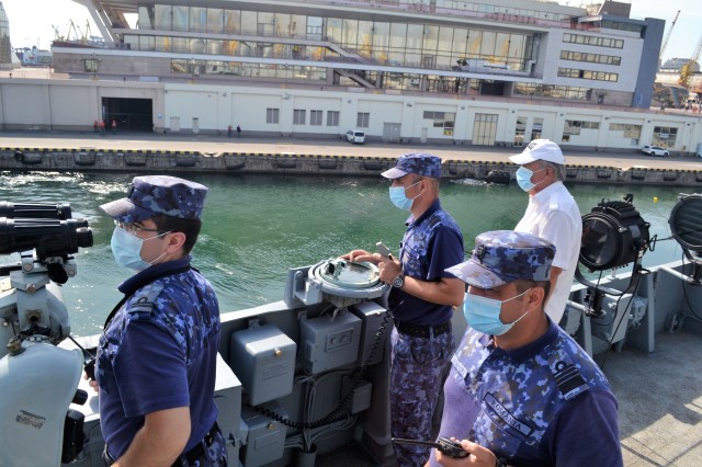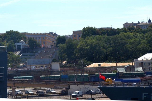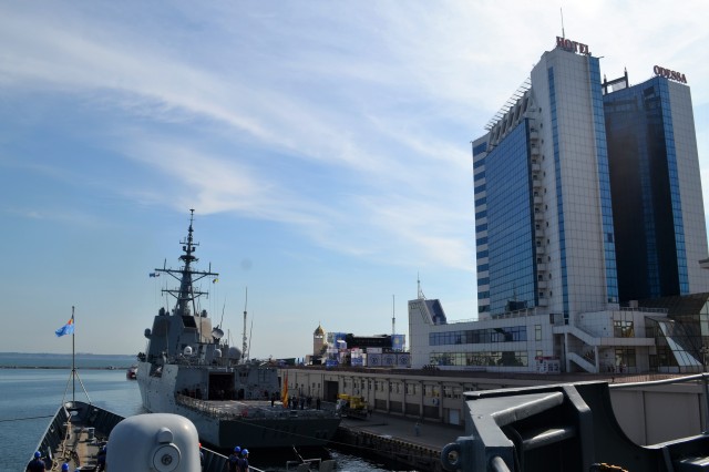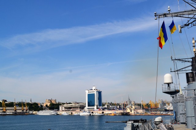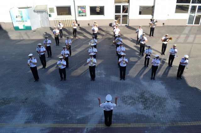 Spre seară, muzica militară a Forţelor Navale ale Ucrainei i-a încântat pe marinarii noştri cu o suită de melodii ce a atras ropote de aplauze din partea echipajului românesc, ce tocmai îşi încheiase munca şi a mai îndulcit absenţa învoirilor la uscat. Navele grupării NATO, acostate la gara internaţională din portul Odessa, au atras multe priviri ale ucrainenilor ce au venit în număr mare să le admire.